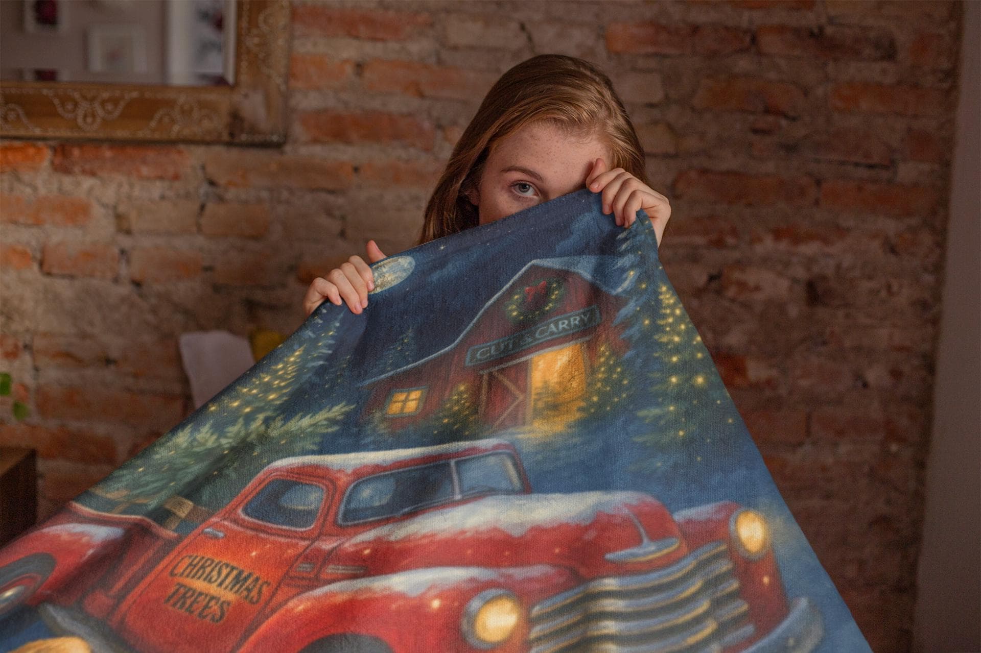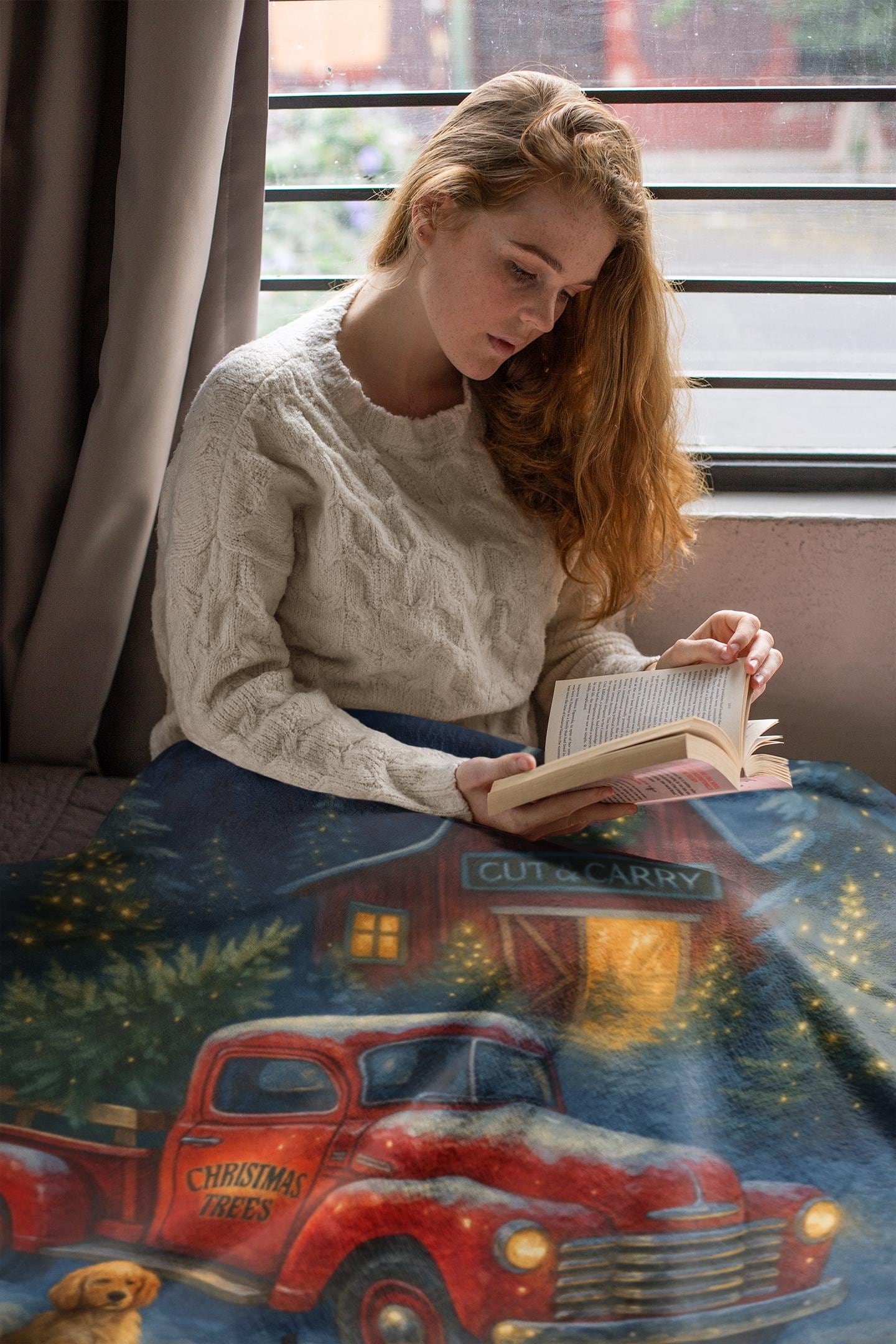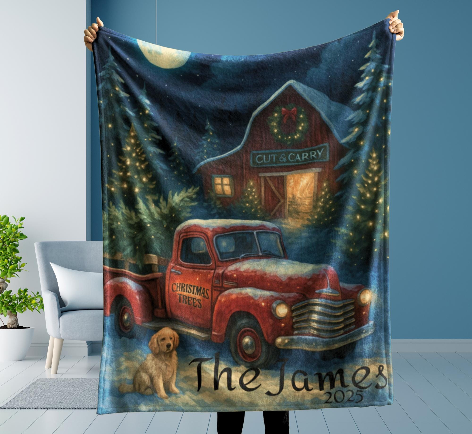 Wrap yourself in nostalgic holiday charm with our Christmas Tree Farm at Night Blanket – the perfect addition to your winter décor or a heartfelt personalized gift for the season. Featuring a glowing red barn, twinkling lights, snow-covered trees, and a classic vintage red truck under a peaceful night sky, this cozy throw adds warmth and personality to your holiday home.