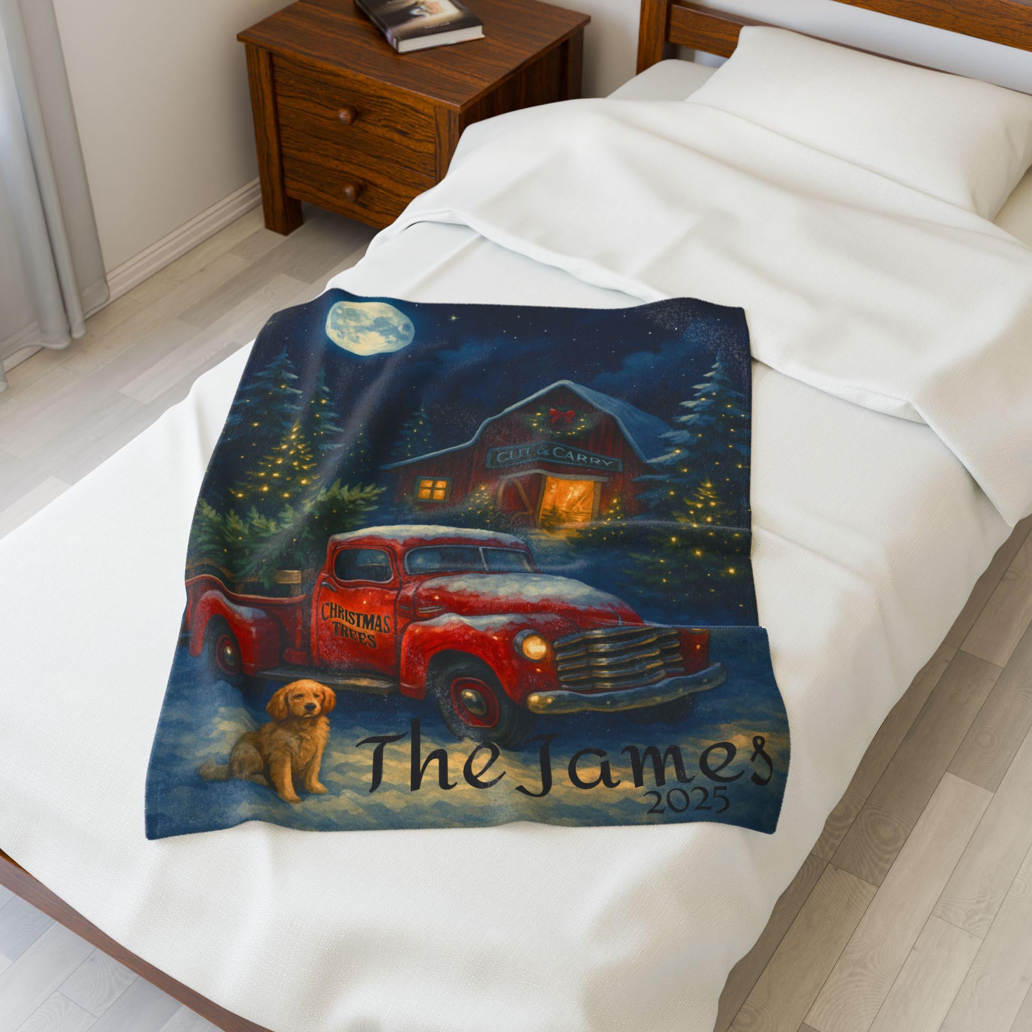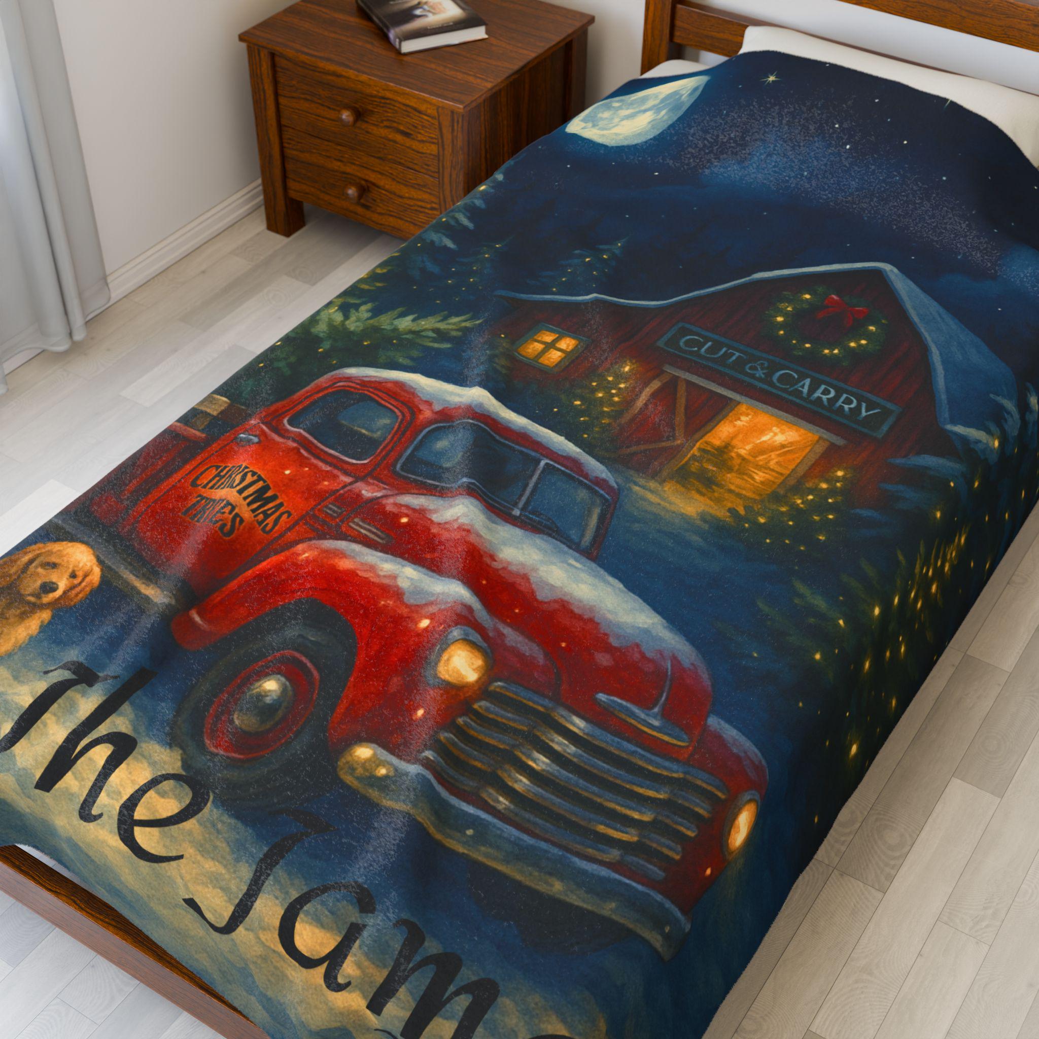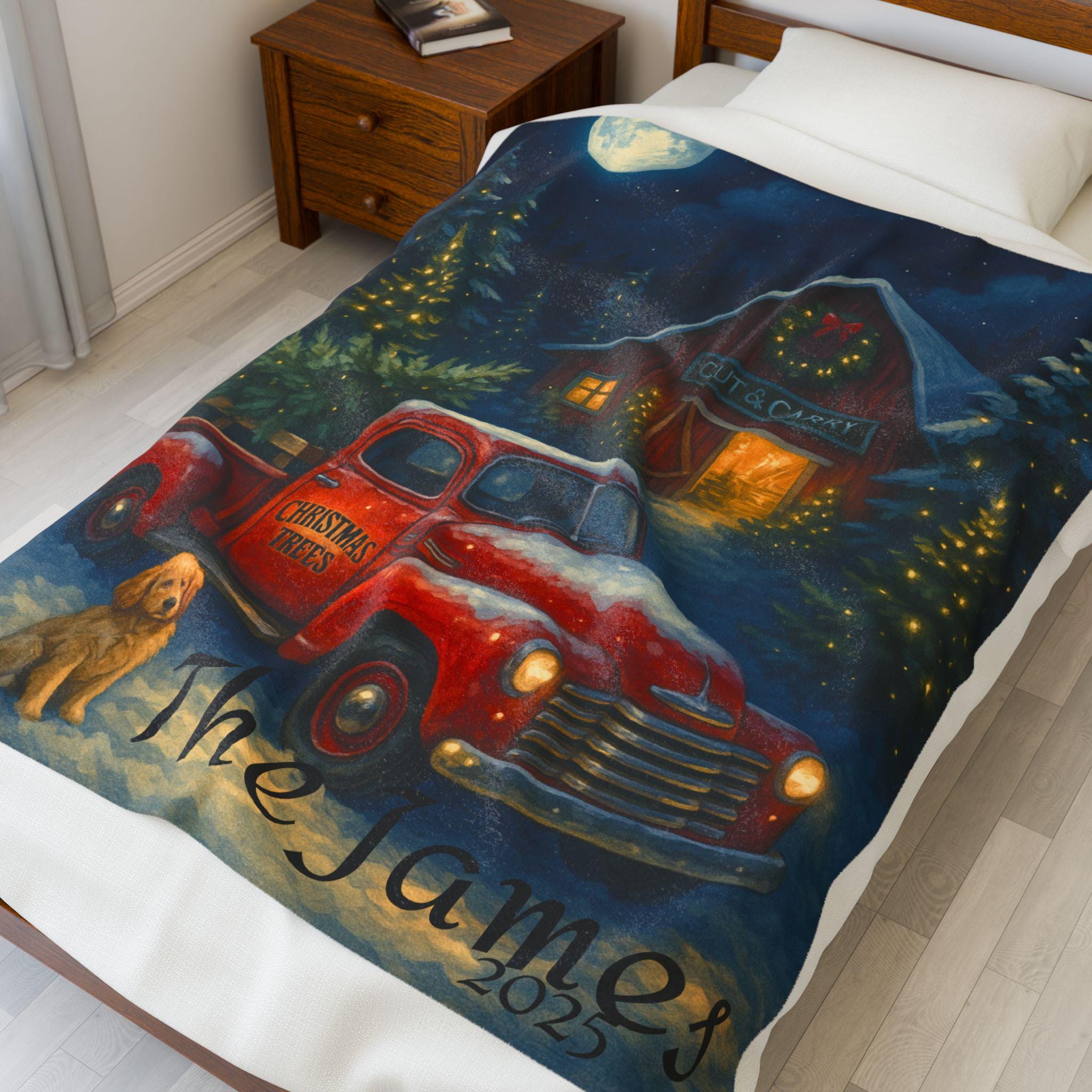 Wrap yourself in nostalgic holiday charm with our Christmas Tree Farm at Night Blanket – the perfect addition to your winter décor or a heartfelt personalized gift for the season. Featuring a glowing red barn, twinkling lights, snow-covered trees, and a classic vintage red truck under a peaceful night sky, this cozy throw adds warmth and personality to your holiday home.