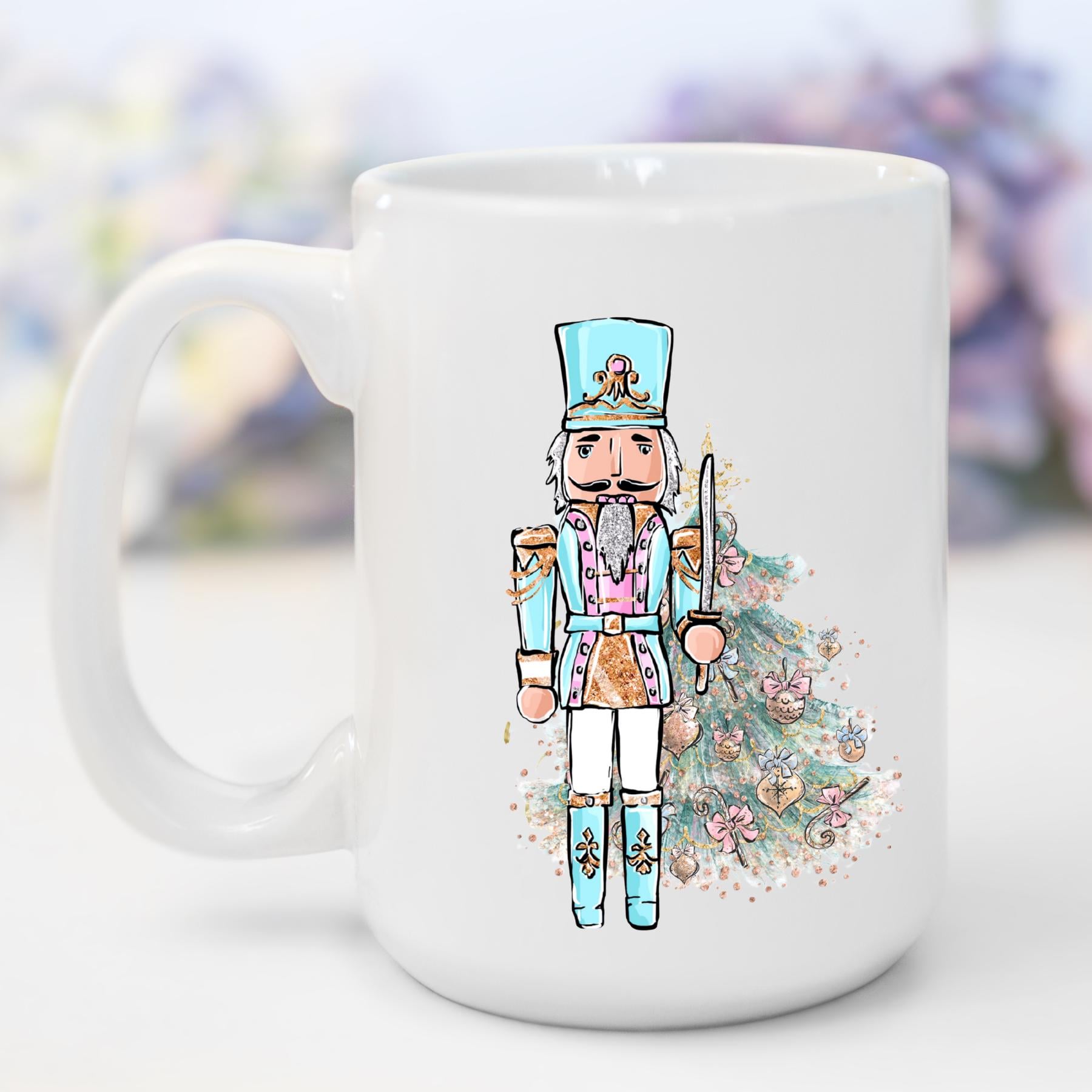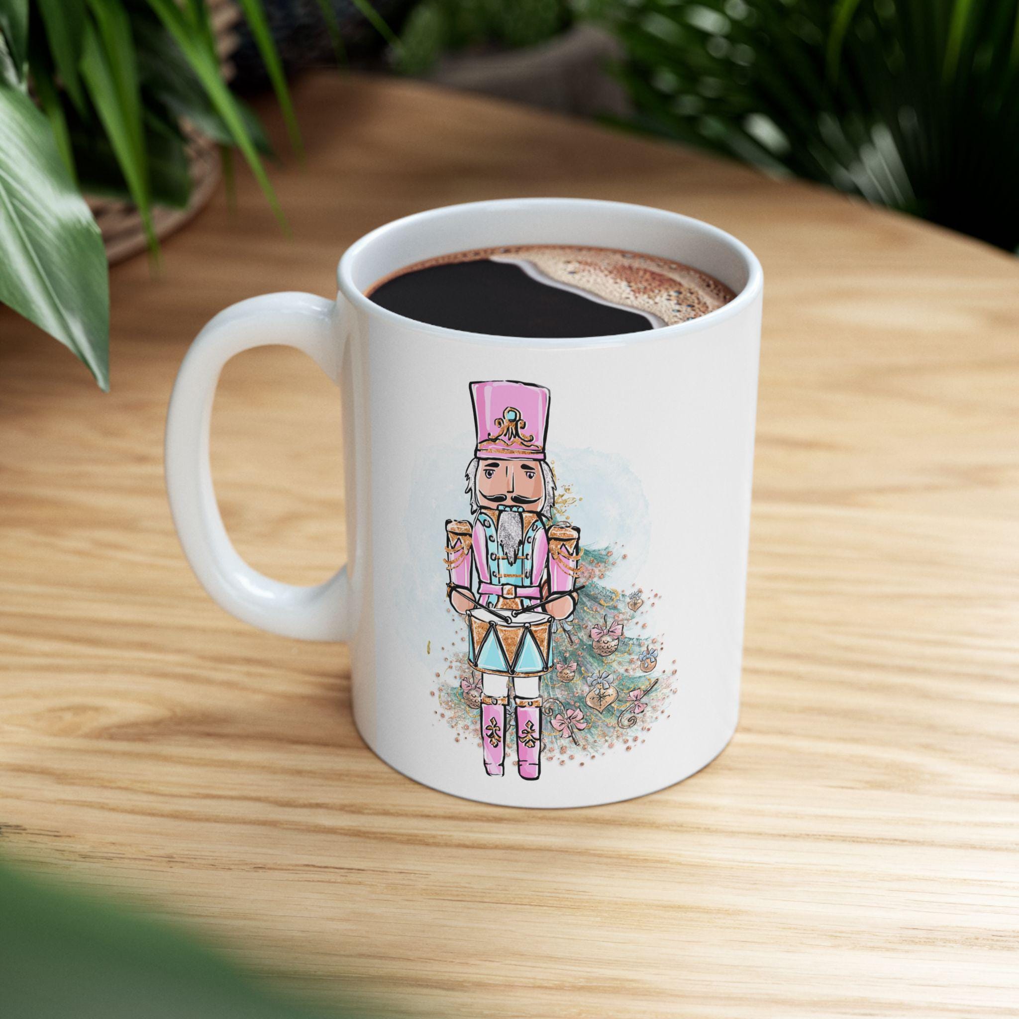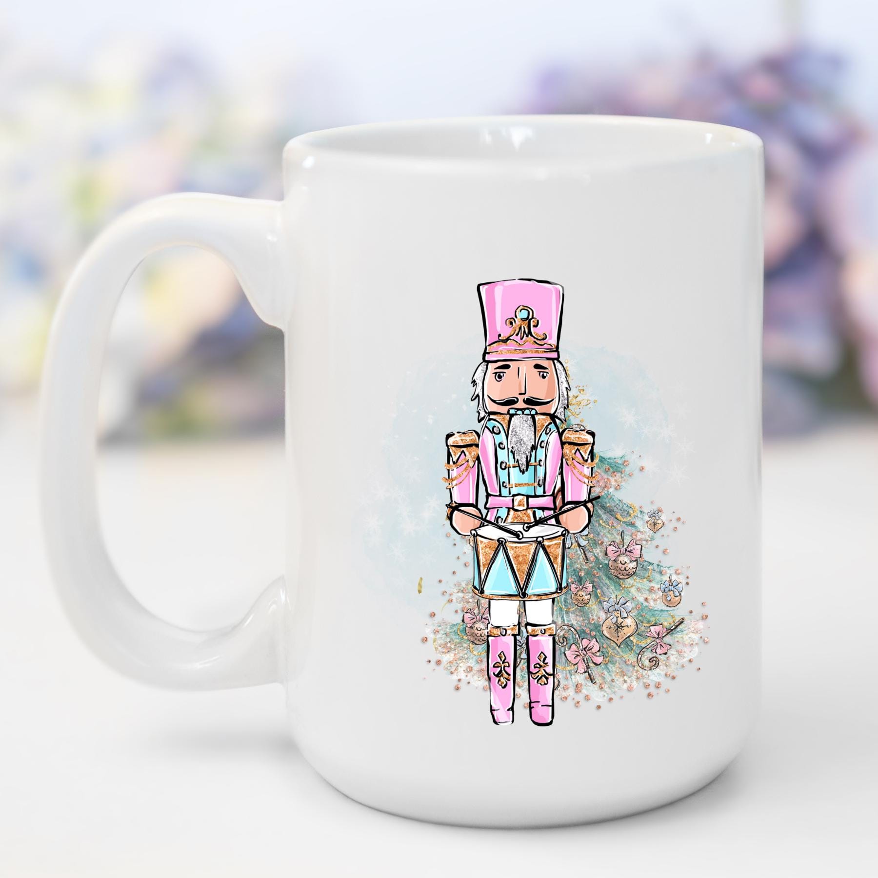 Each mug is crafted from durable white ceramic with a glossy finish, showcasing the delicate pink nutcracker design in vivid detail. Choose between 11oz or 15oz sizes to suit your favorite hot drink, from coffee and cocoa to spiced tea.