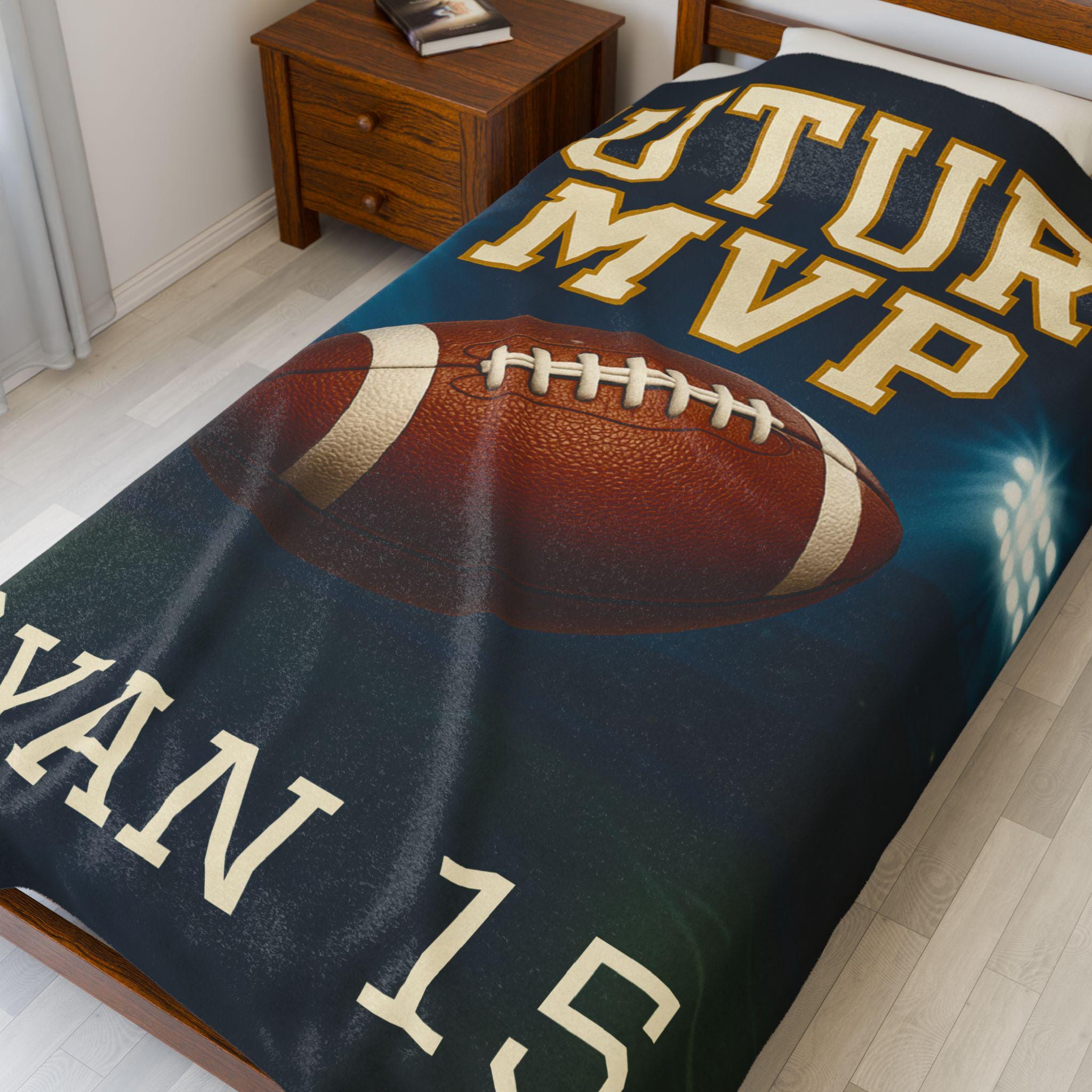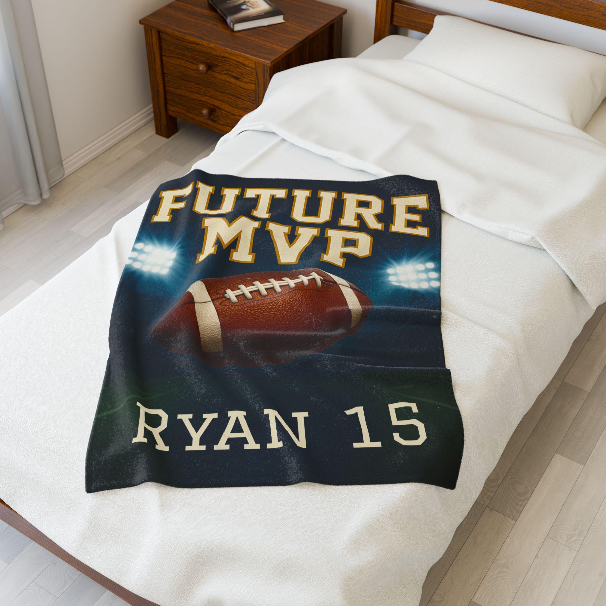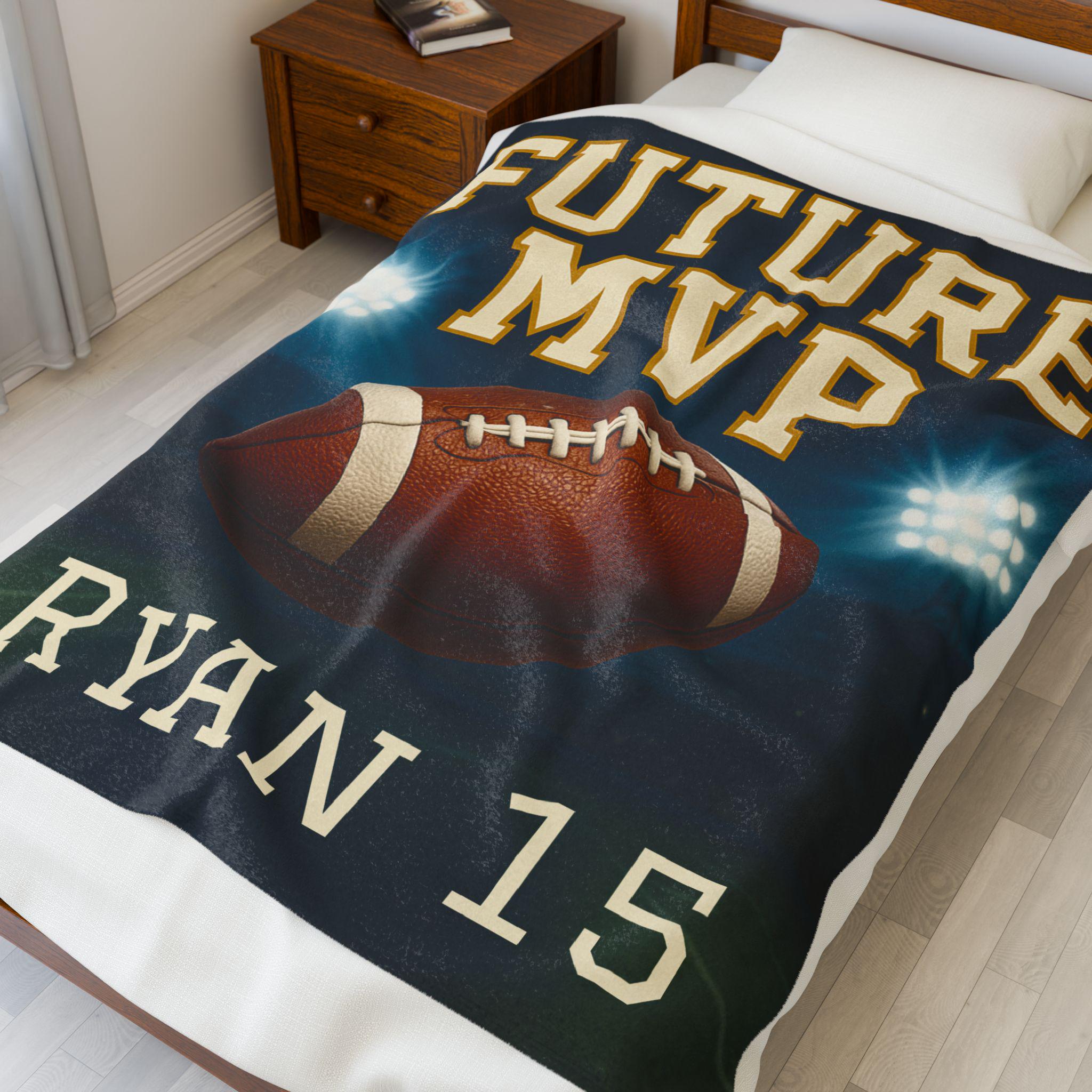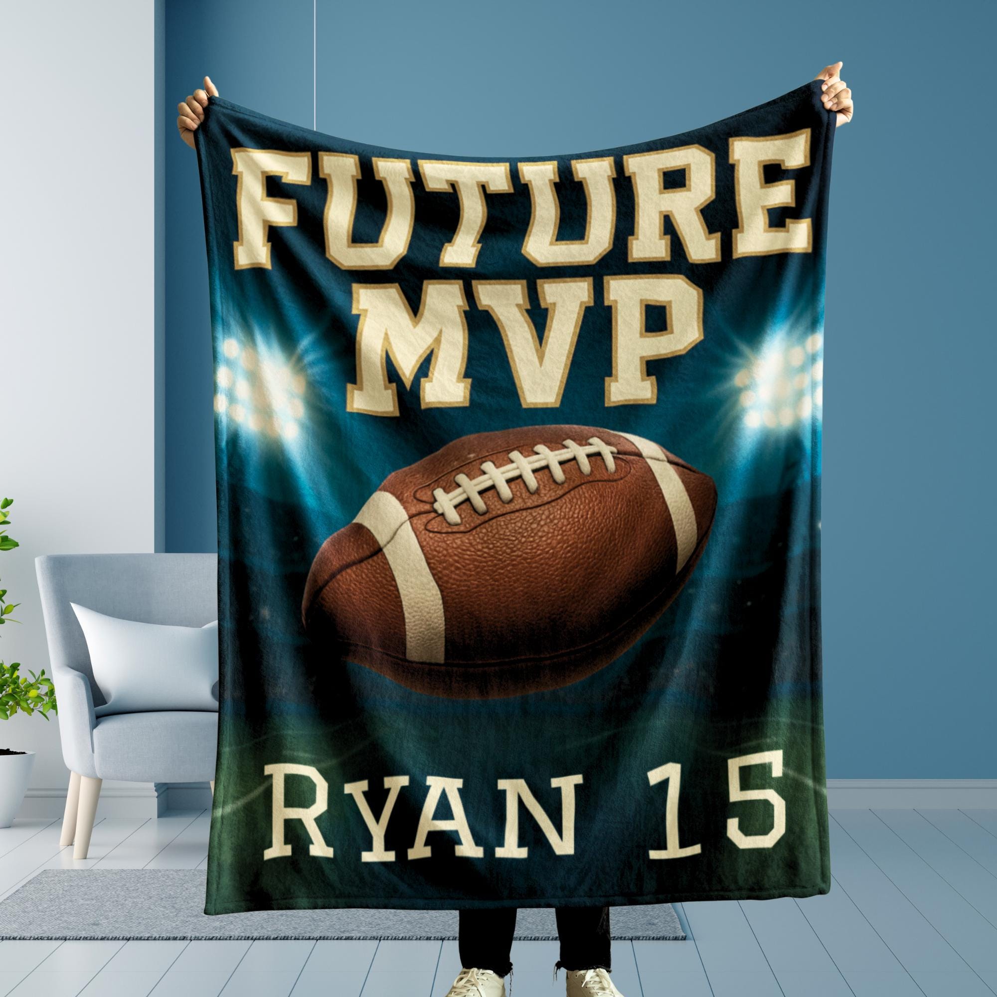 Give your rising star the spotlight with this personalized Future MVP Football Blanket. Designed with a realistic football, stadium lights, and bold jersey-style lettering, this blanket brings all the excitement of game day into your home.