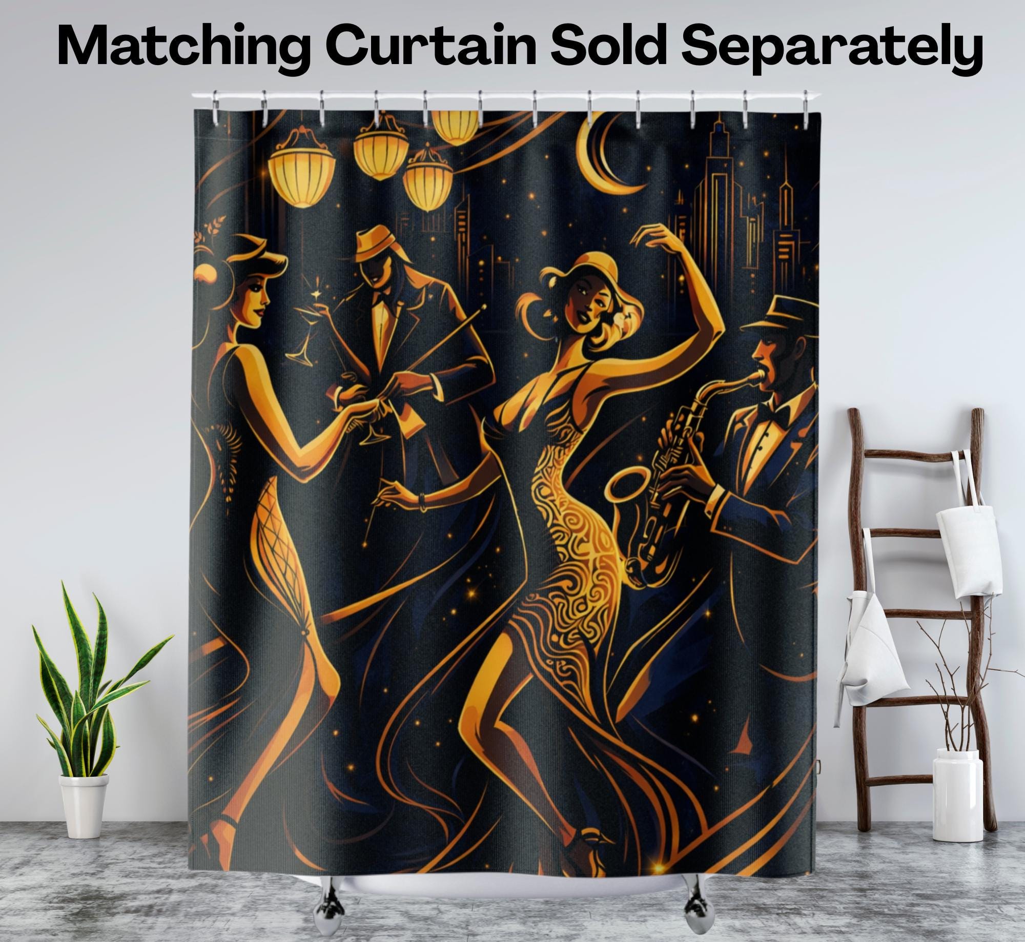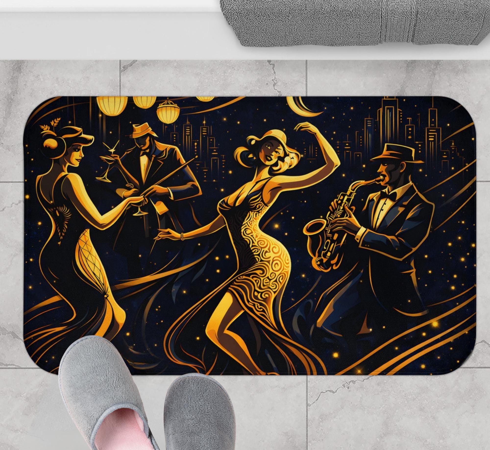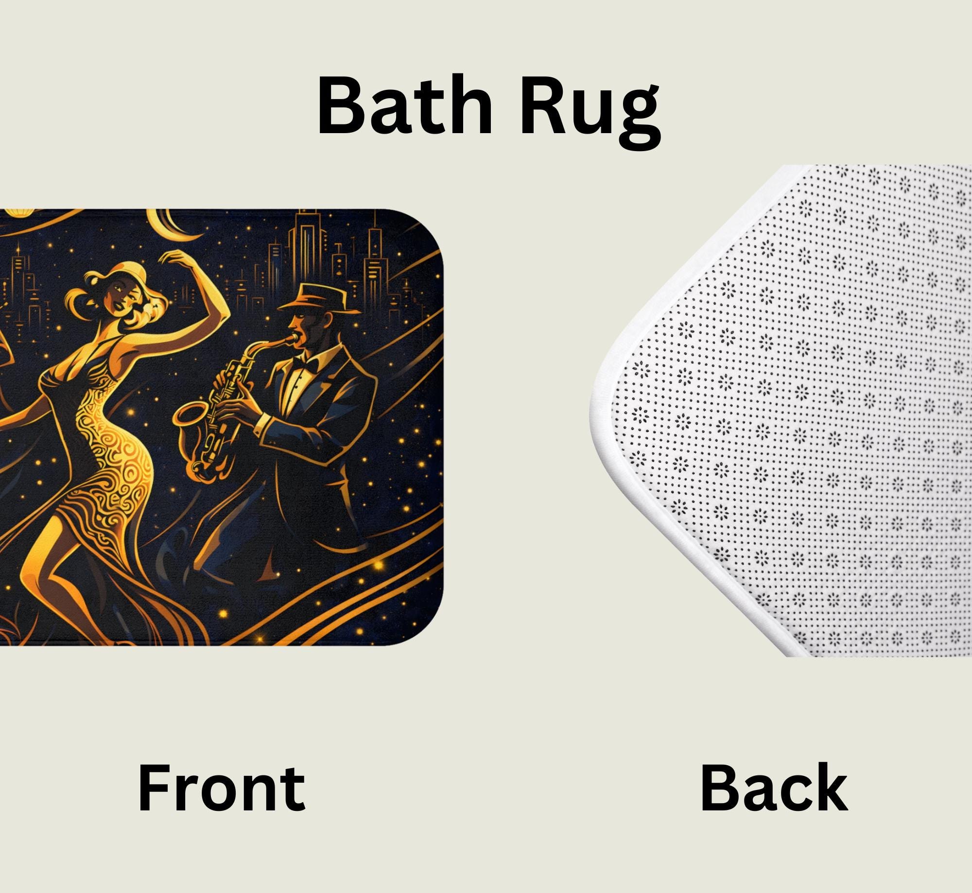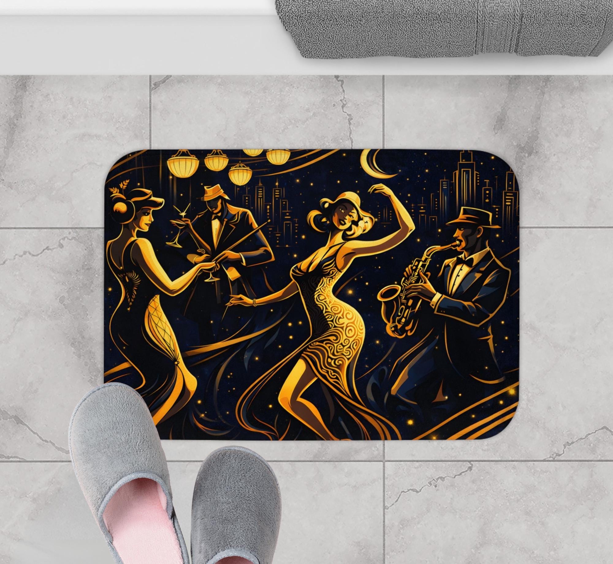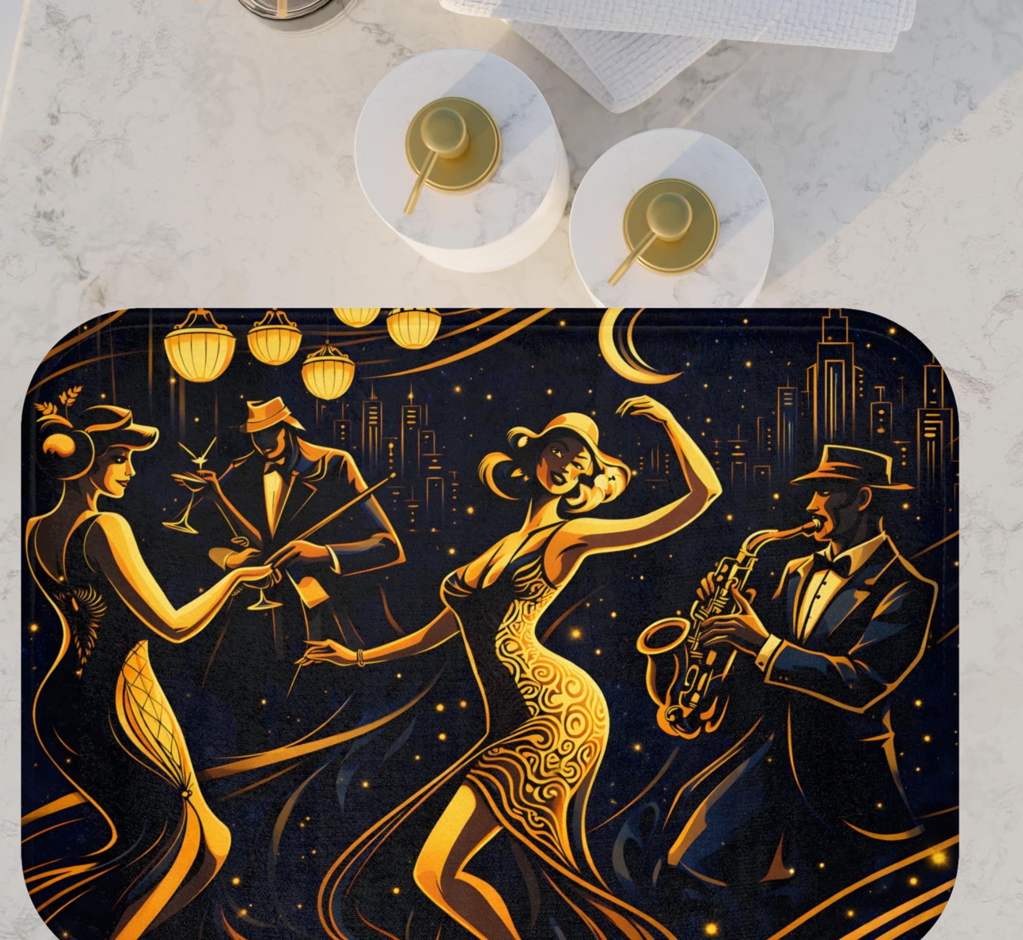 Elevate your bathroom with this Art Deco City Glam bath mat, inspired by the energy and elegance of 1920s jazz lounges and vintage city nightlife.