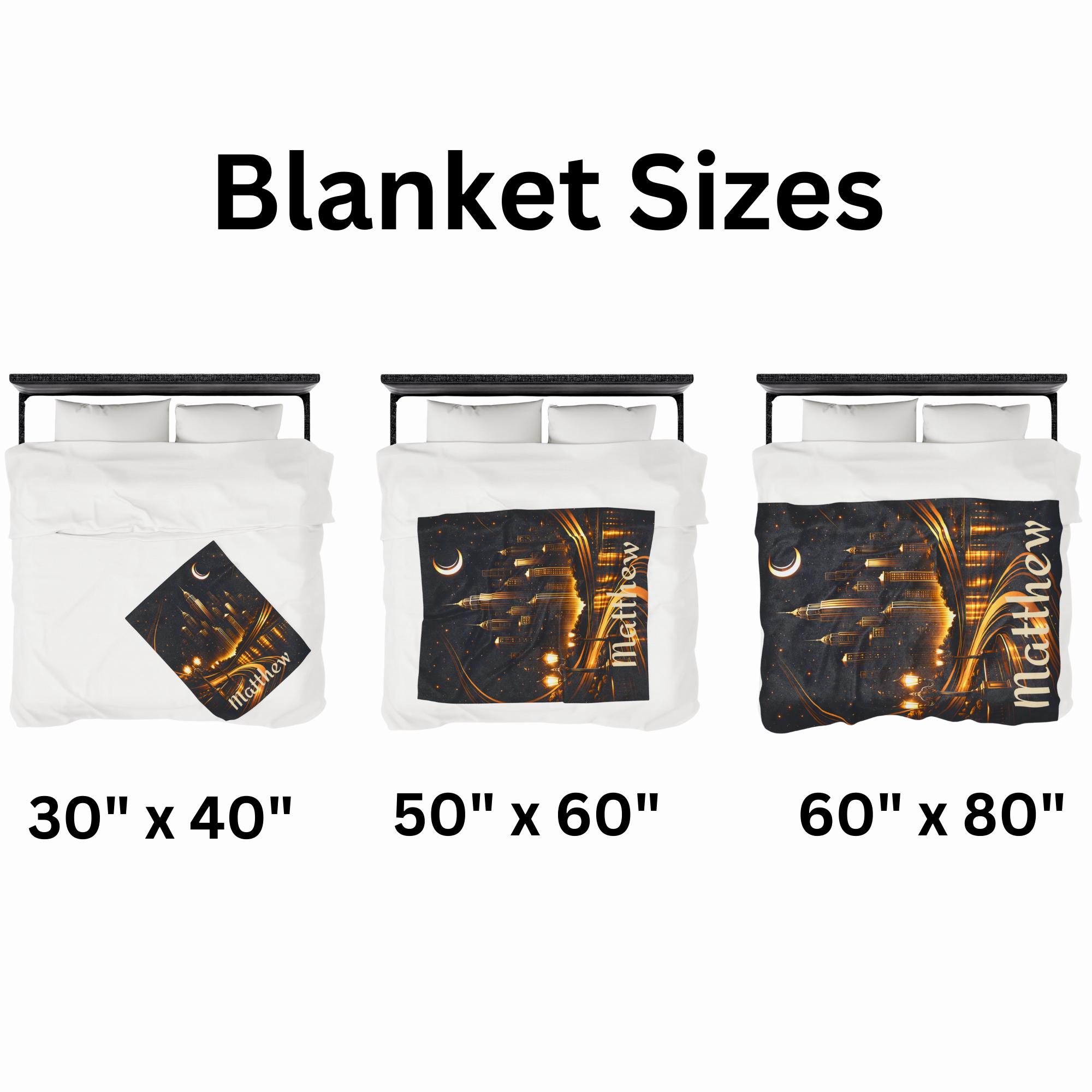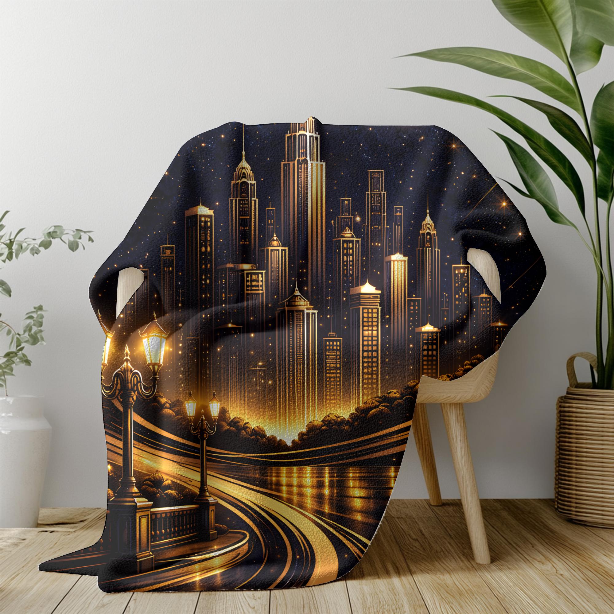Inspired by vintage Art Deco architecture and classic city silhouettes, this plush velveteen blanket features striking gold linework against a deep navy night sky. The tall skyline composition creates a dramatic, architectural look that feels refined, timeless, and intentionally styled.