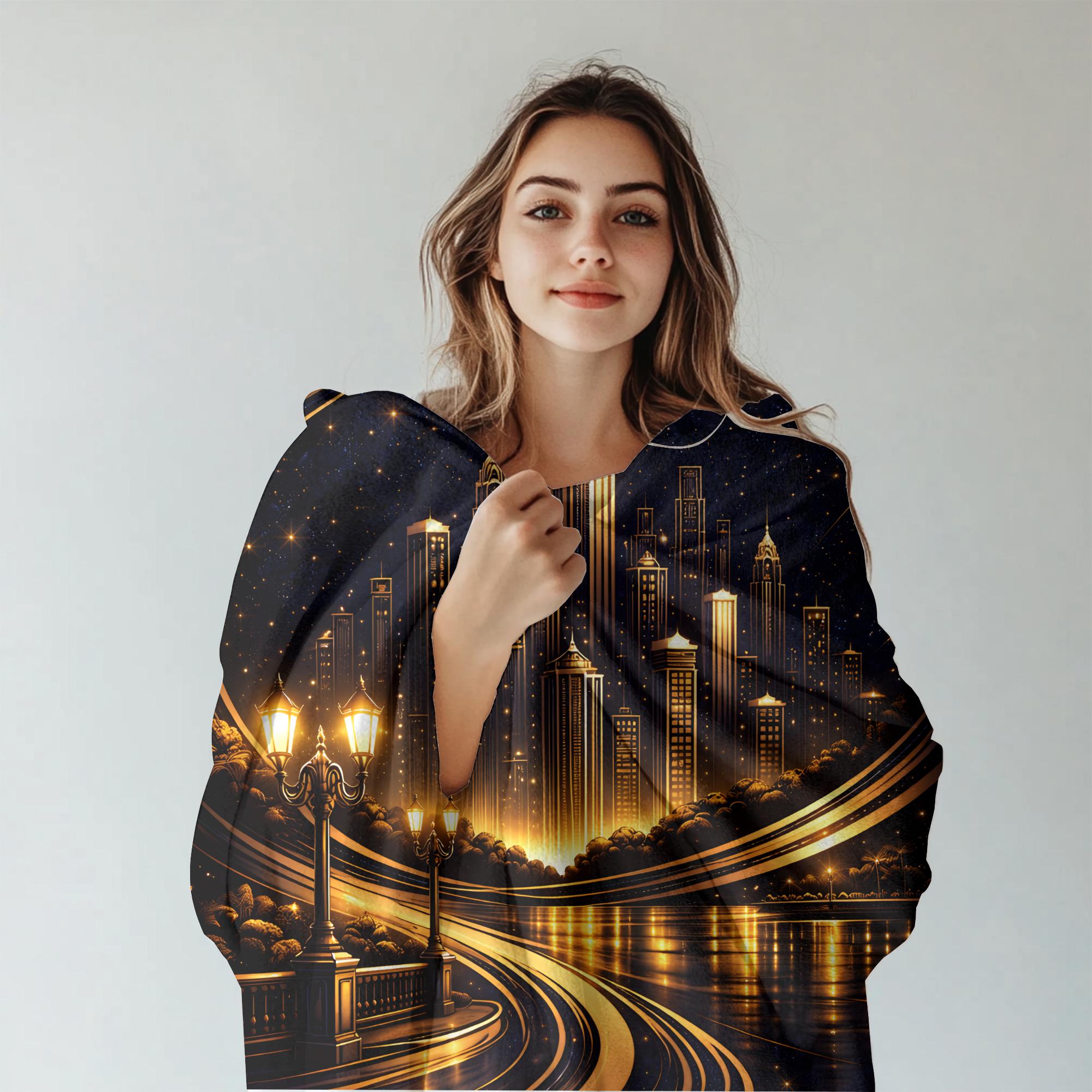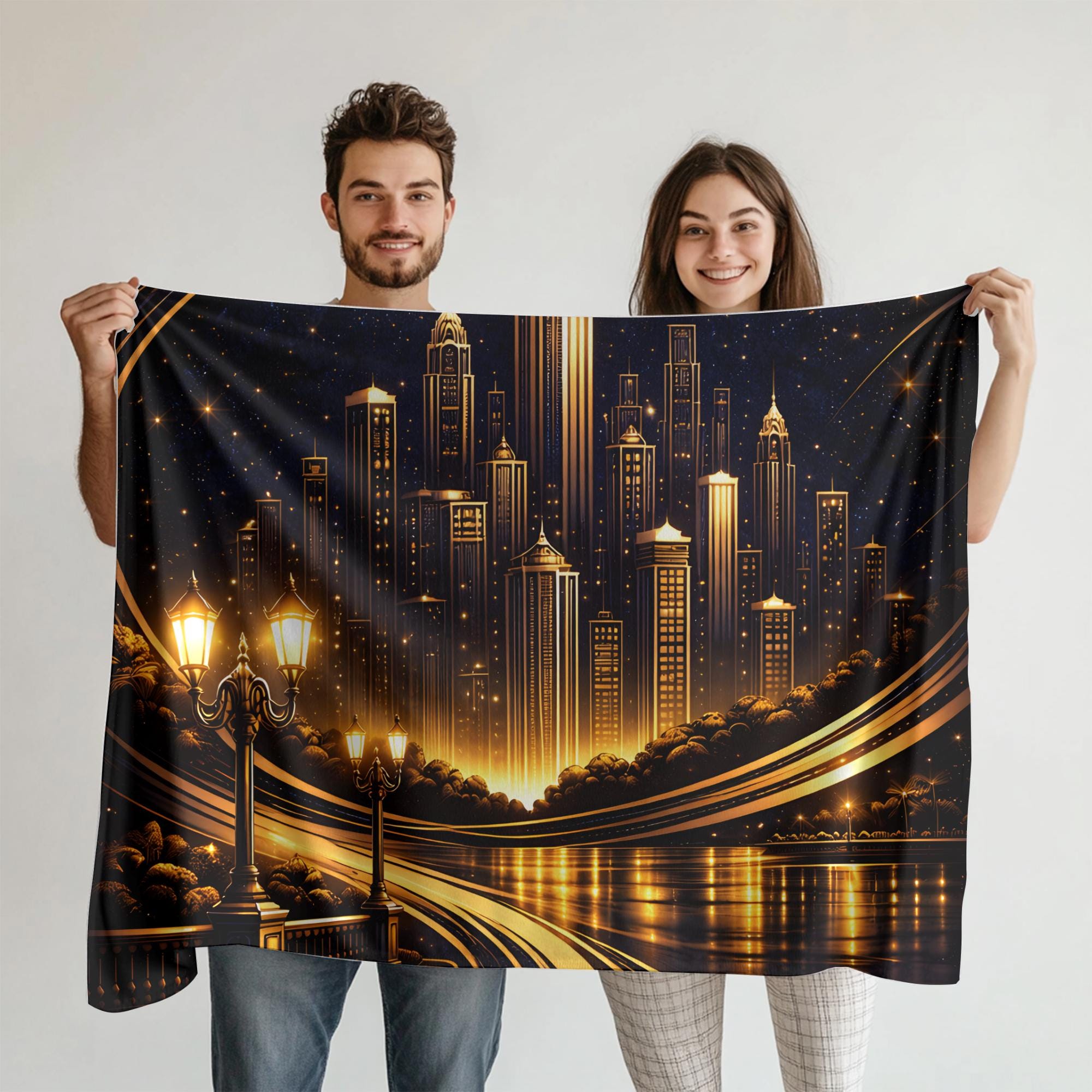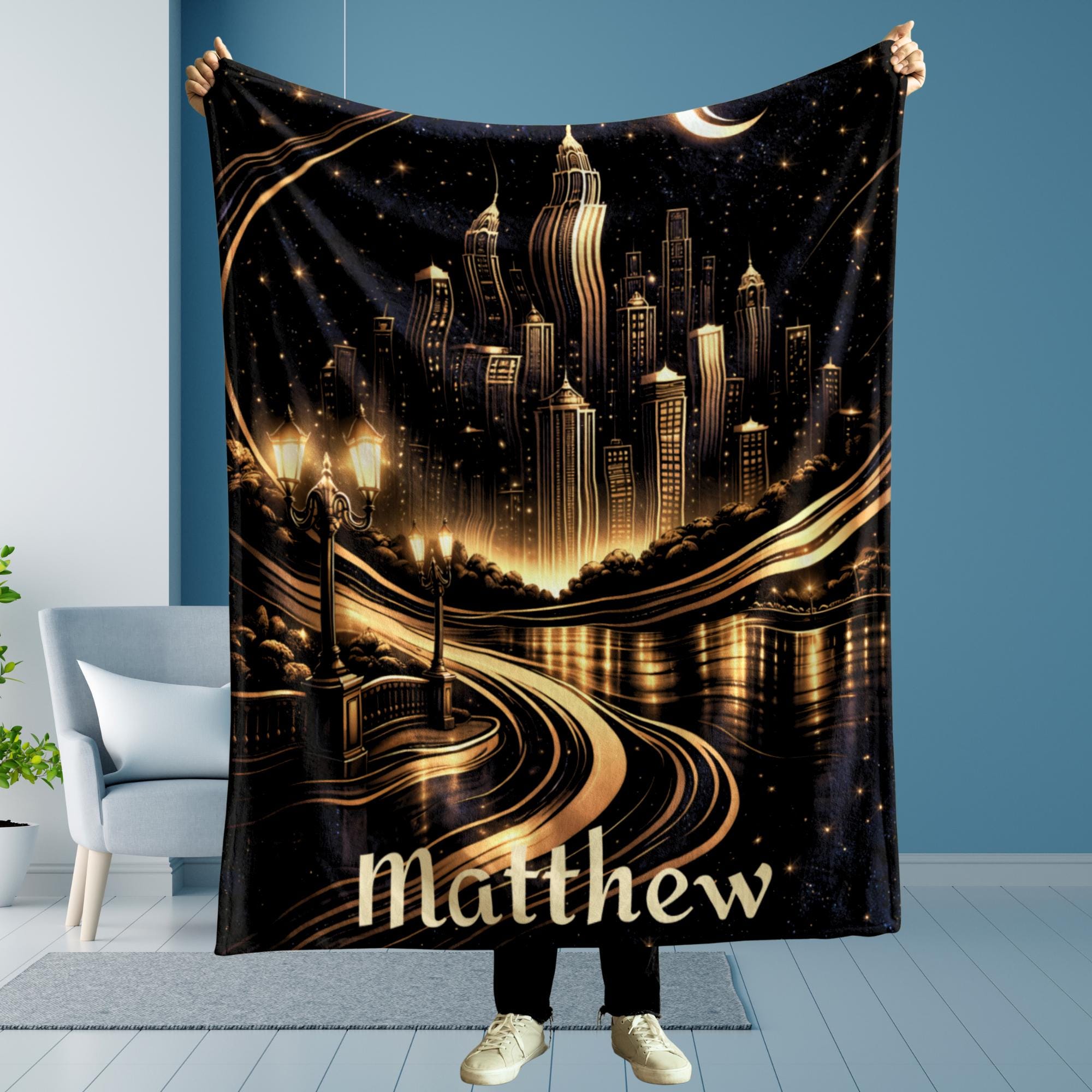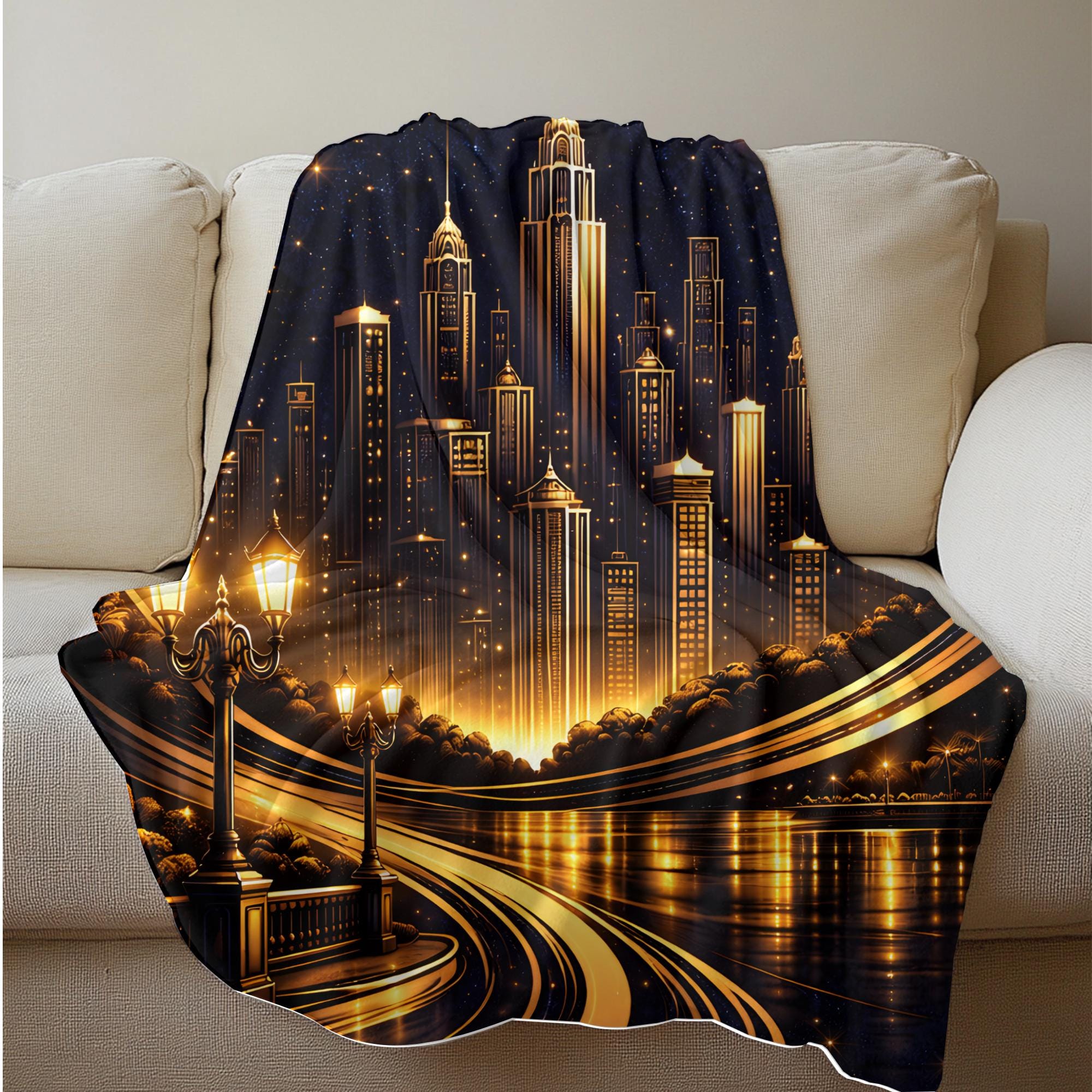 Add a bold, sophisticated statement to your space with this personalized Art Deco city skyline blanket, designed for modern homes and masculine interiors.