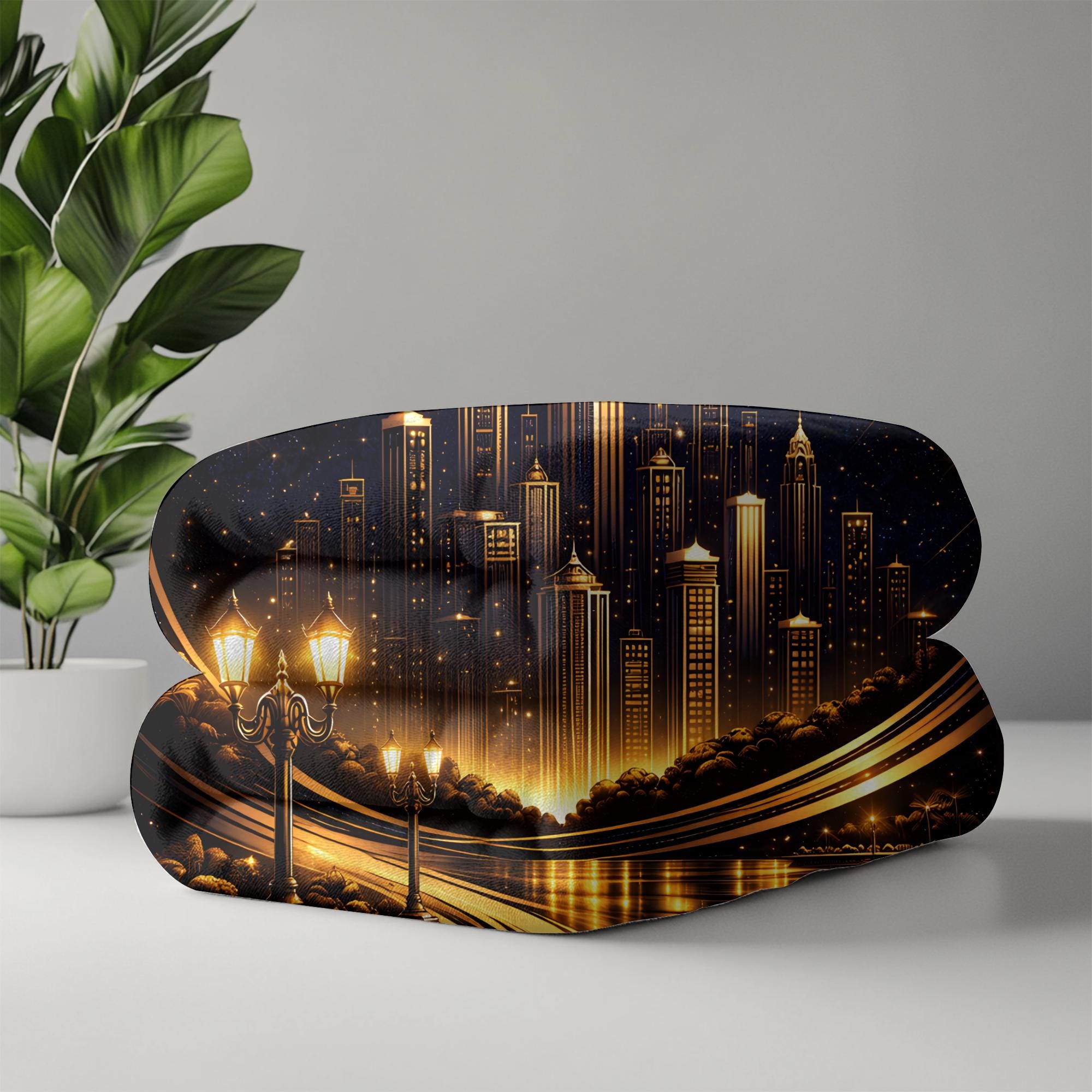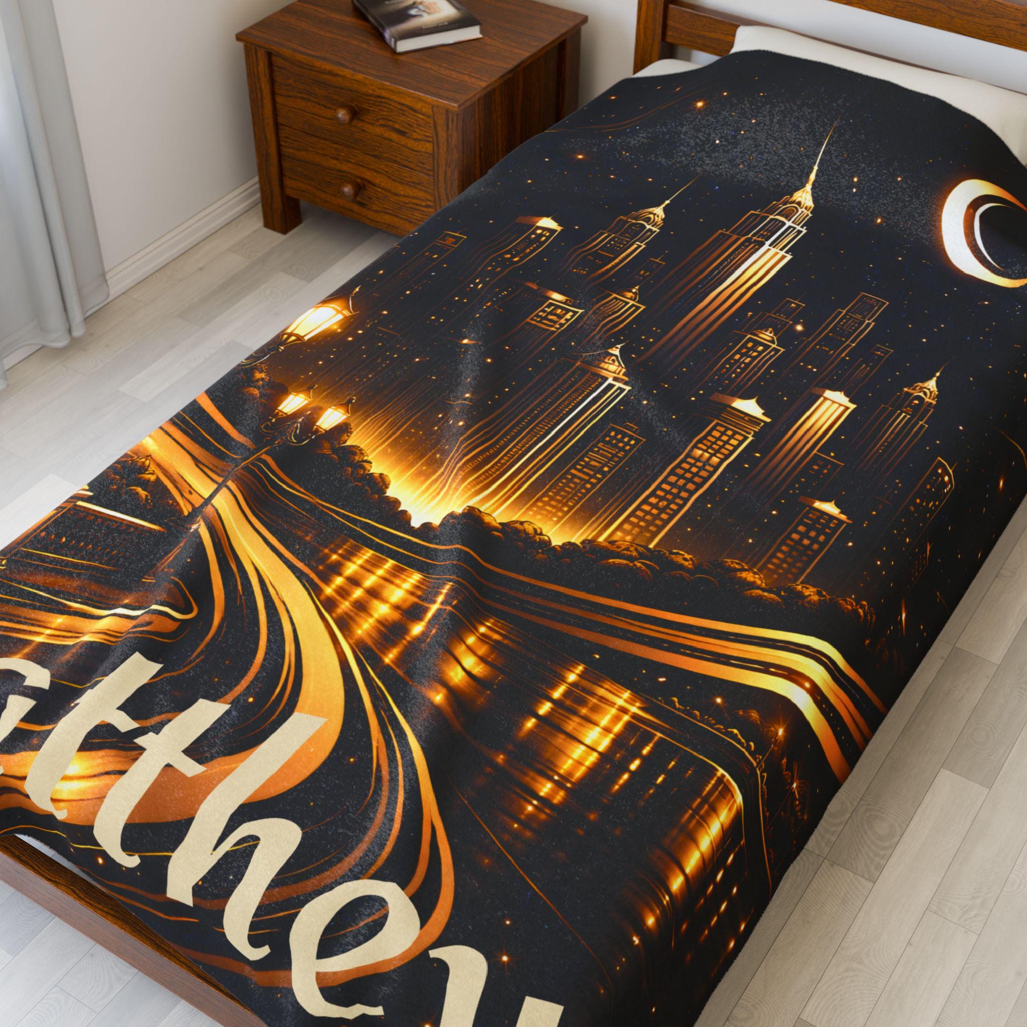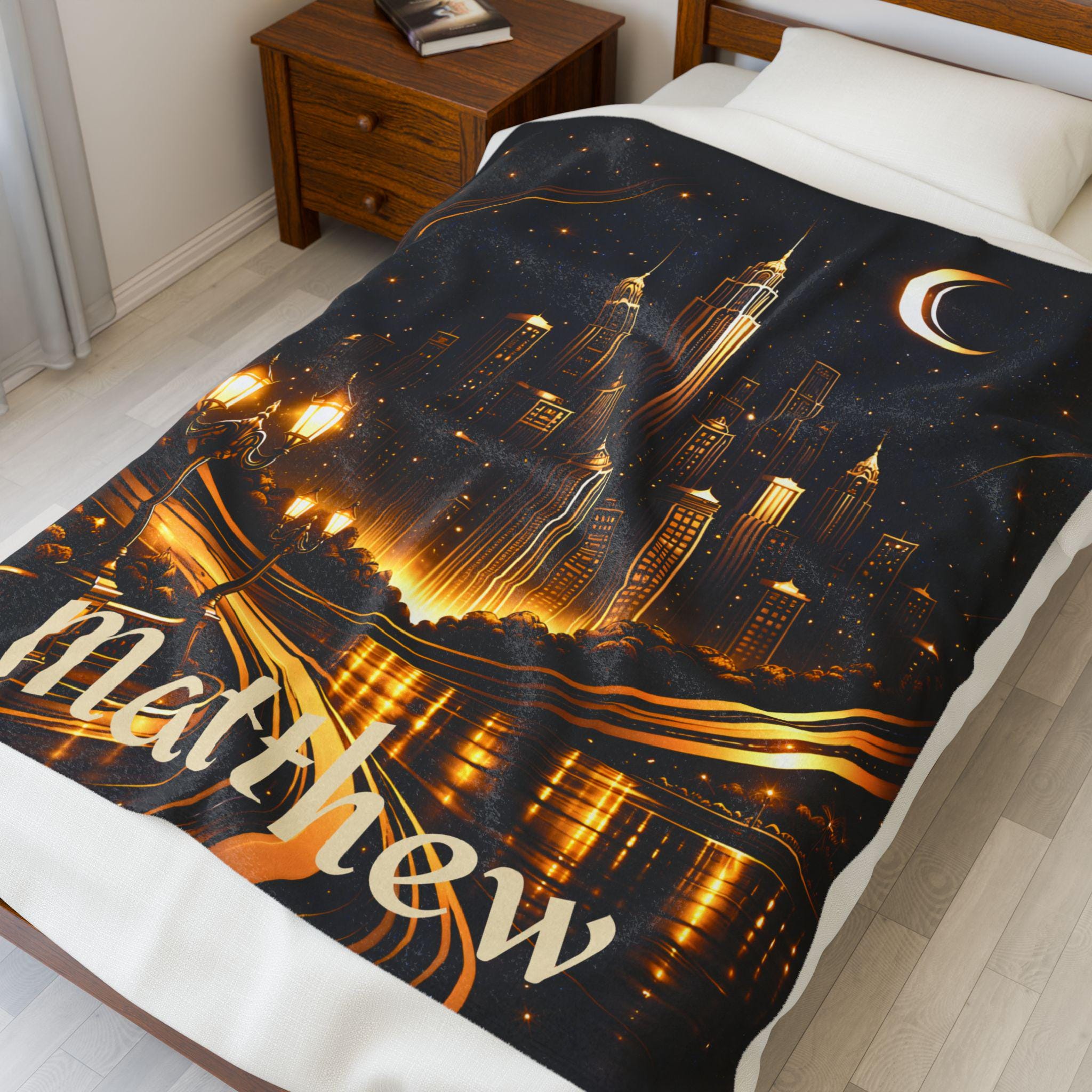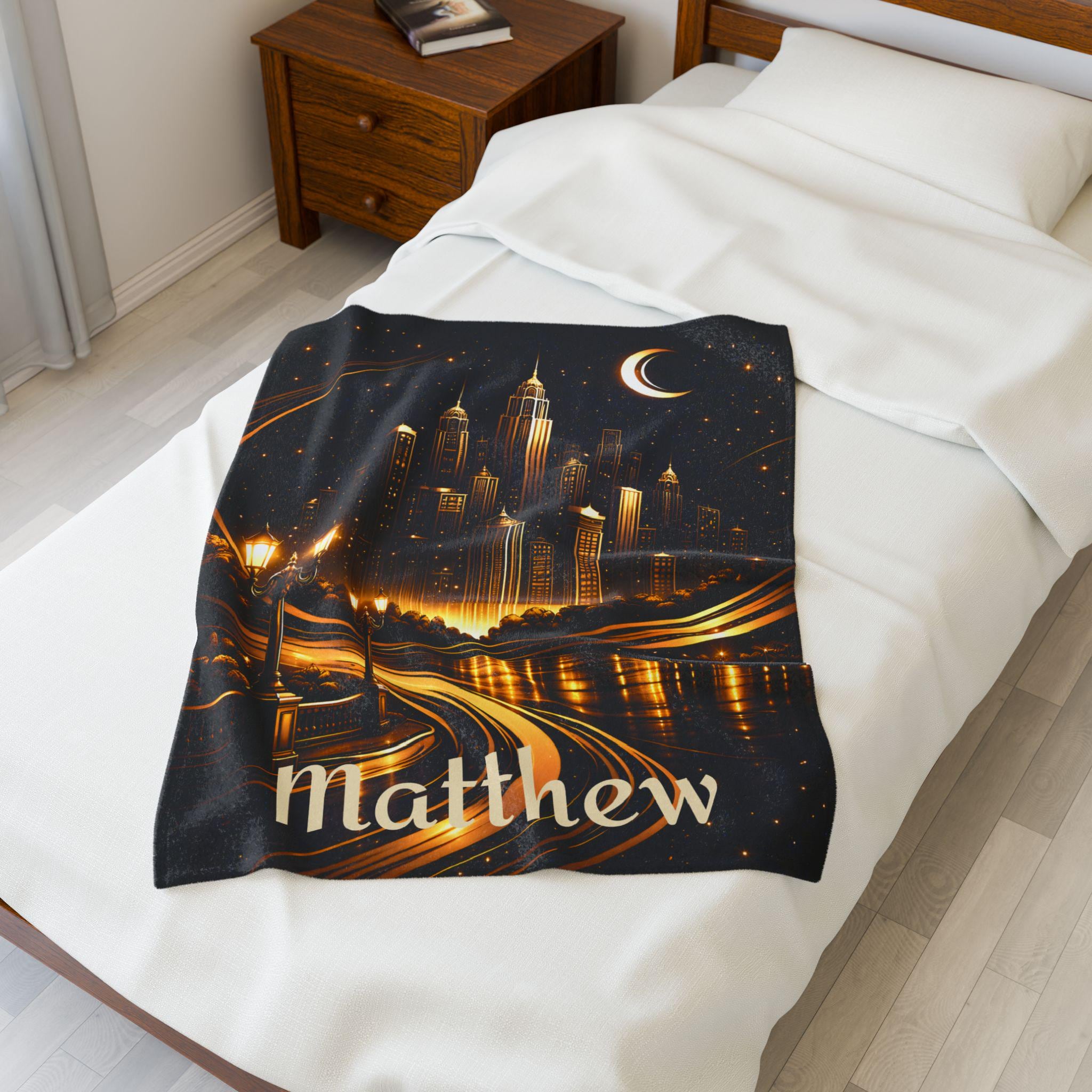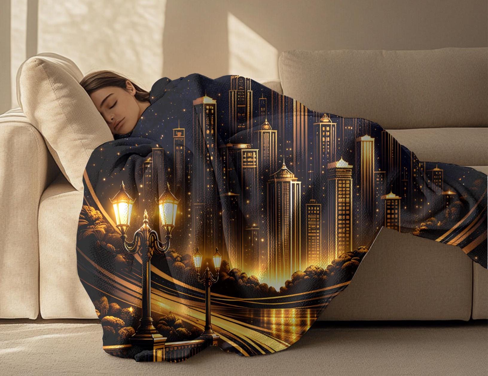 Add a bold, sophisticated statement to your space with this personalized Art Deco city skyline blanket, designed for modern homes and masculine interiors.