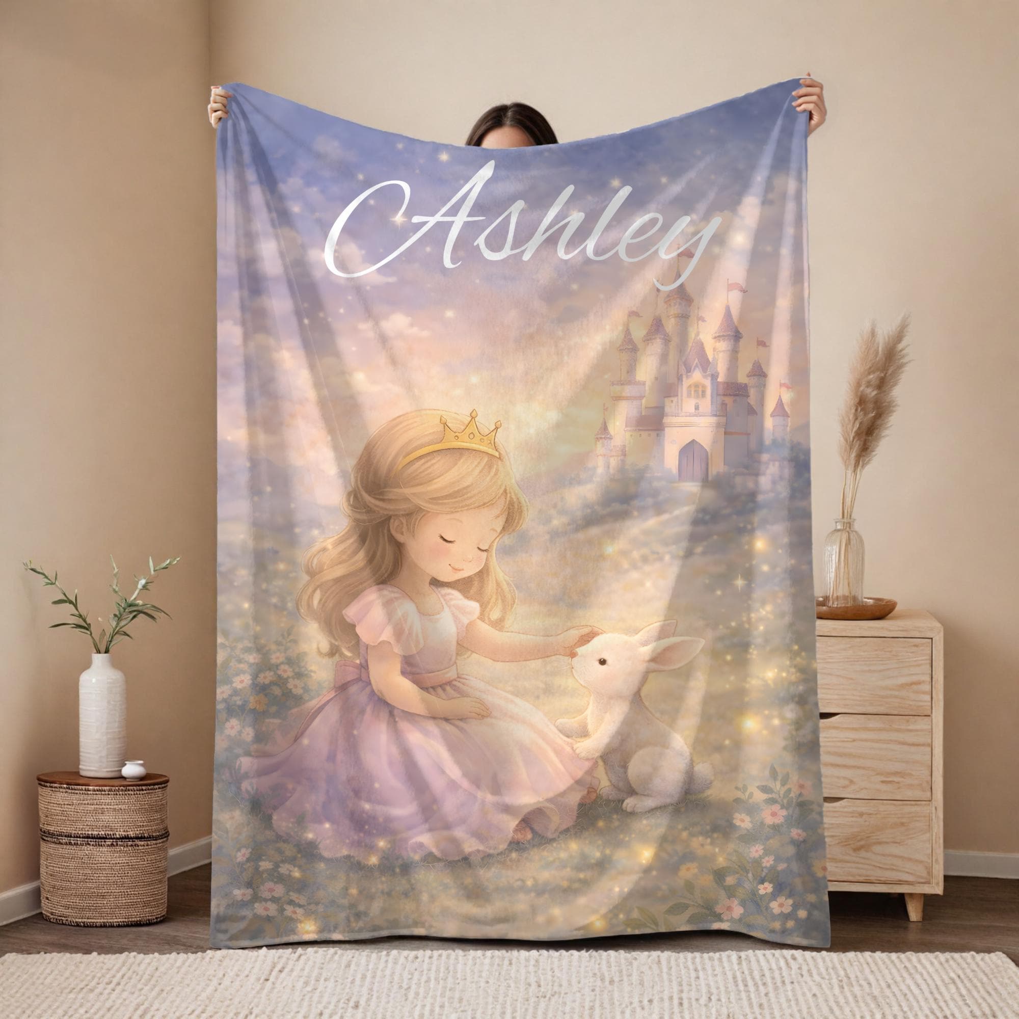 This storybook-style blanket features a gentle fairytale princess with her animal friend in a peaceful royal setting. The soft colors and whimsical artwork make it perfect for toddlers who love magical worlds, pretend play, and cozy bedtime routines.