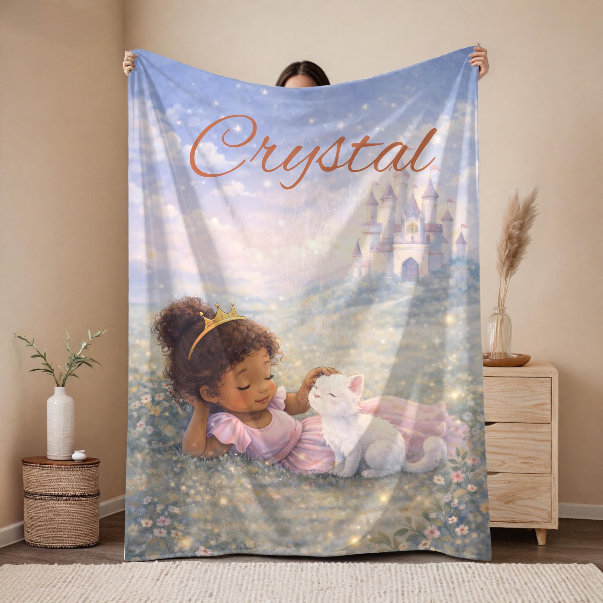 This storybook blanket features a sweet African American princess relaxing in a sunny meadow with her kitten, surrounded by flowers and a dreamy fairytale castle. The gentle daytime colors and peaceful scene make it perfect for toddlers who love princess stories, animals, and cozy moments.