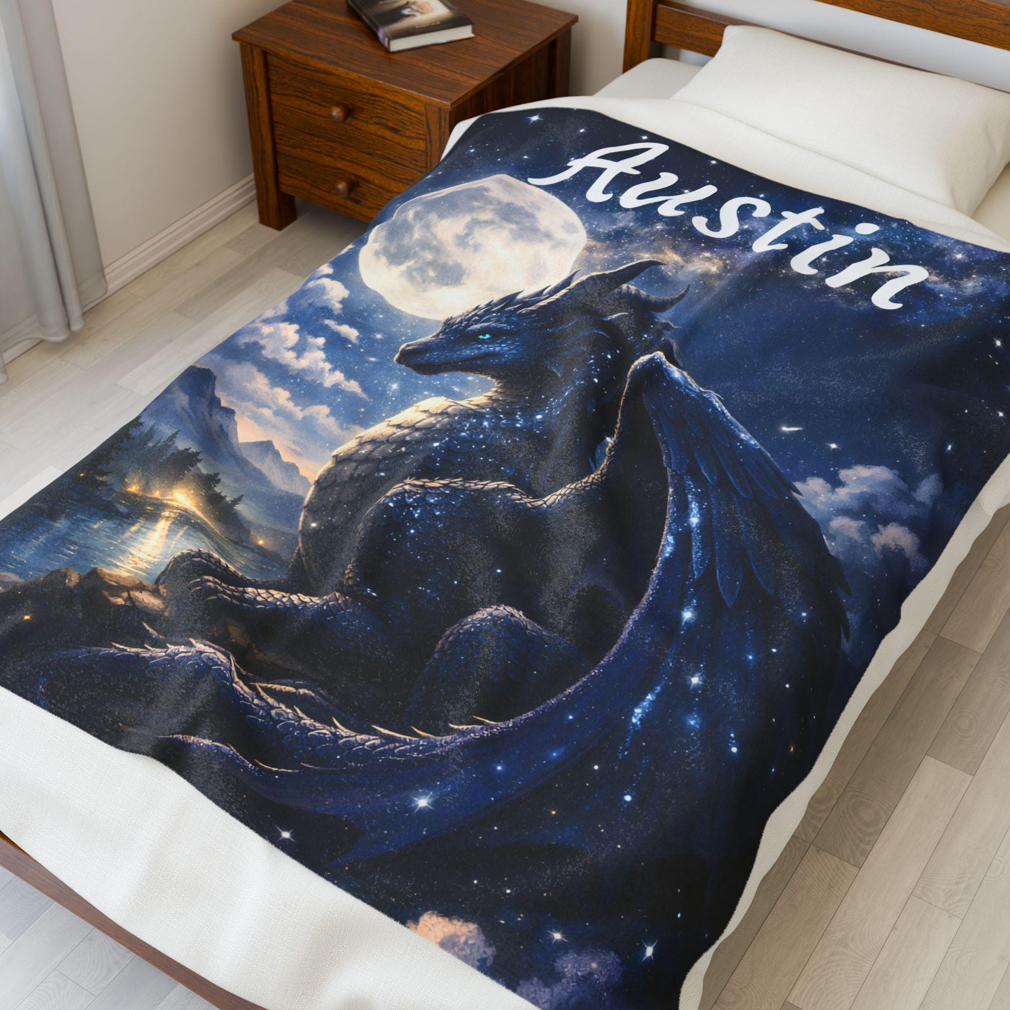 Create a magical bedtime experience with this Night Dragon fantasy blanket for kids. Featuring a calm, powerful dragon beneath a glowing moon and star-filled sky, this blanket brings imagination, comfort, and wonder to any child’s room.