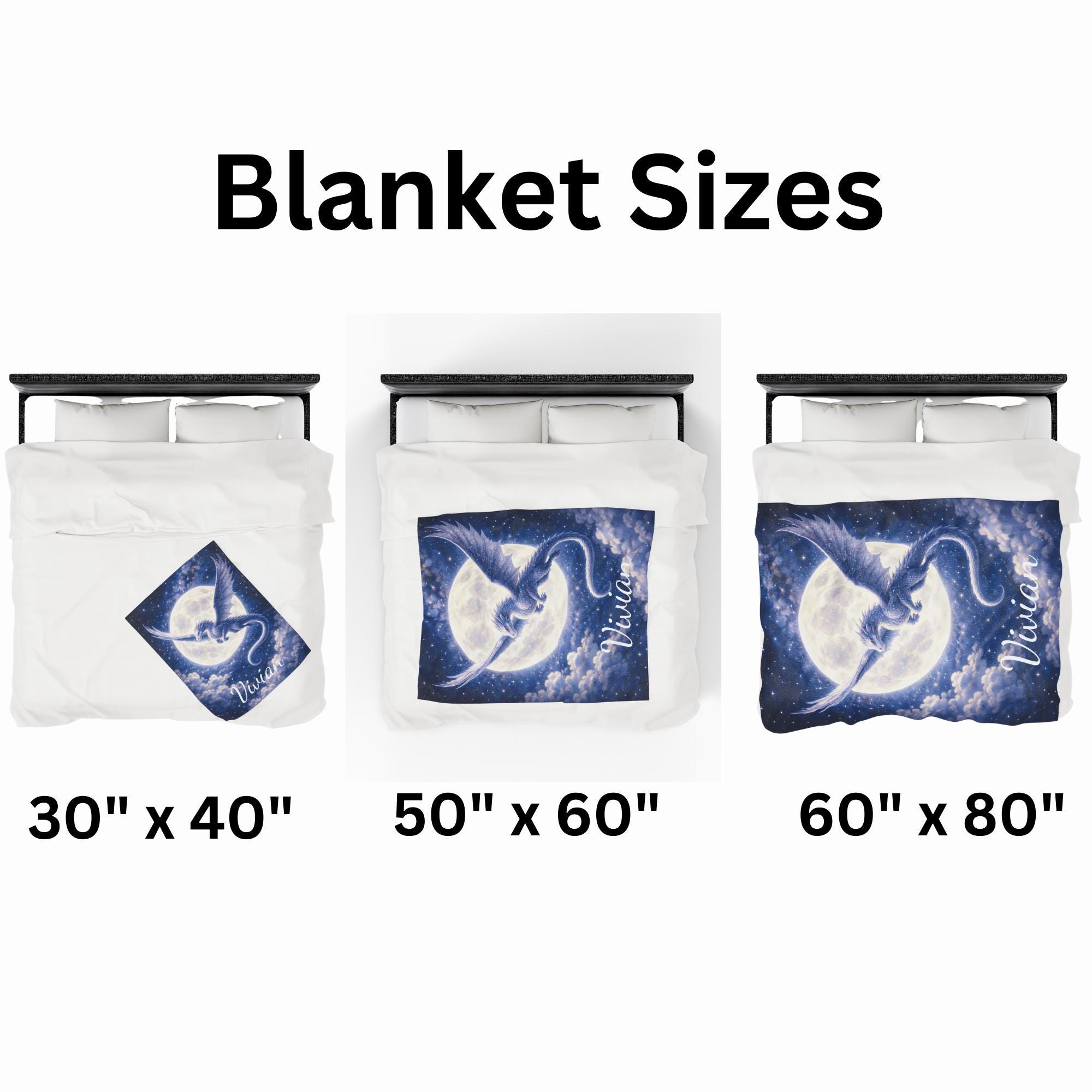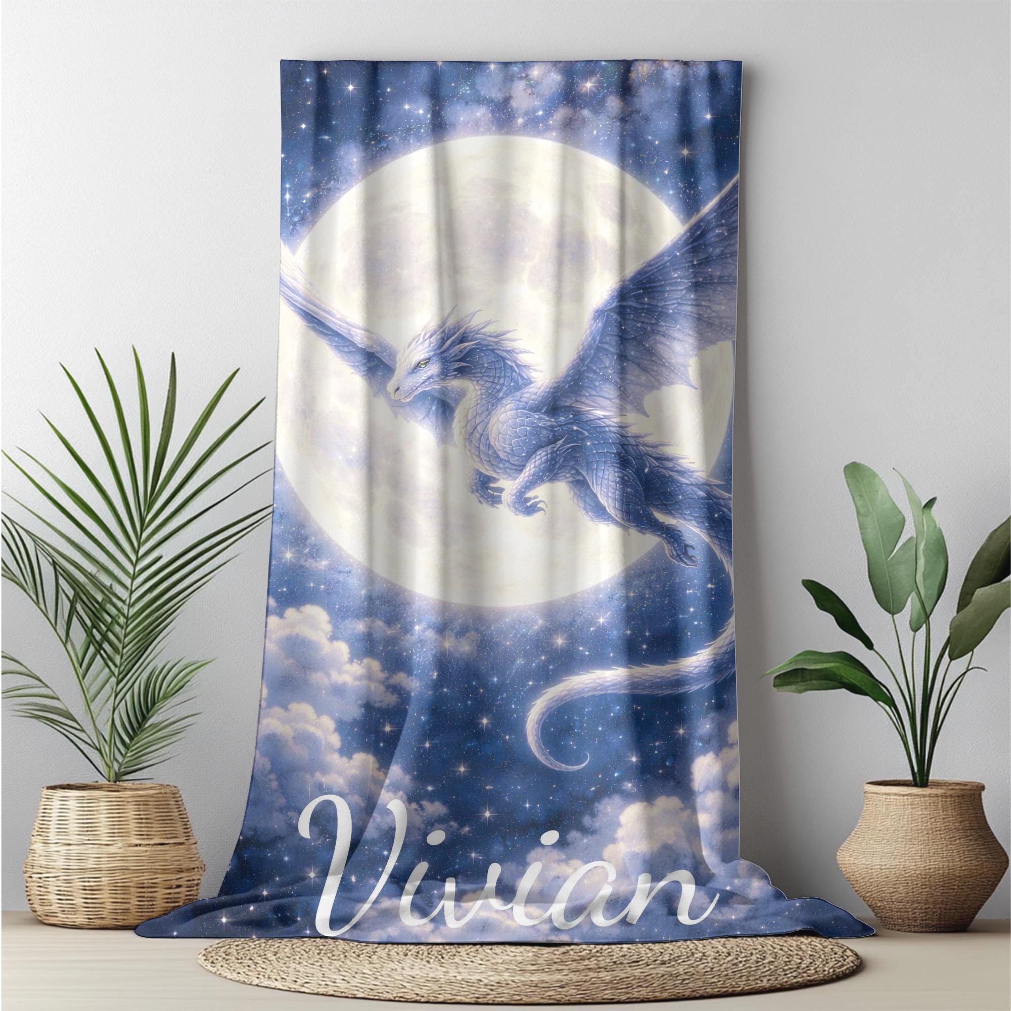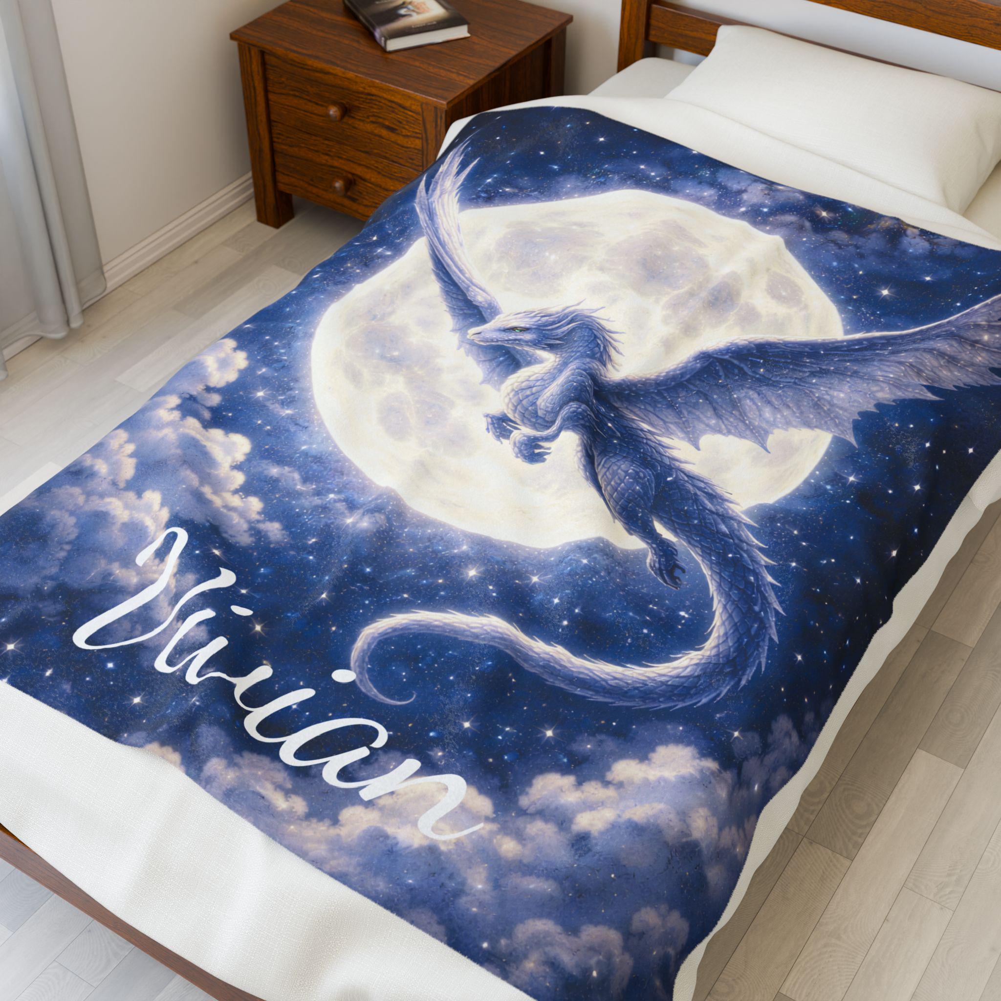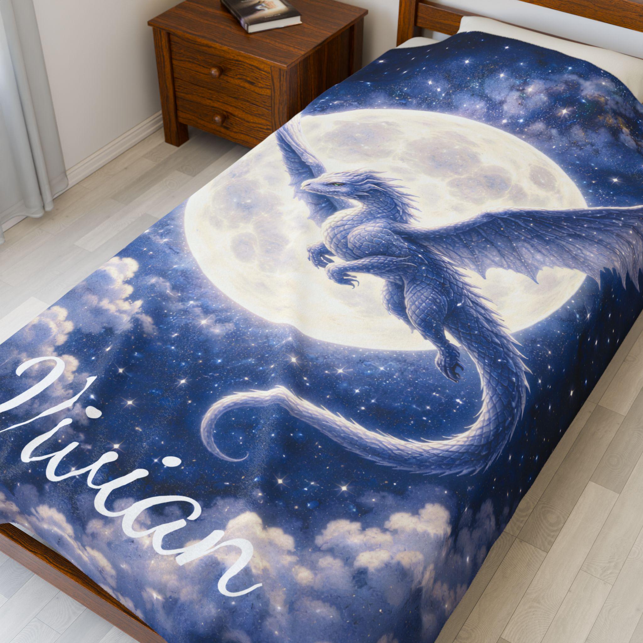 Bring the magic of fantasy to bedtime with this Moon Dragon fantasy blanket, featuring a powerful silver-blue dragon flying across a glowing full moon in a star-filled night sky.