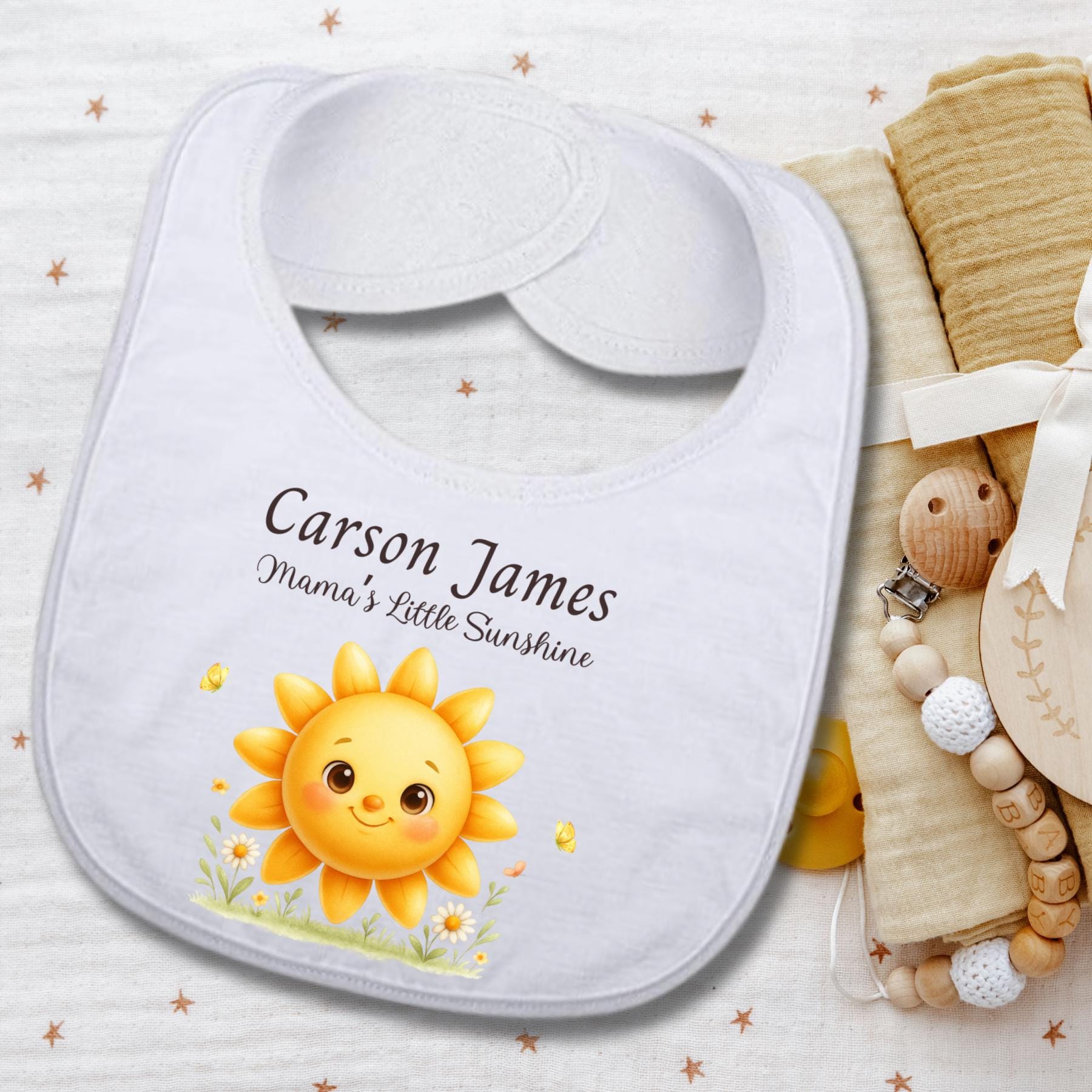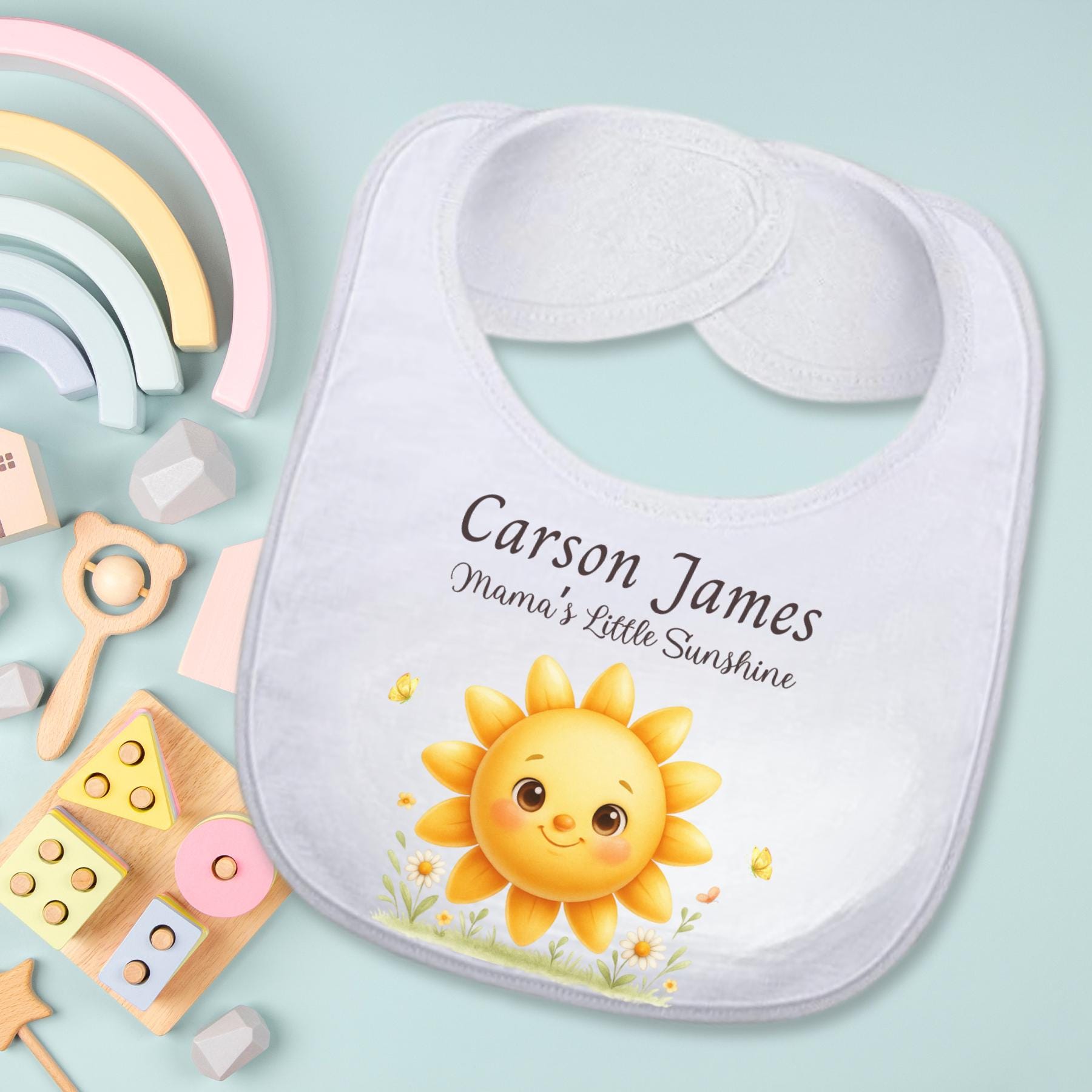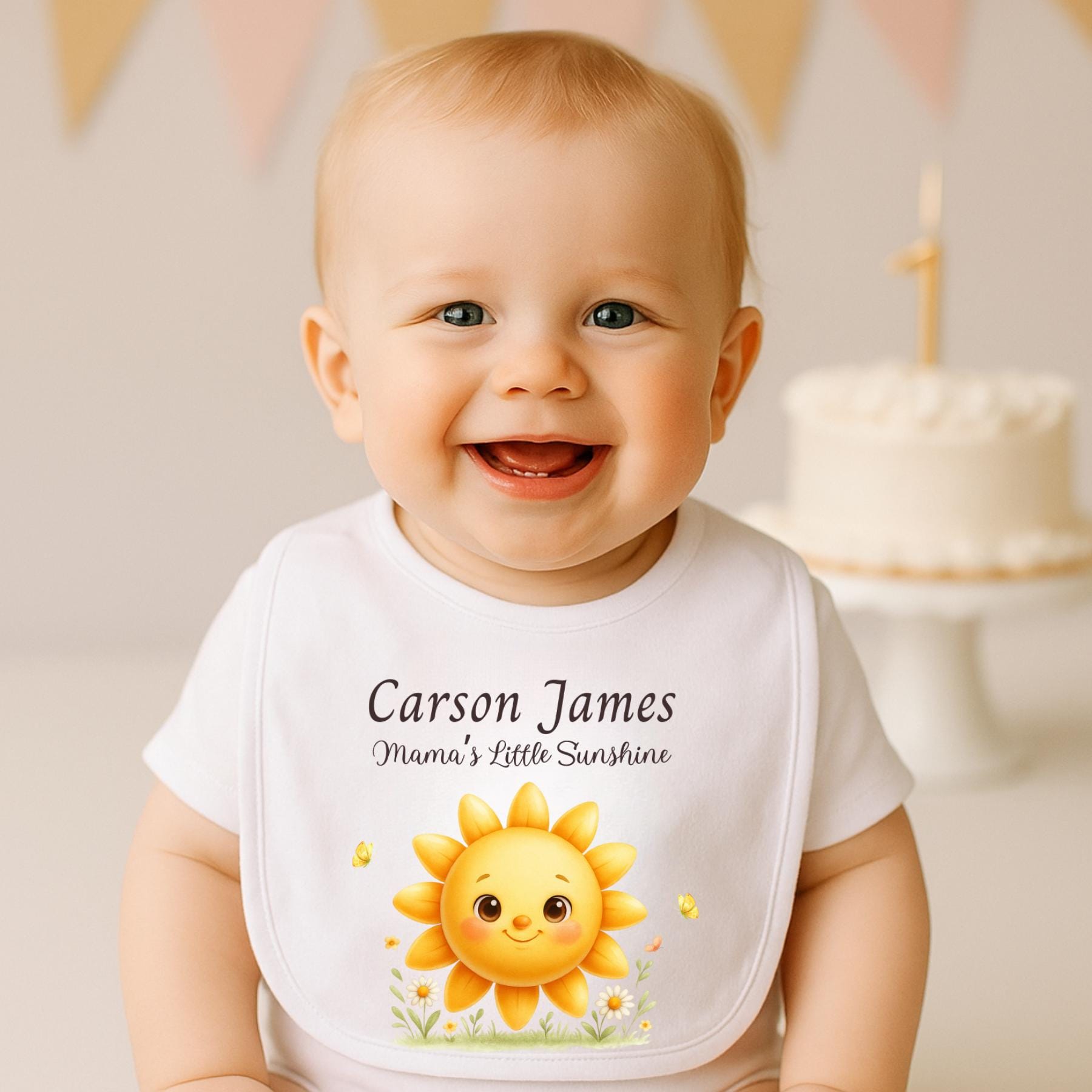 Celebrate your little ray of sunshine with this personalized baby bib featuring an adorable smiling sun design and custom name option. Perfect for everyday wear, first birthdays, or as a thoughtful baby shower gift. This custom bib adds a sweet touch to mealtime, cake smash photos, or milestone moments.