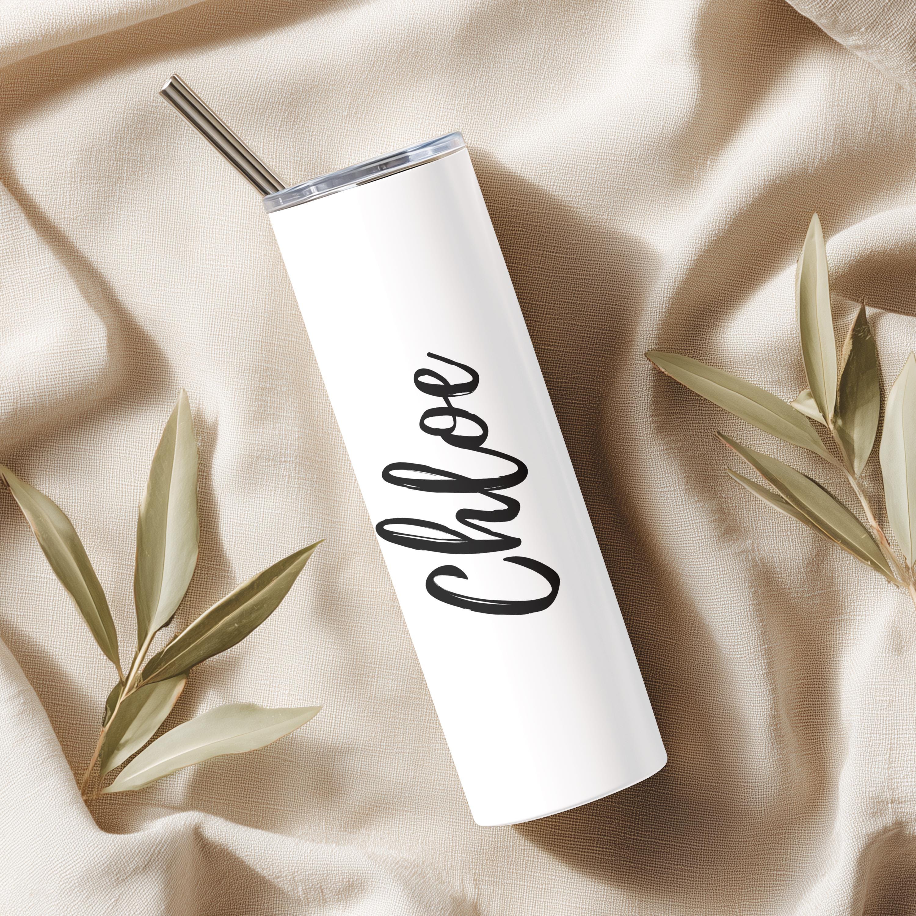 The 20oz stainless steel skinny tumbler is double-walled and vacuum-insulated, keeping drinks hot or cold for hours! The exterior features a smooth, glossy white finish.