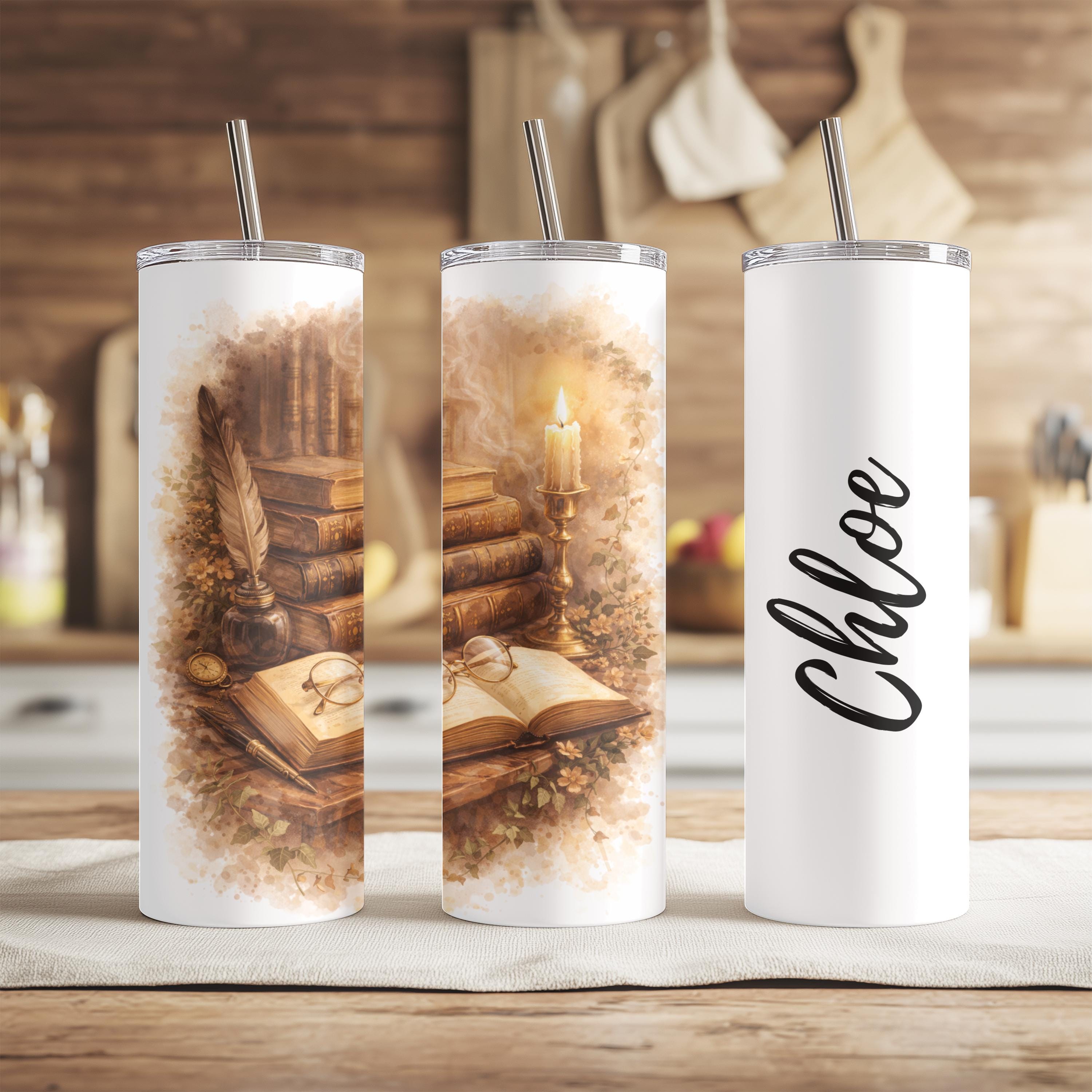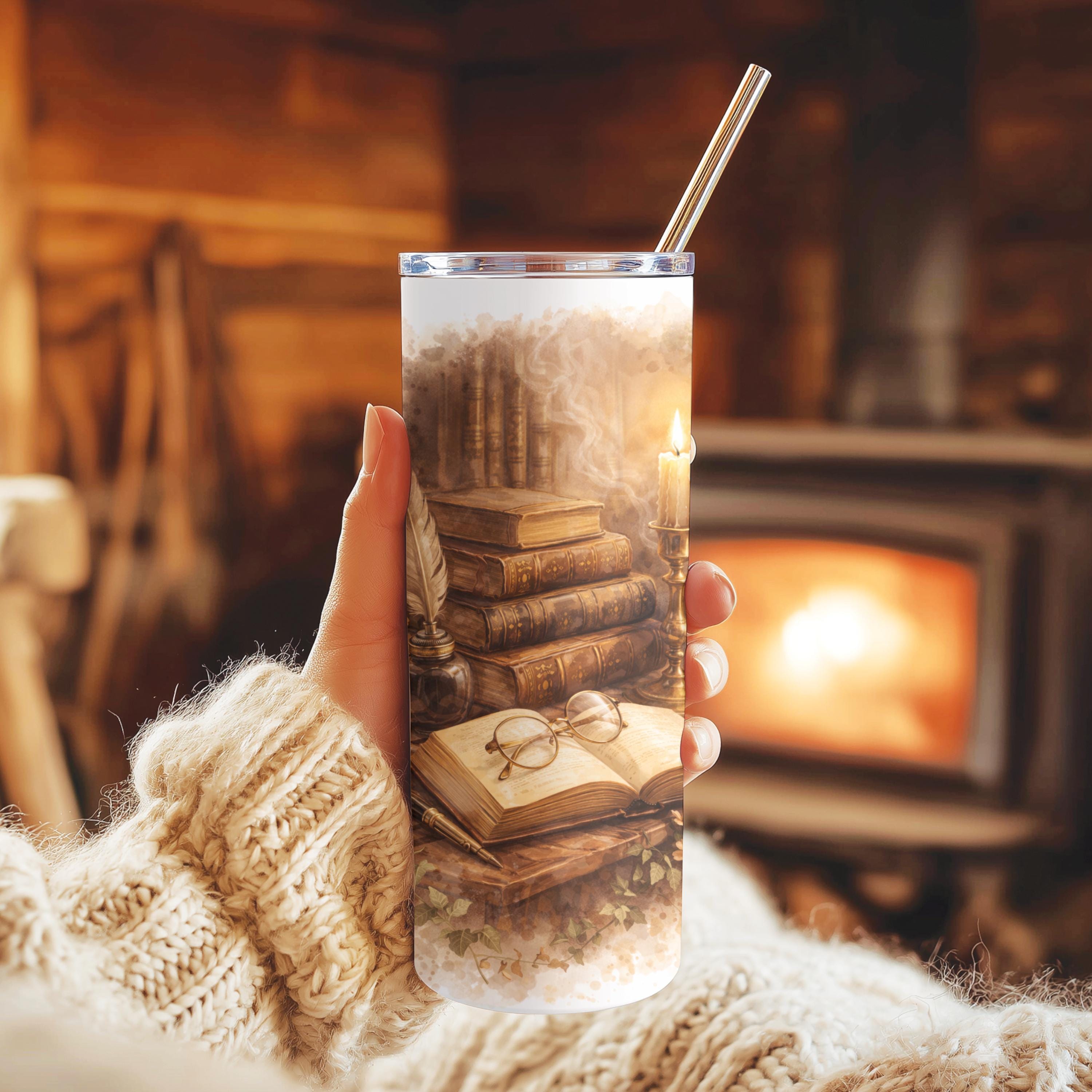 This Dark Academia tumbler features a soft watercolor illustration inspired by vintage libraries, antique books, and cozy reader aesthetics. Designed for book lovers who adore warm neutrals, romantic details, and timeless style.