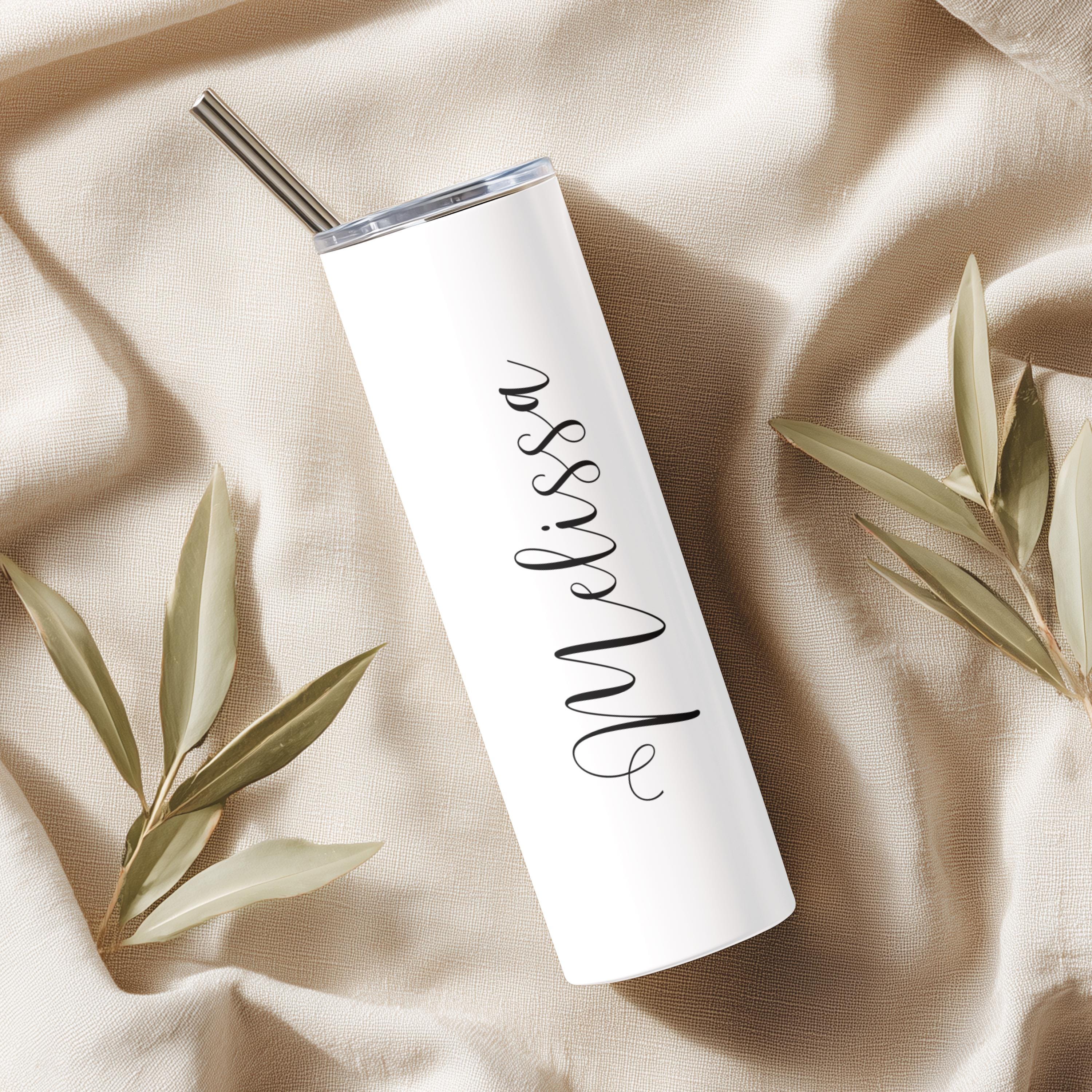 The 20oz stainless steel skinny tumbler is double-walled and vacuum-insulated, keeping drinks hot or cold for hours! The exterior features a smooth, glossy white finish.