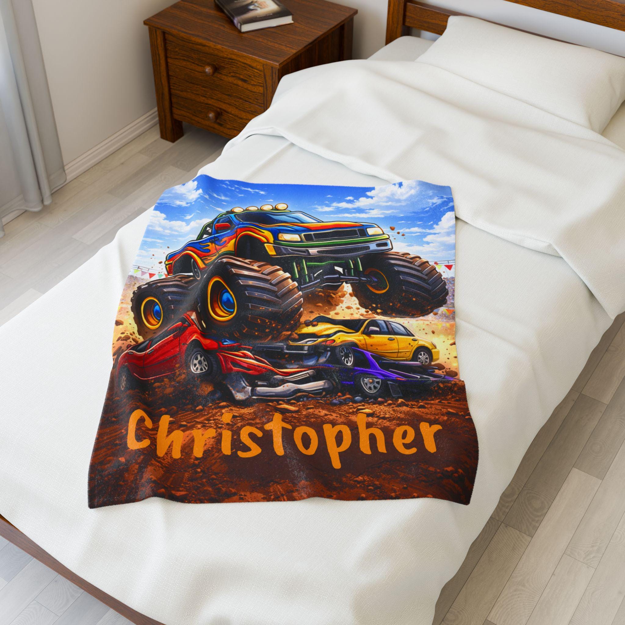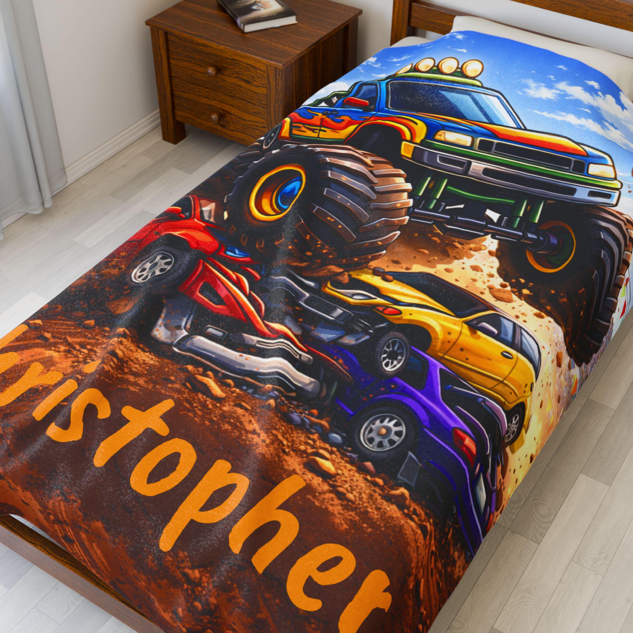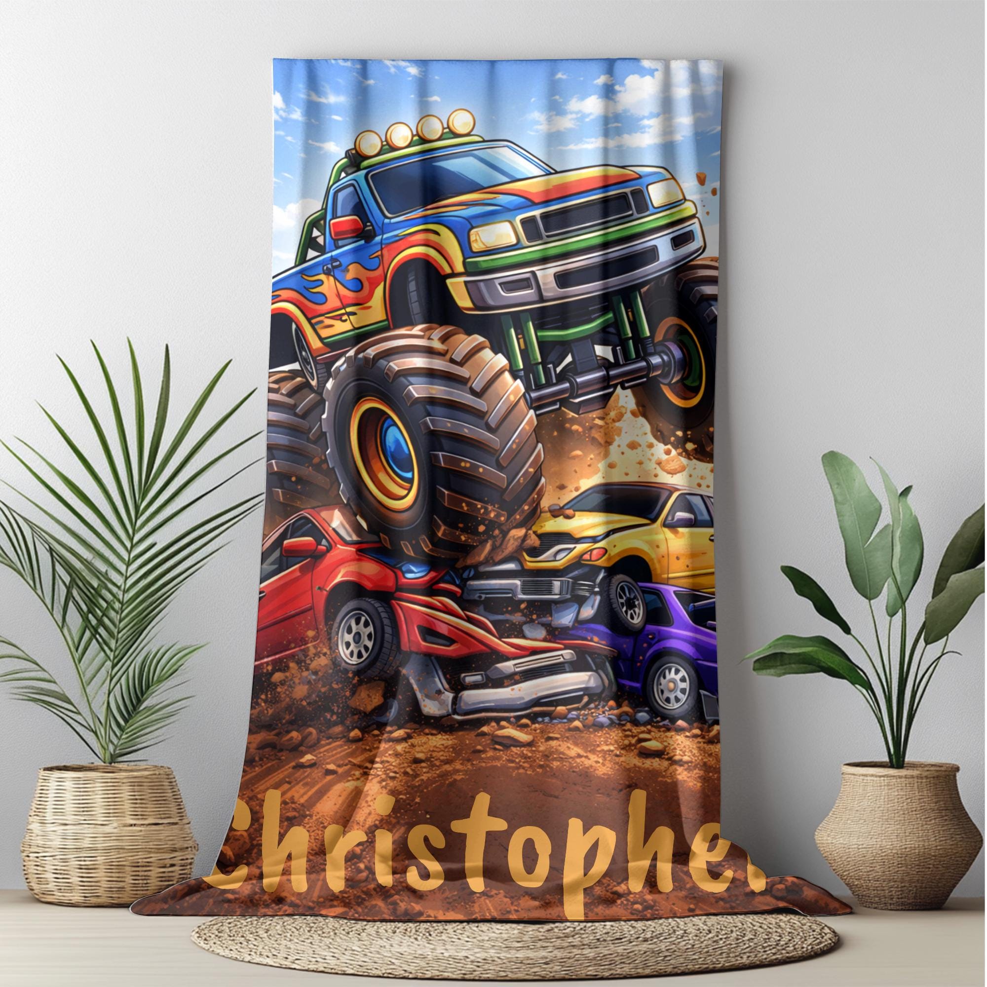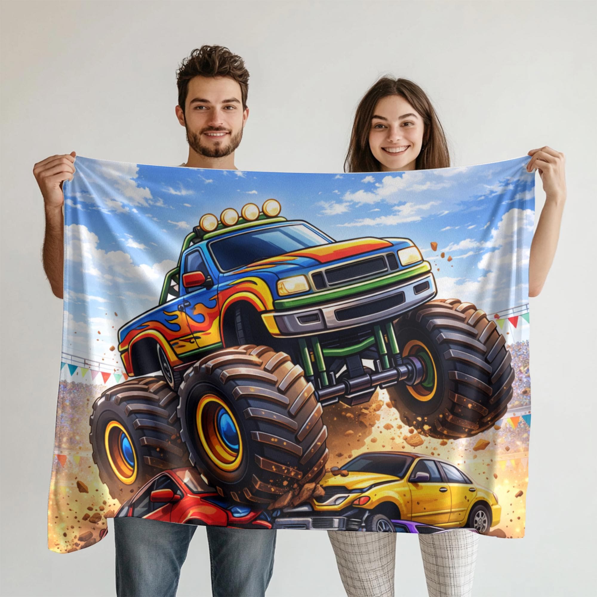 Bring big excitement to their room with this personalized monster truck blanket, designed for kids who love monster trucks, big wheels, and action-packed fun. Featuring a bold monster truck crushing cars, this colorful design captures the thrill of a monster truck show in a kid-friendly, illustrated style.