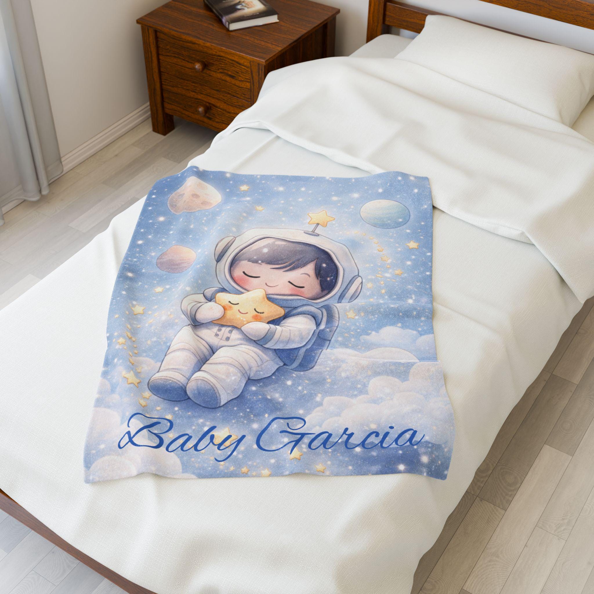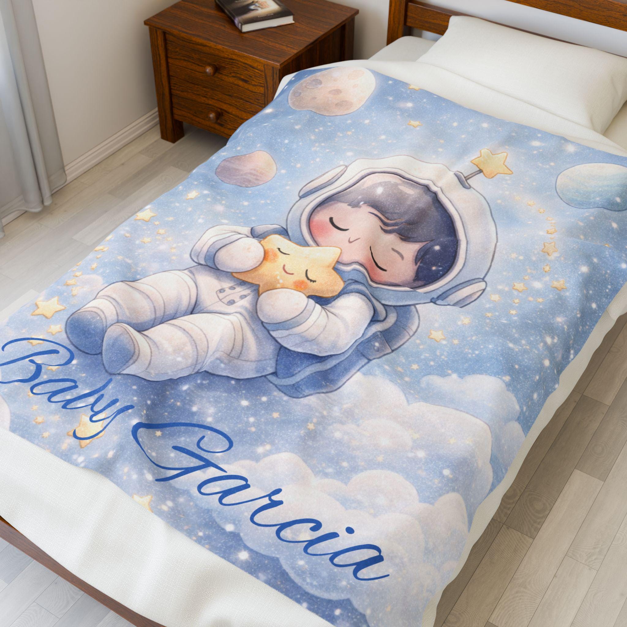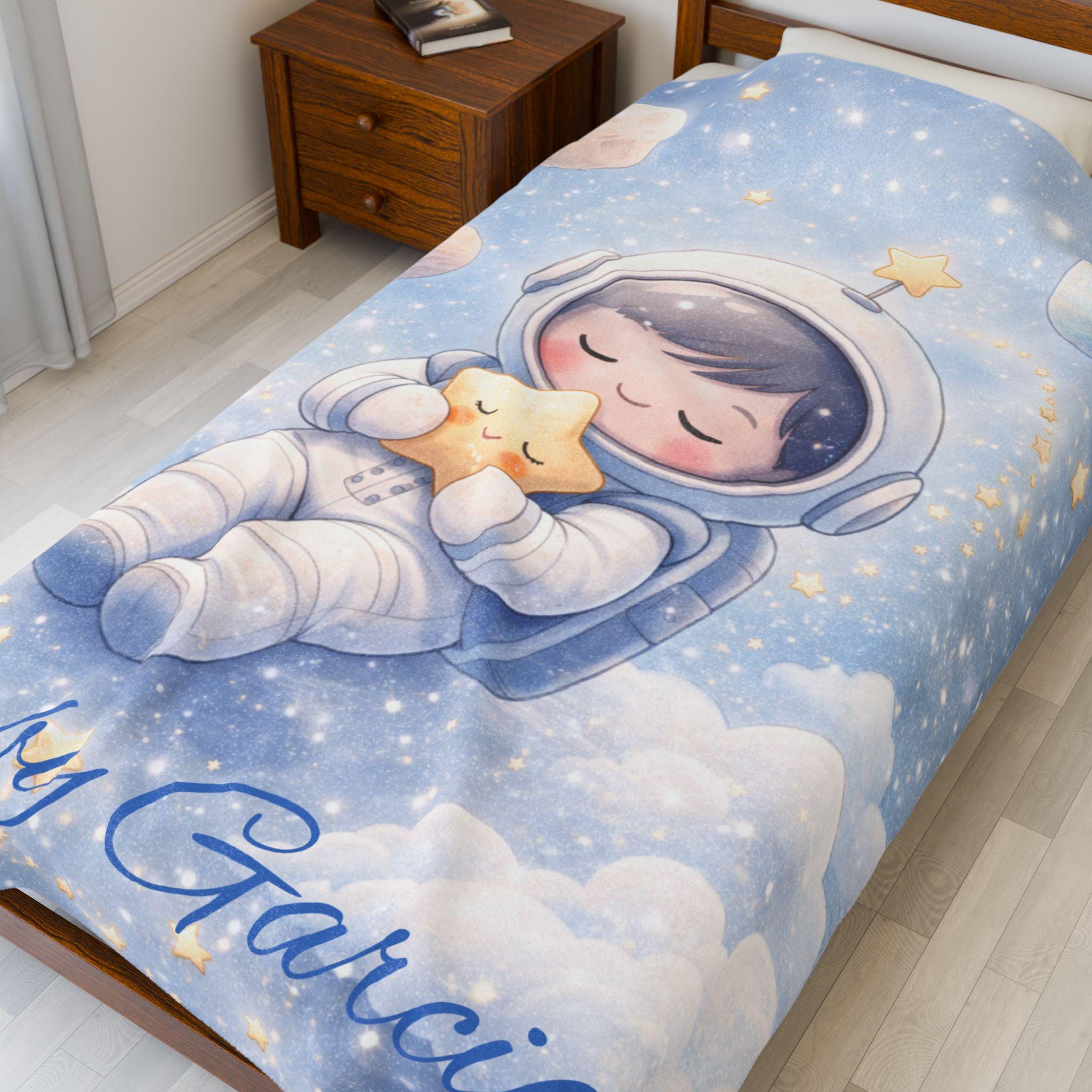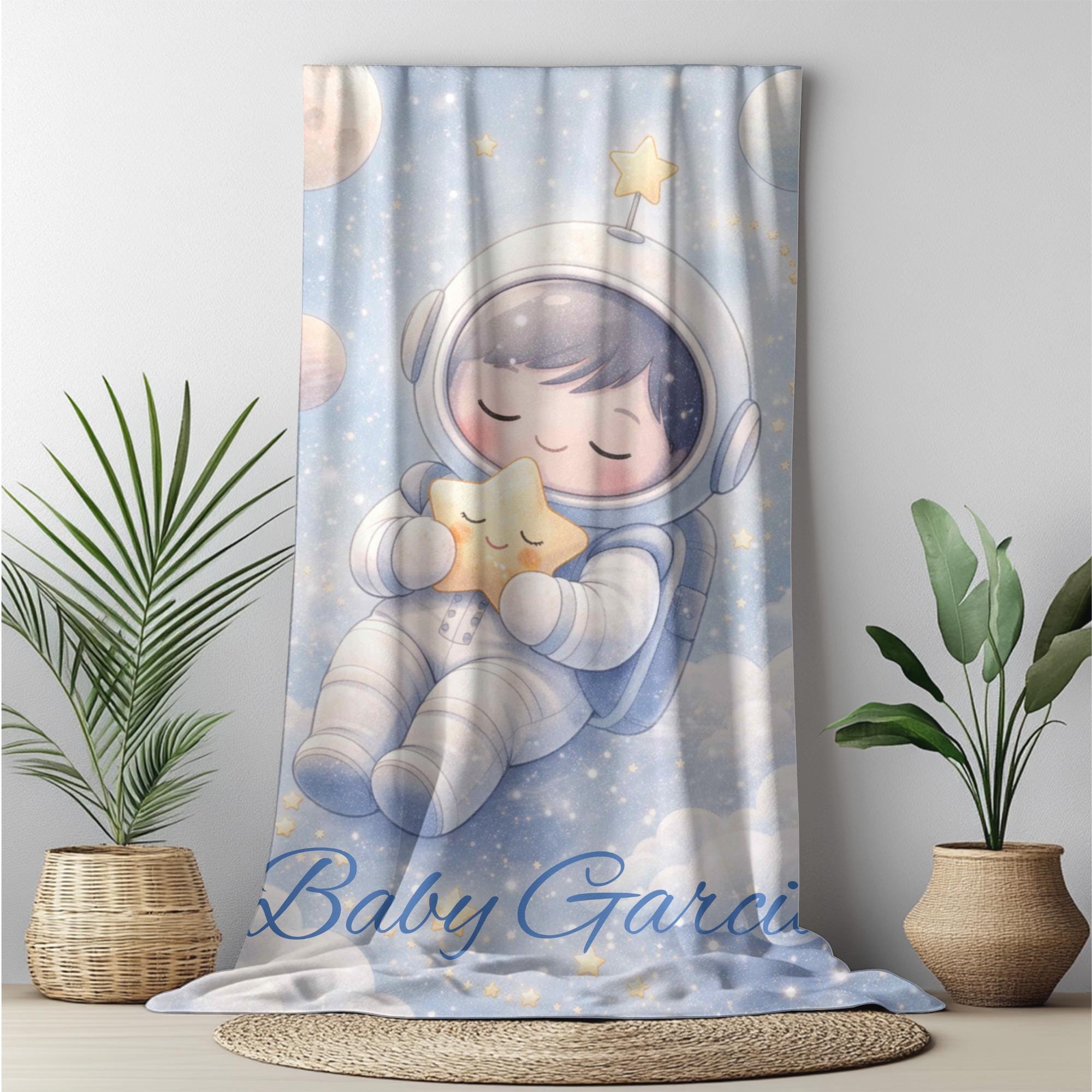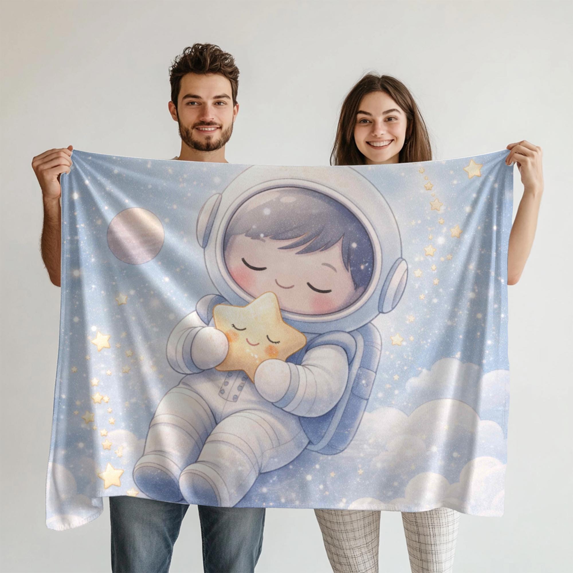 Create a calm and cozy nursery with this sleepy astronaut baby blanket, featuring an adorable astronaut peacefully drifting among soft clouds and glowing stars. Designed with gentle colors and a soothing space theme, this blanket is perfect for helping create a relaxing bedtime environment for babies.