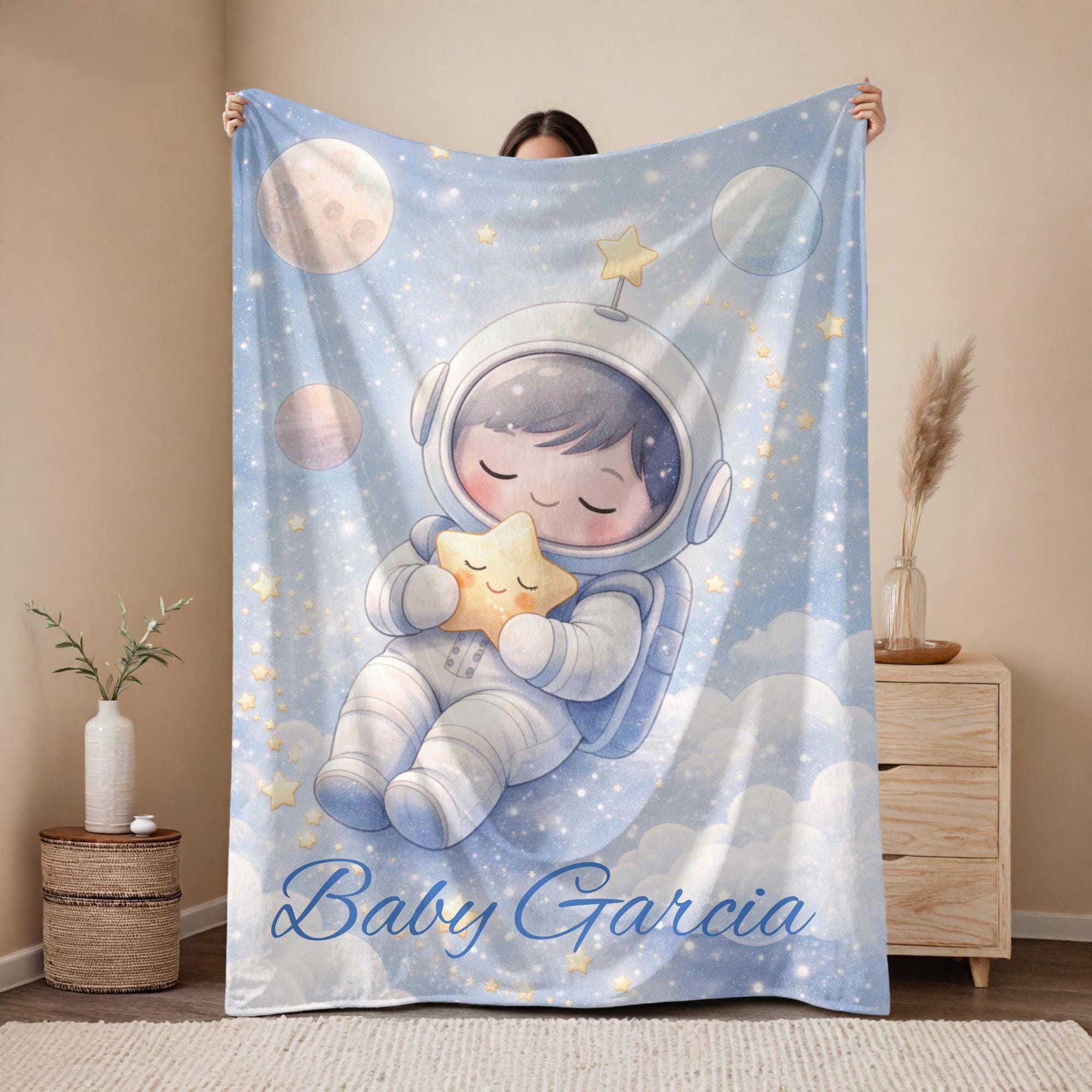 The closed-eye astronaut and dreamy star details give this blanket a comforting, sleepy feel that parents love for nurseries. Its soft, neutral color palette makes it a beautiful choice for any baby’s room, whether you’re decorating a space-themed nursery or looking for a thoughtful baby shower gift.