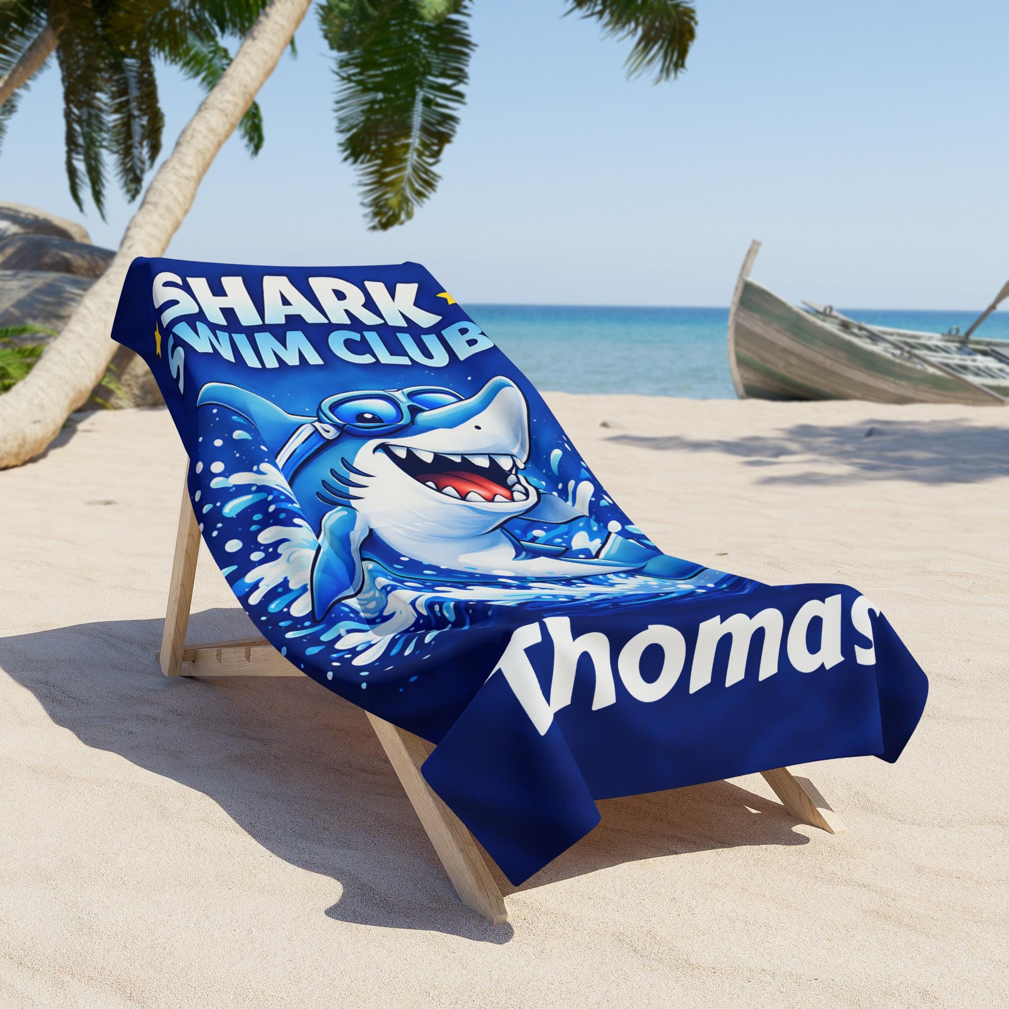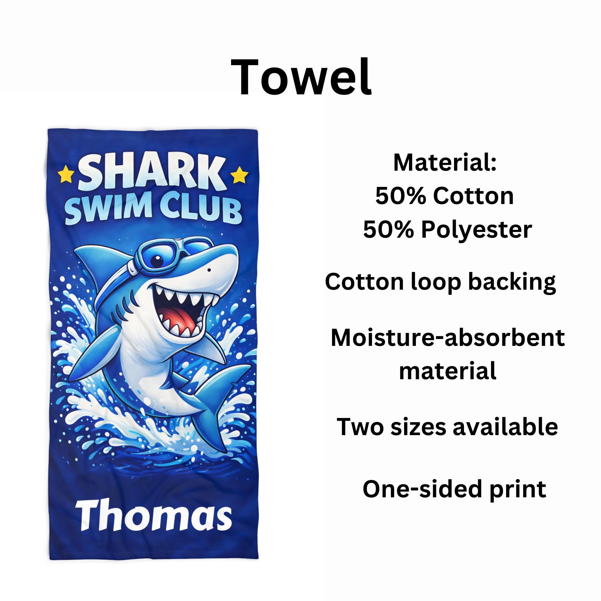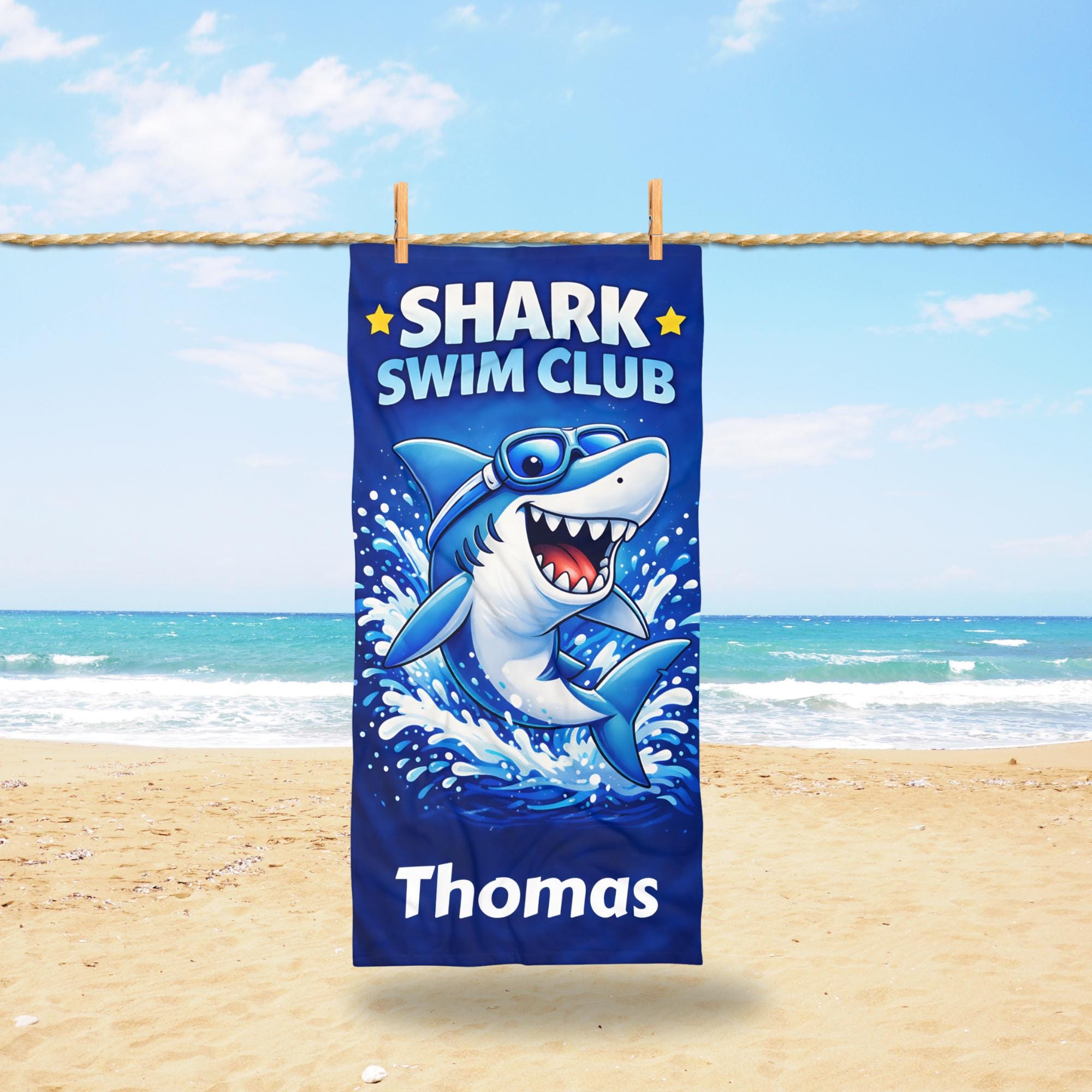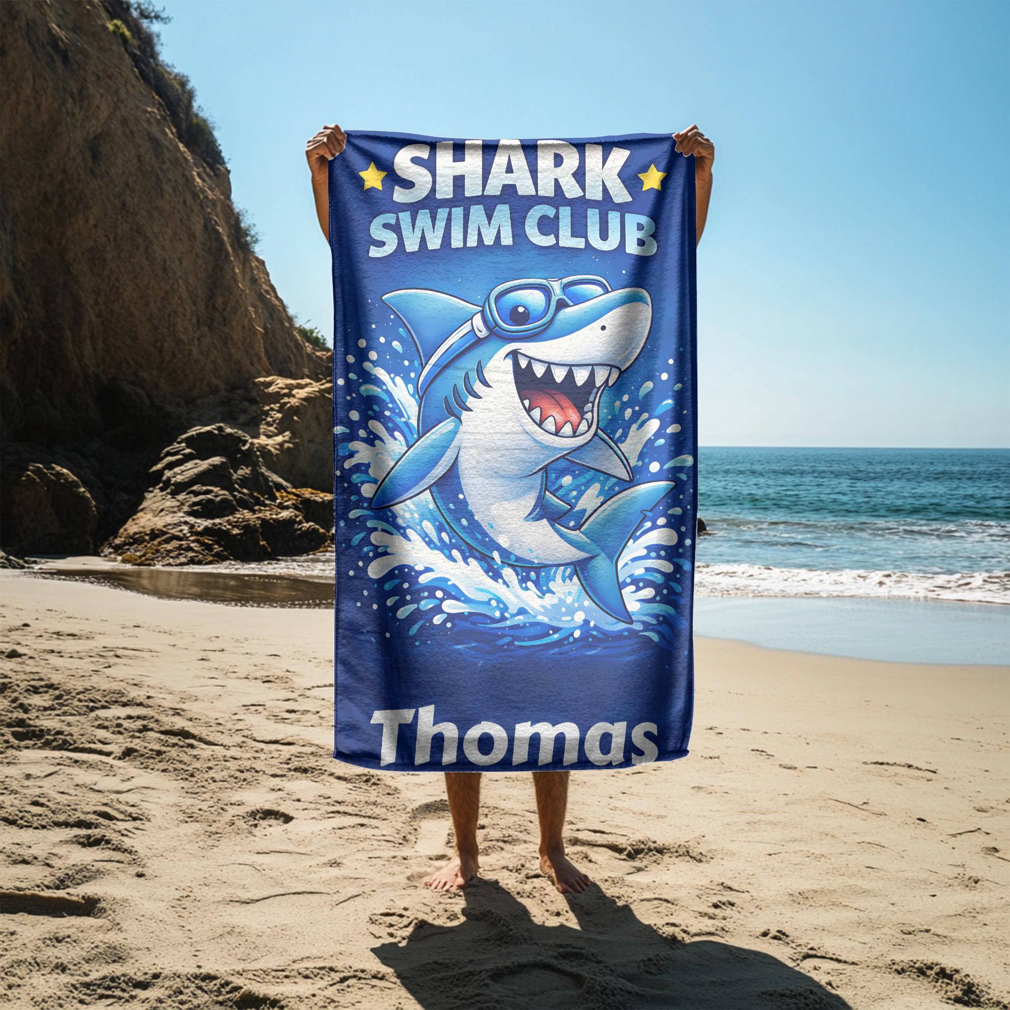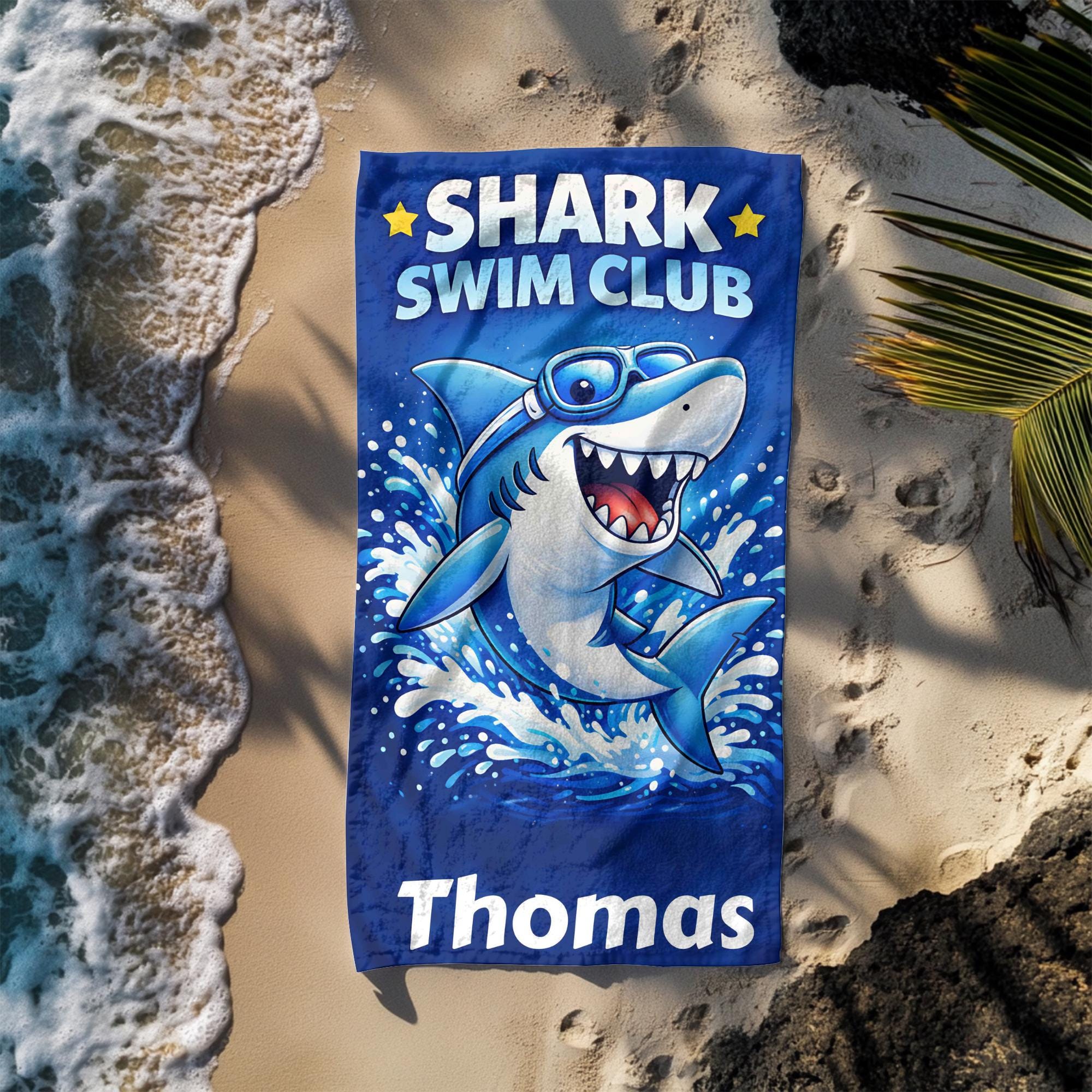 Make beach days and pool time extra fun with a personalized shark-themed towel designed for kids who love water adventures and bold summer style.