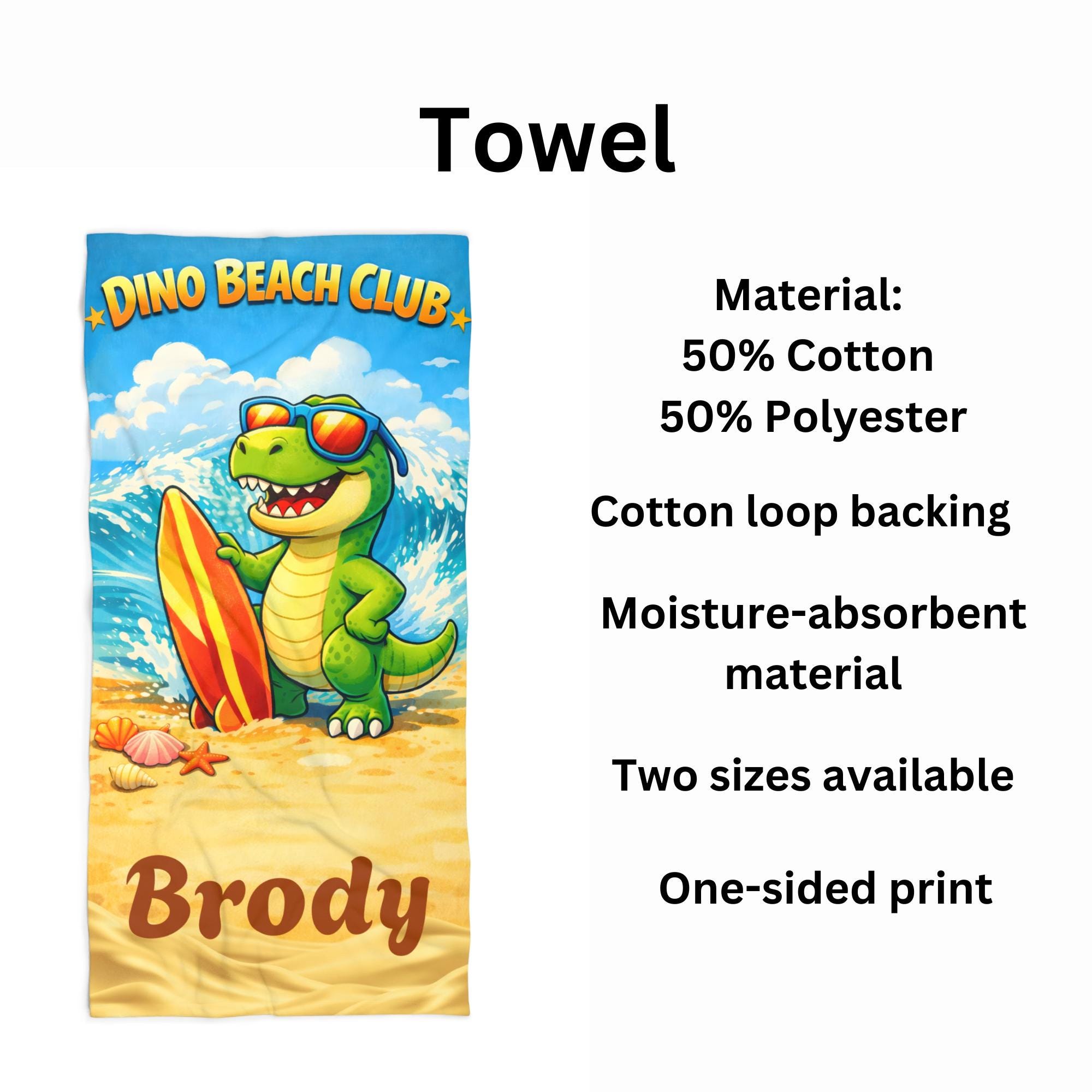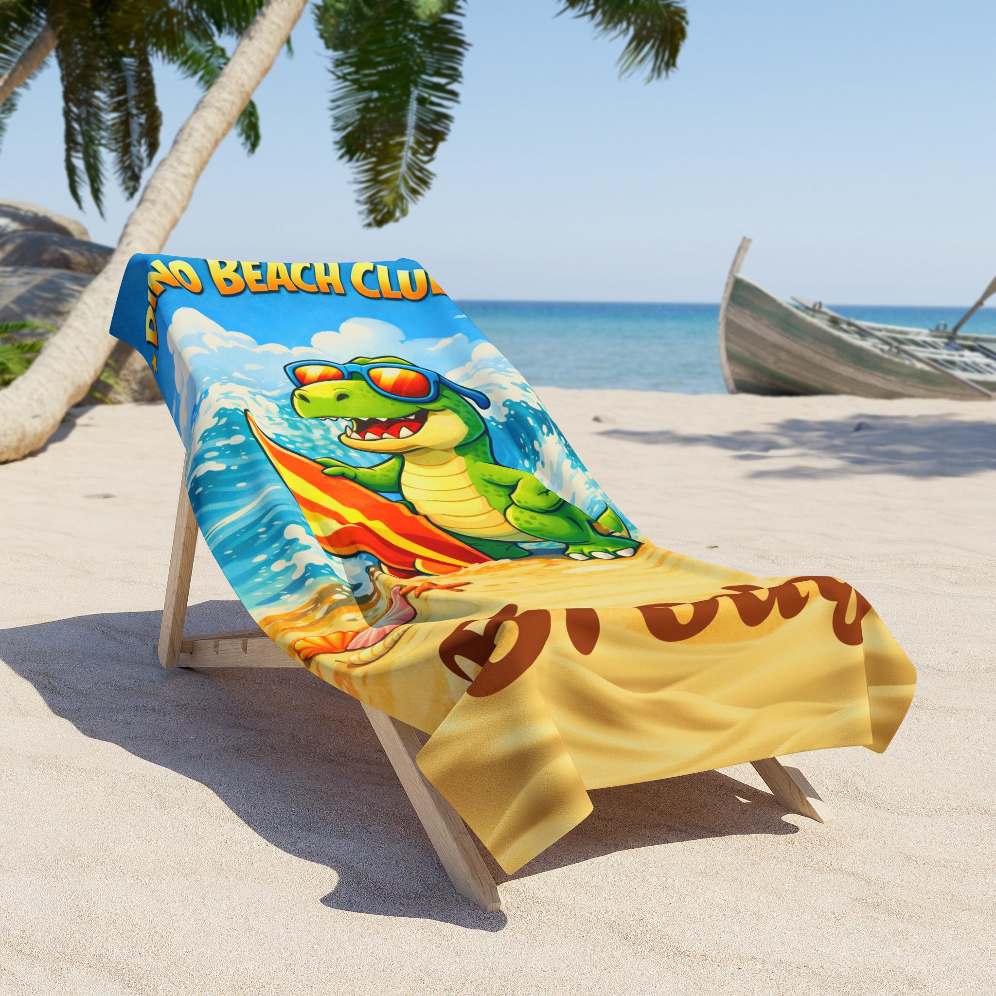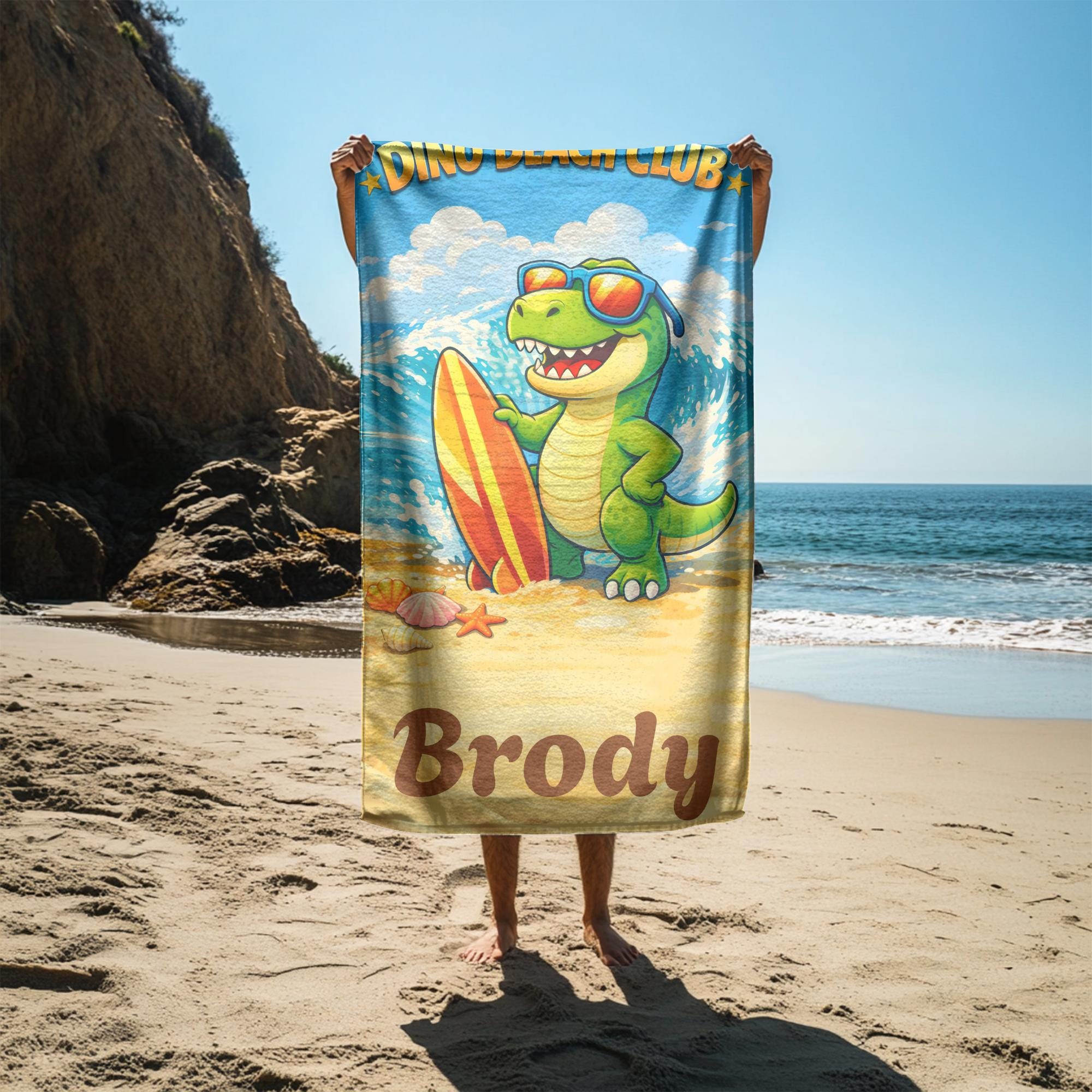 Featuring a playful surf-ready dinosaur in a bold cartoon style, this towel stands out with bright colors, clean design, and a fun beach vibe that kids instantly love. The open lower space allows for personalization, making it easy to spot at crowded pools, water parks, and family vacations.