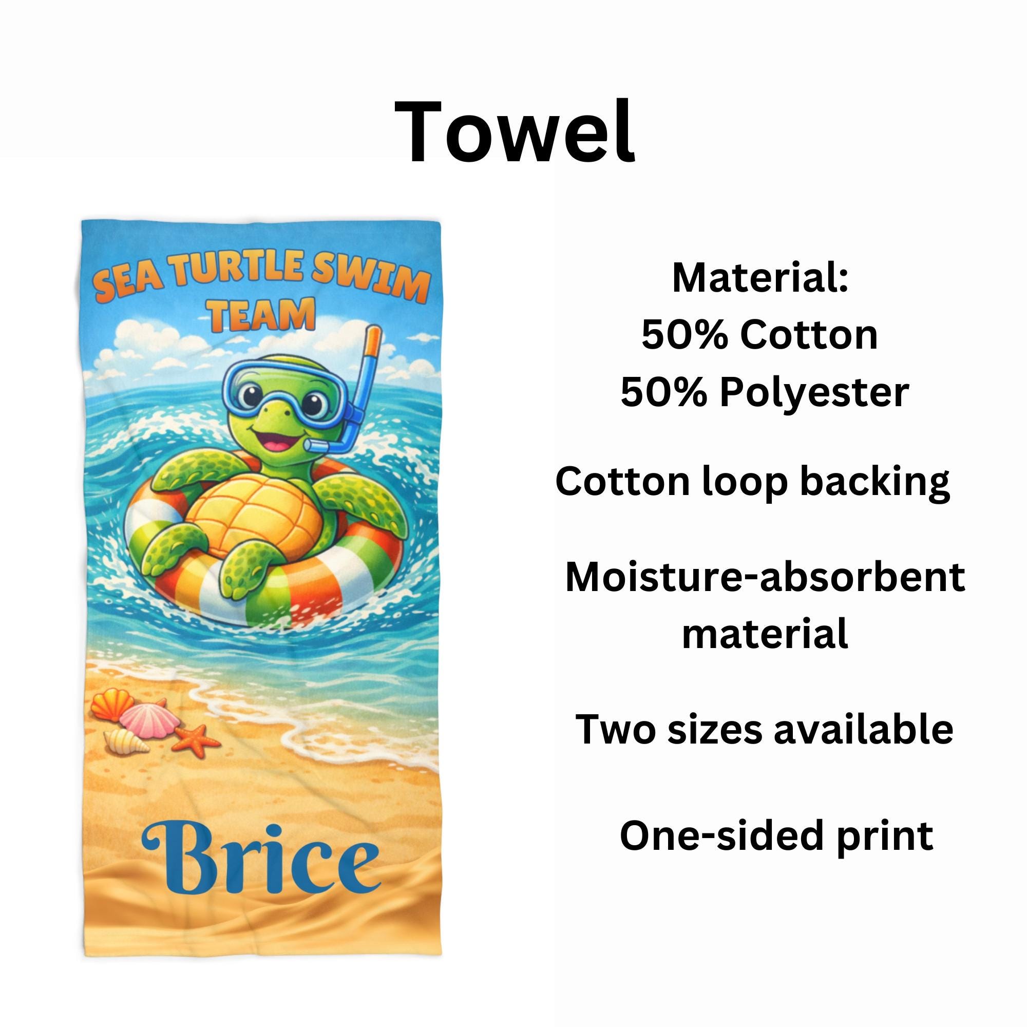 Featuring a cheerful turtle in a playful ocean-inspired style, this towel adds a fun coastal feel while still keeping a clean, modern look that works for kids, teens, and family beach trips. The bright colors stand out beautifully in photos and make it easy to spot at busy pools, water parks, and resorts.