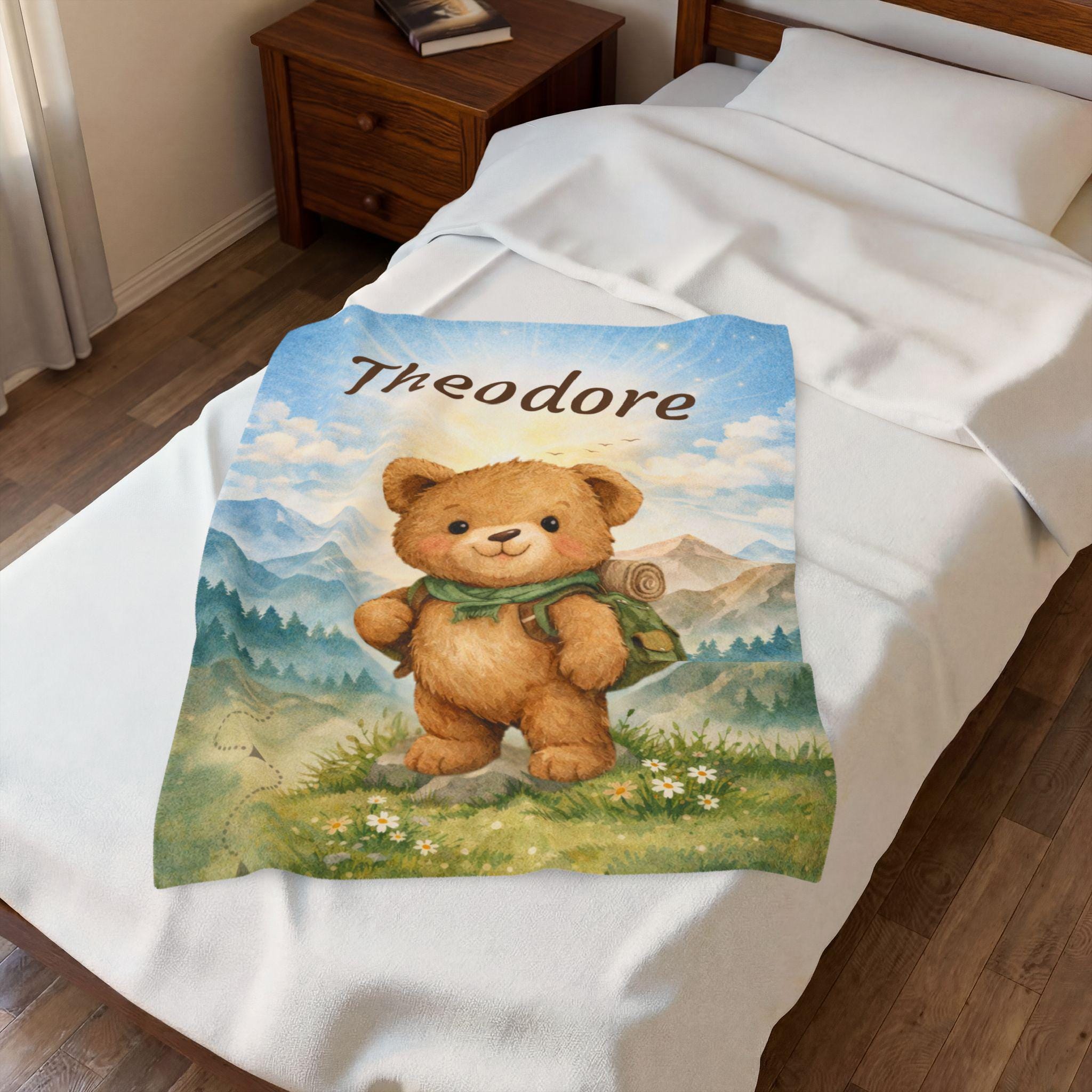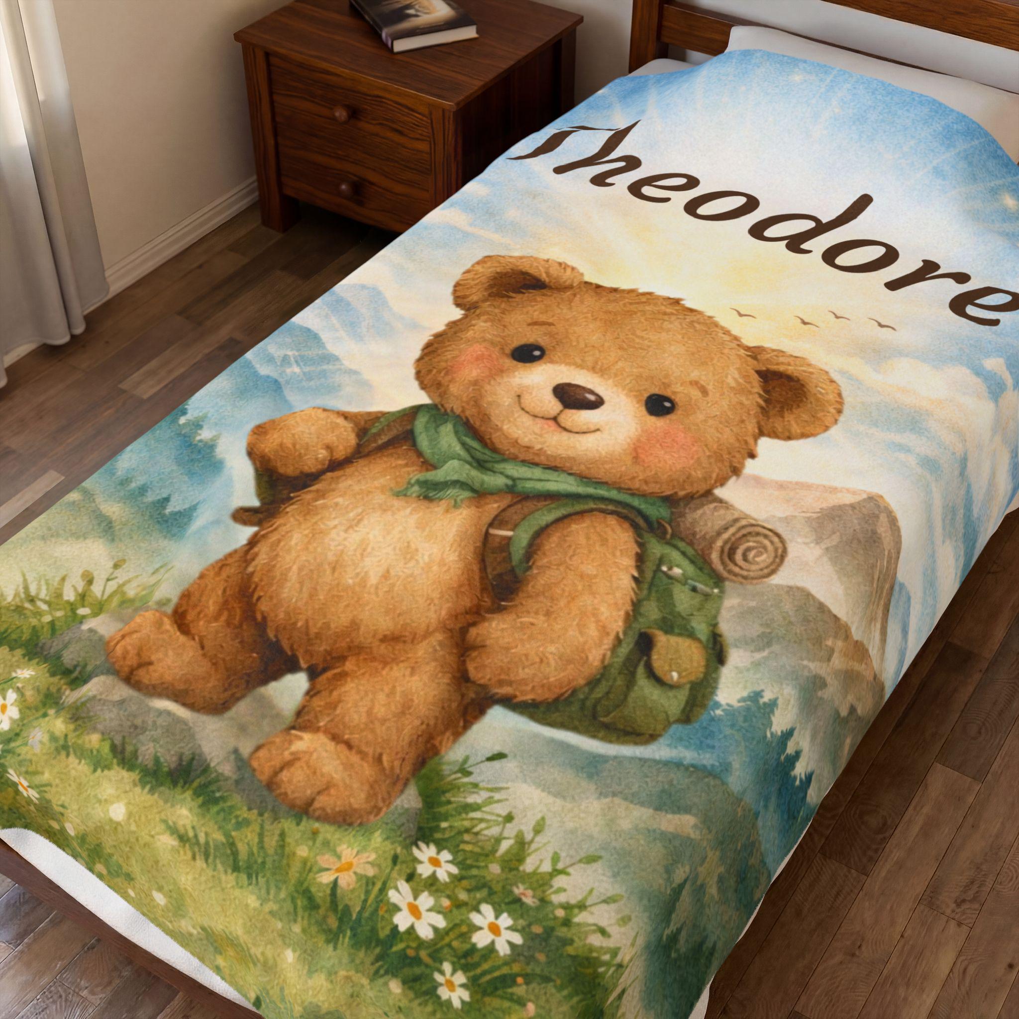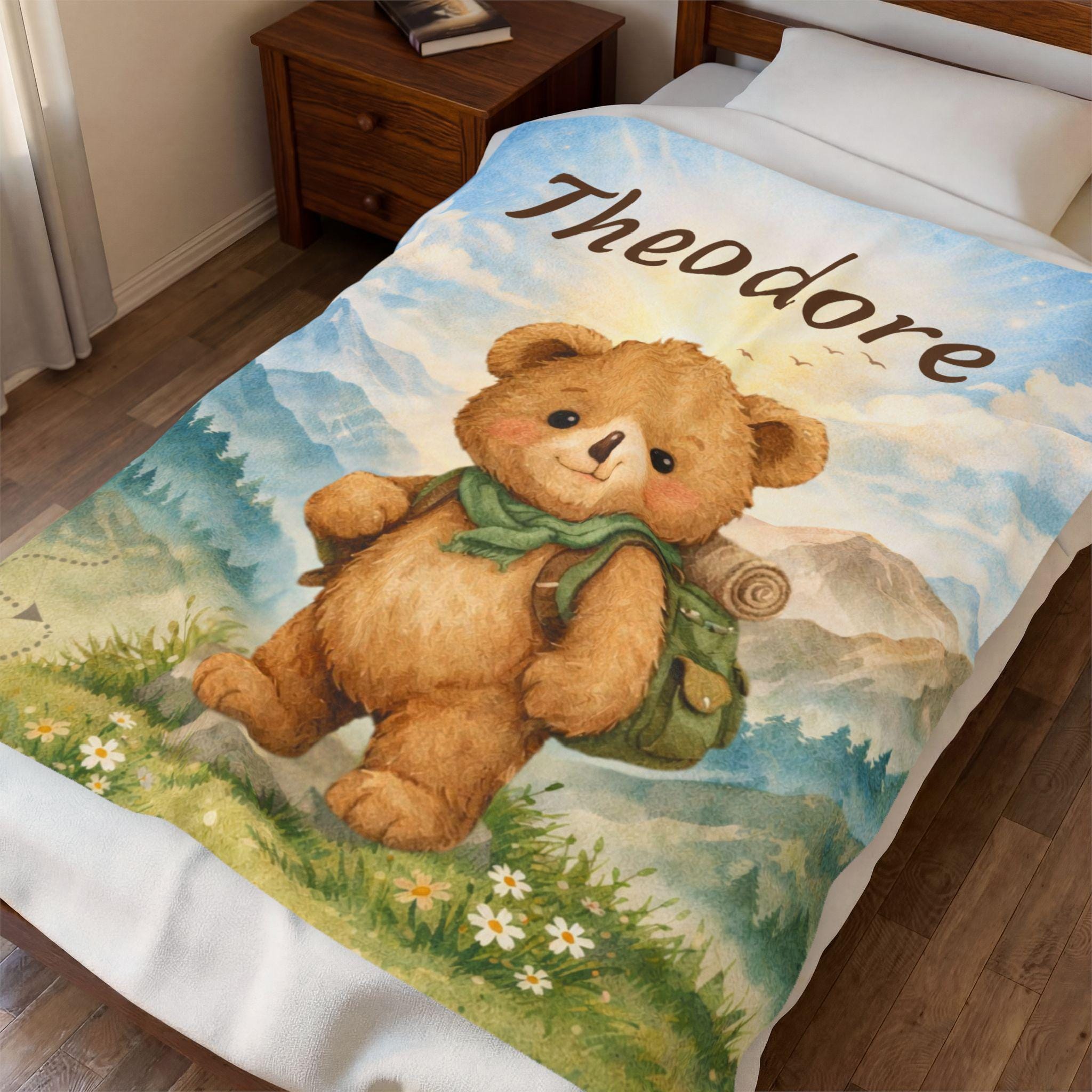 Celebrate your little one’s first adventures with this adorable personalized teddy bear baby blanket. Designed with a sweet explorer bear standing in a dreamy mountain landscape, this cozy velveteen blanket makes a meaningful keepsake gift for newborns, baby showers, and nursery decor.