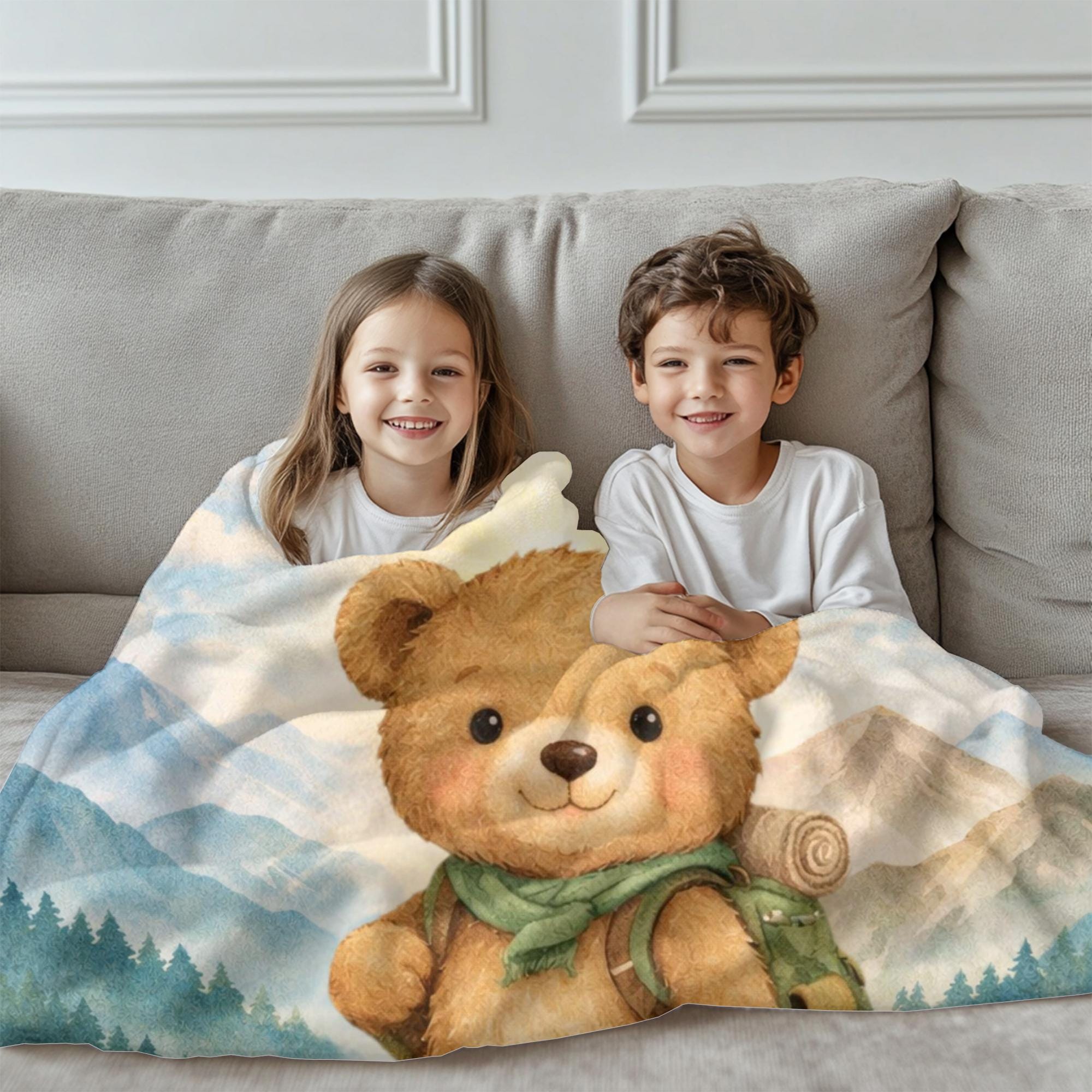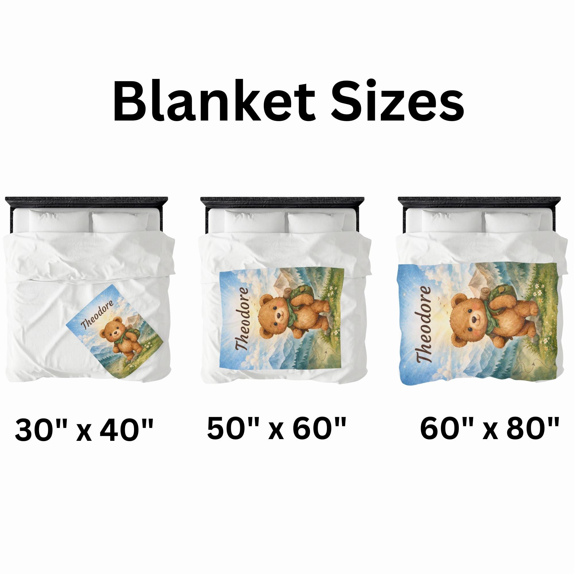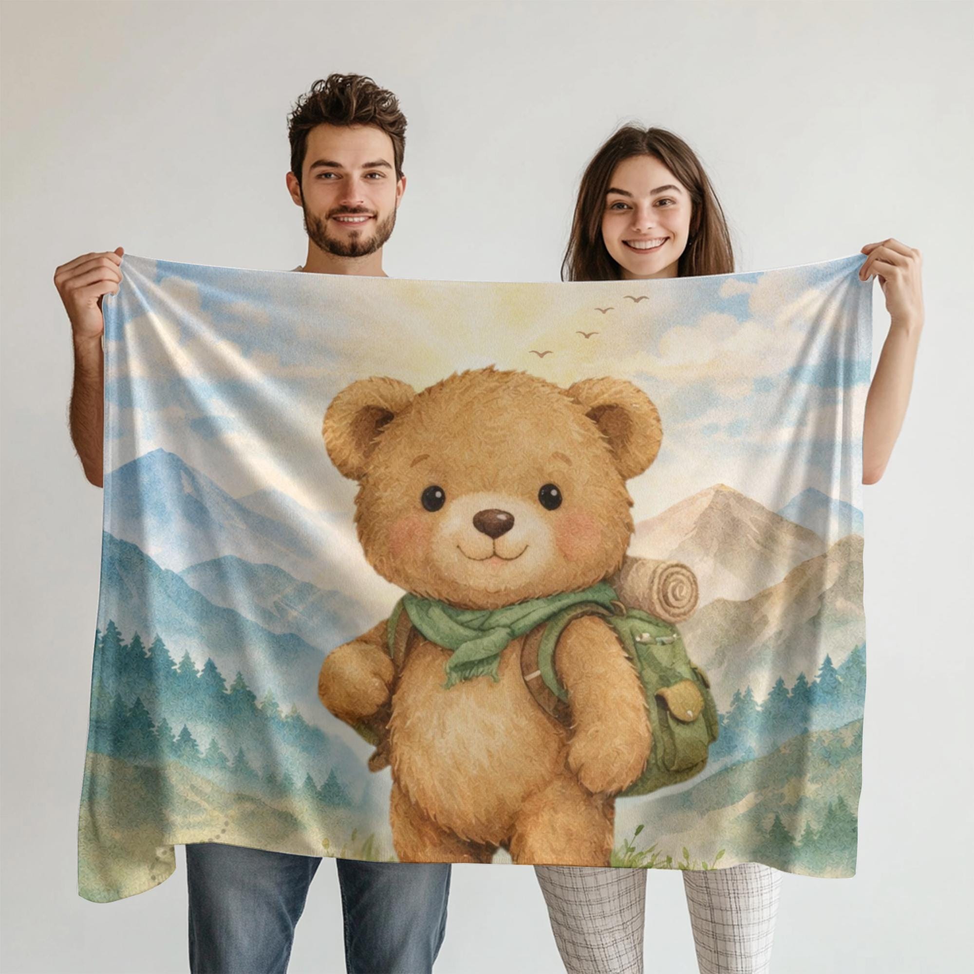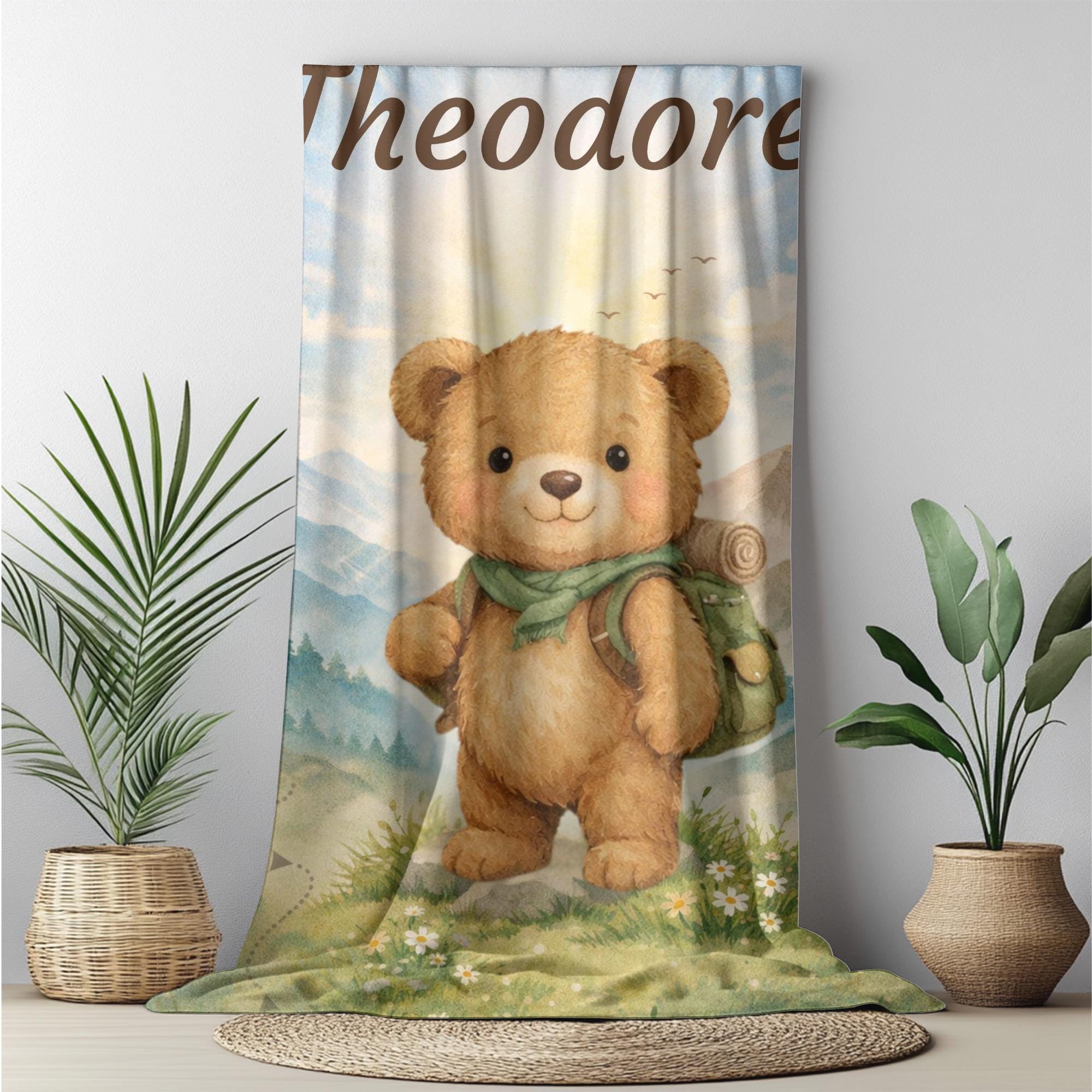 Celebrate your little one’s first adventures with this adorable personalized teddy bear baby blanket. Designed with a sweet explorer bear standing in a dreamy mountain landscape, this cozy velveteen blanket makes a meaningful keepsake gift for newborns, baby showers, and nursery decor.