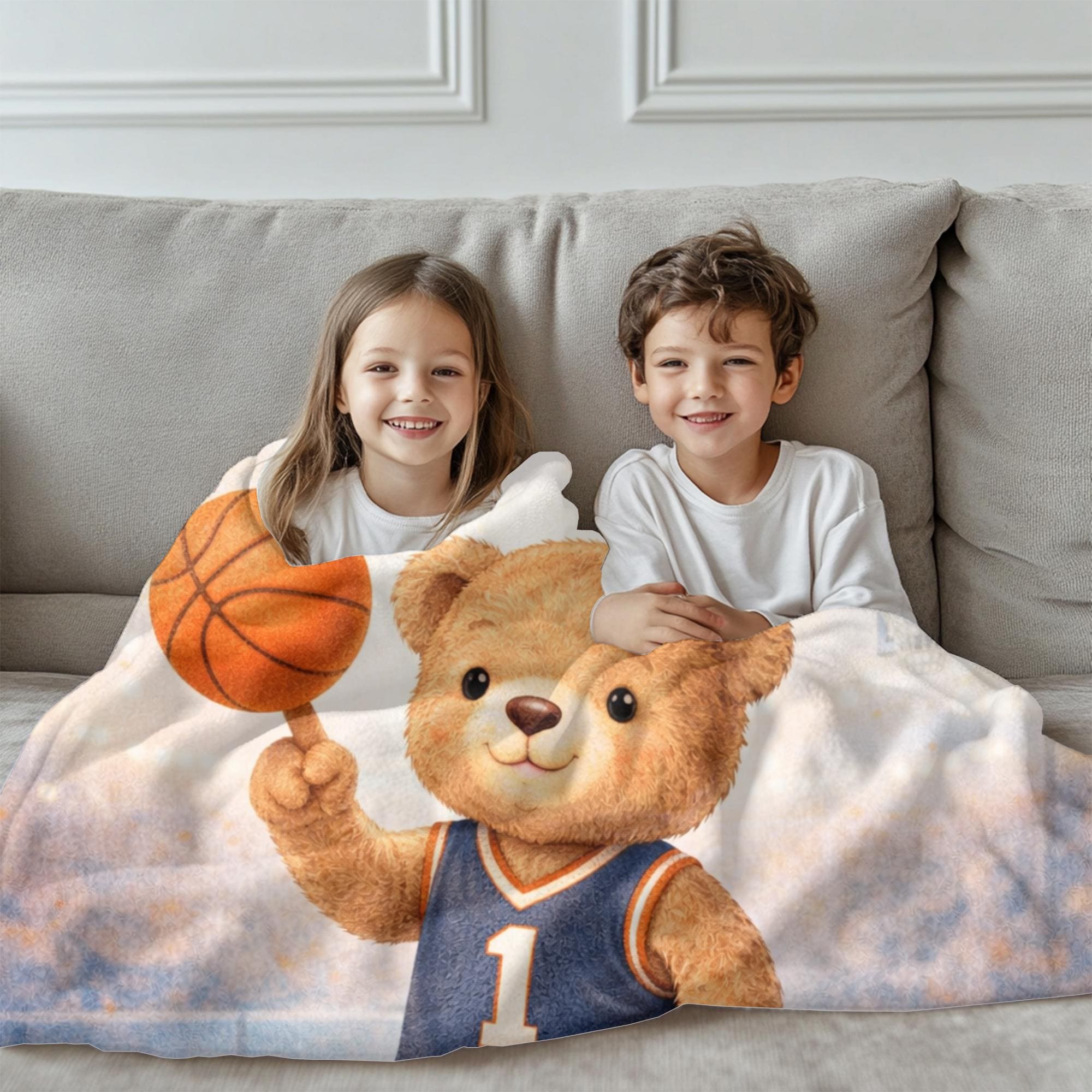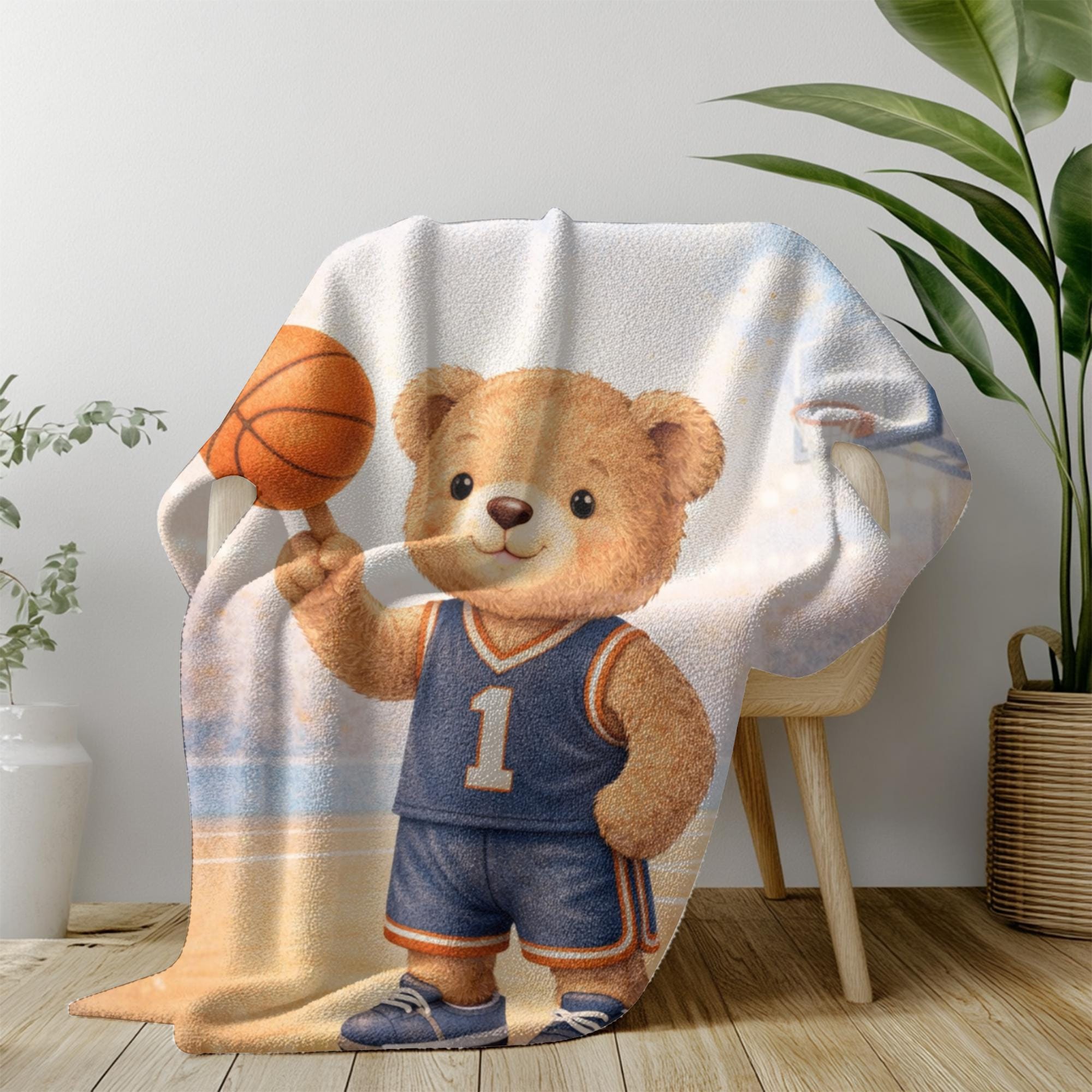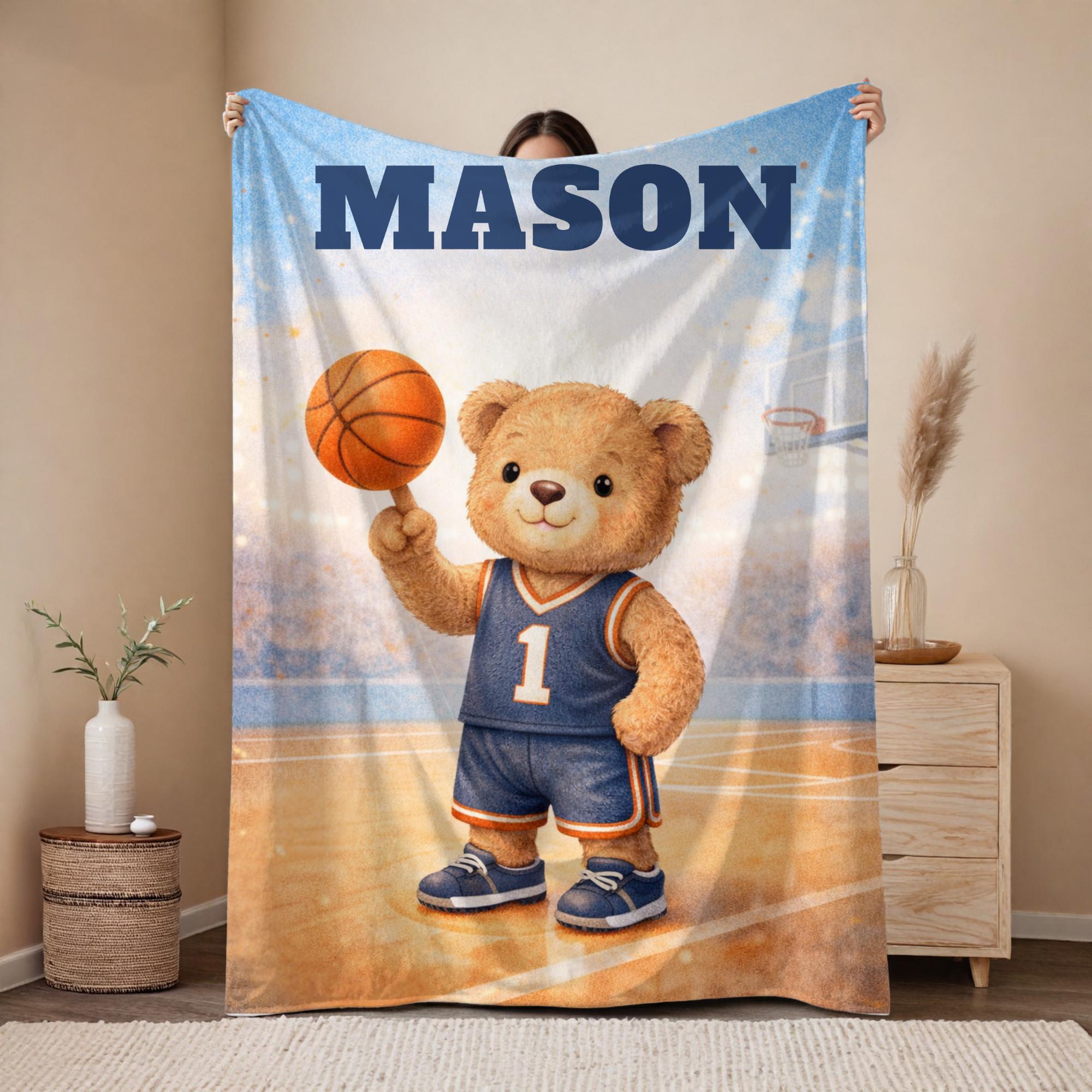 Celebrate your little athlete with this adorable personalized basketball teddy bear baby blanket. Featuring a playful bear spinning a basketball on a bright storybook court, this custom name blanket makes a meaningful keepsake for newborns and growing toddlers.