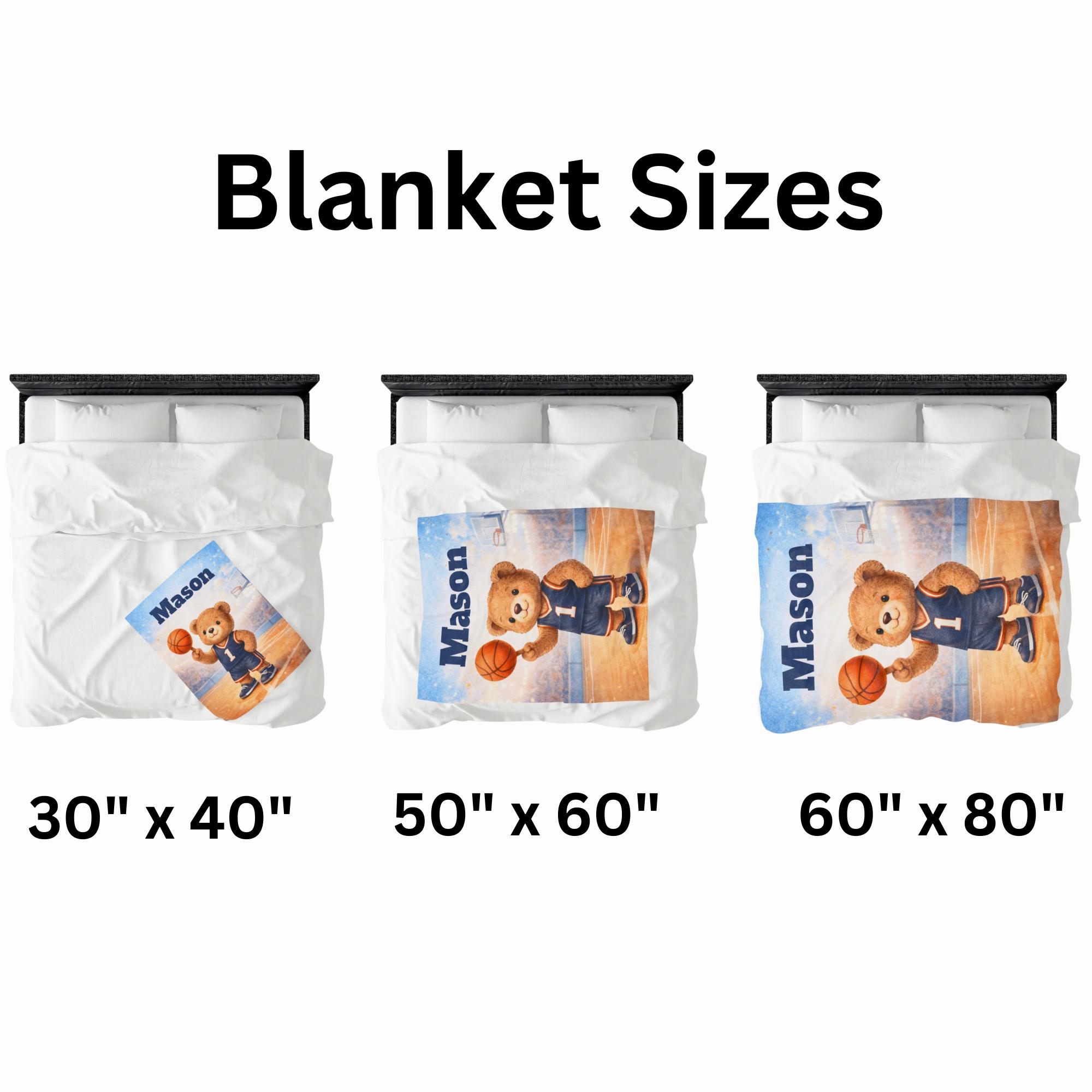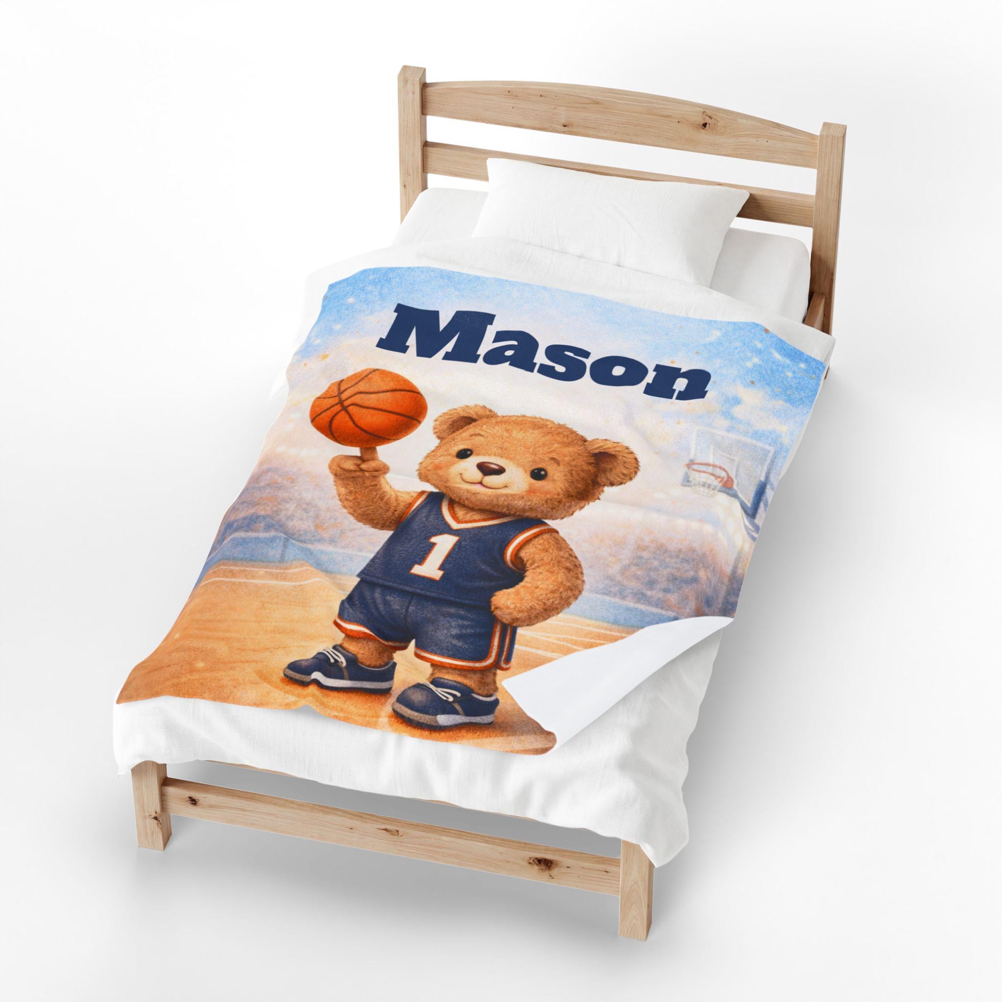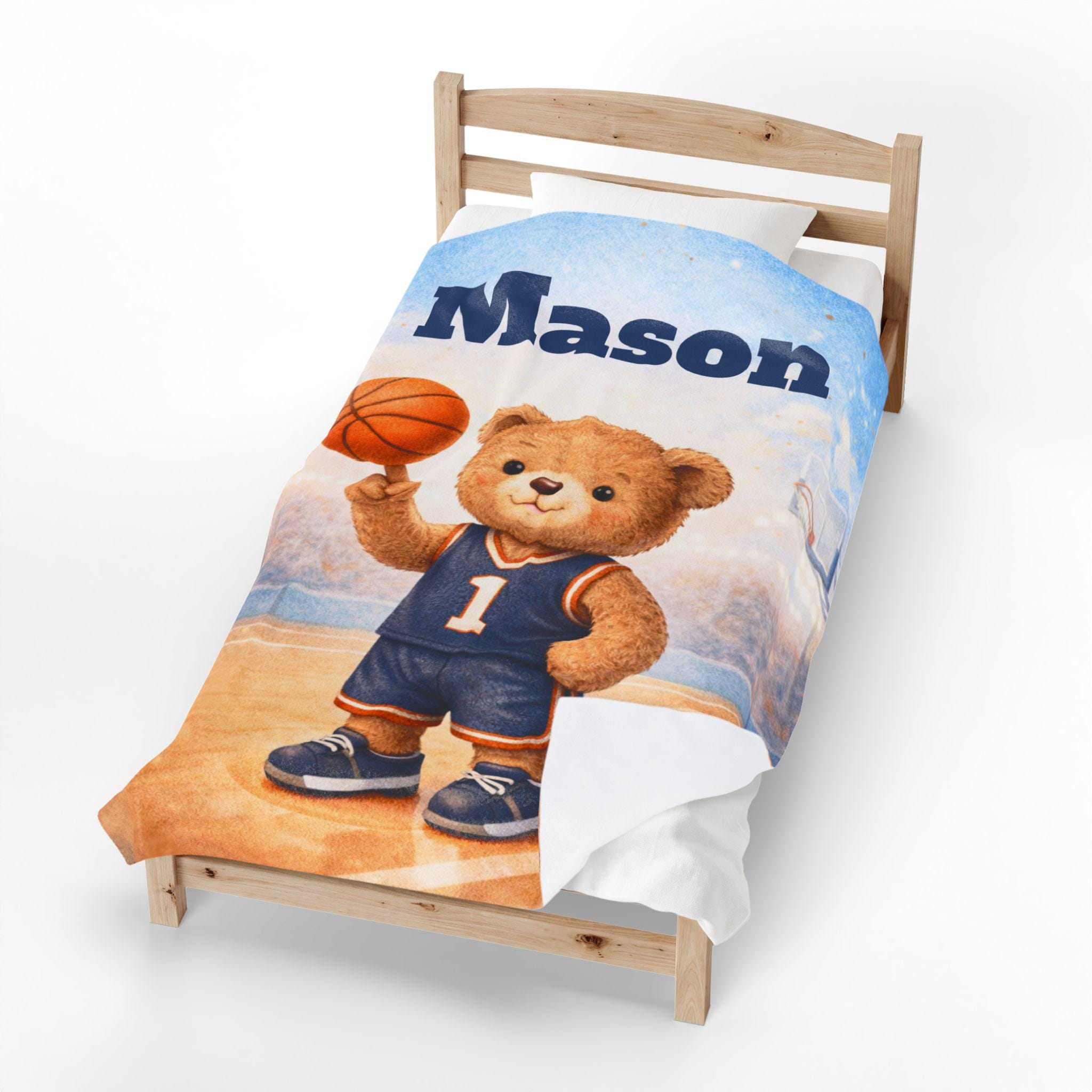 Celebrate your little athlete with this adorable personalized basketball teddy bear baby blanket. Featuring a playful bear spinning a basketball on a bright storybook court, this custom name blanket makes a meaningful keepsake for newborns and growing toddlers.