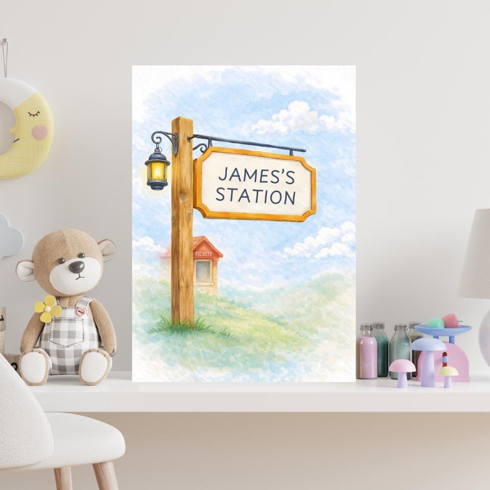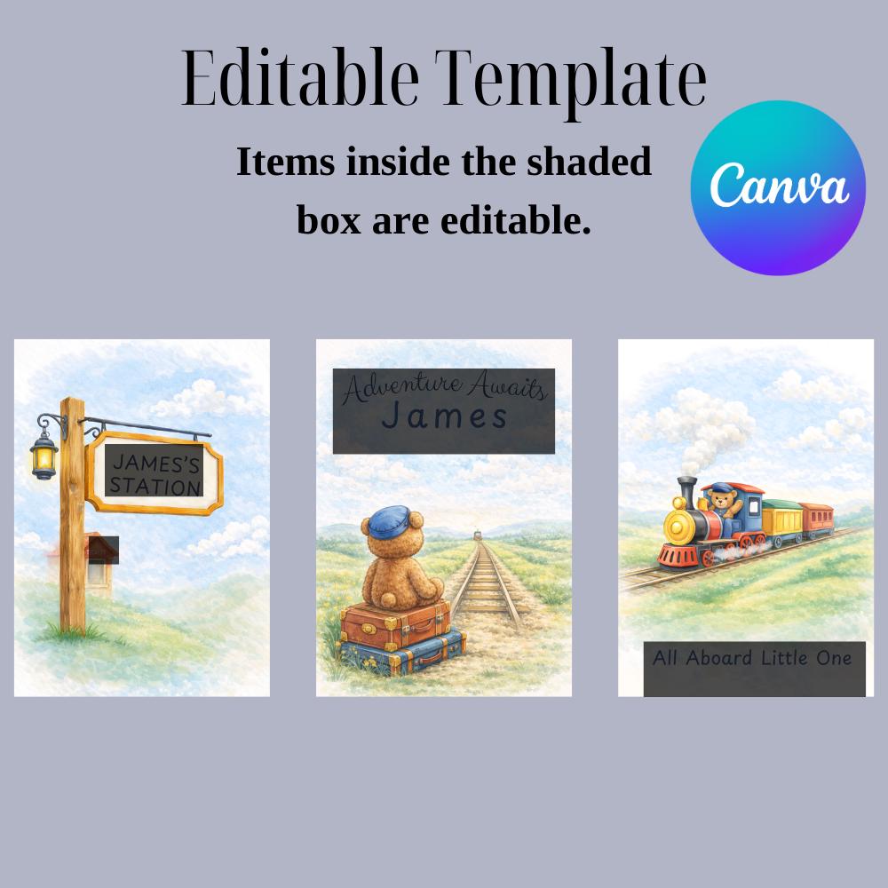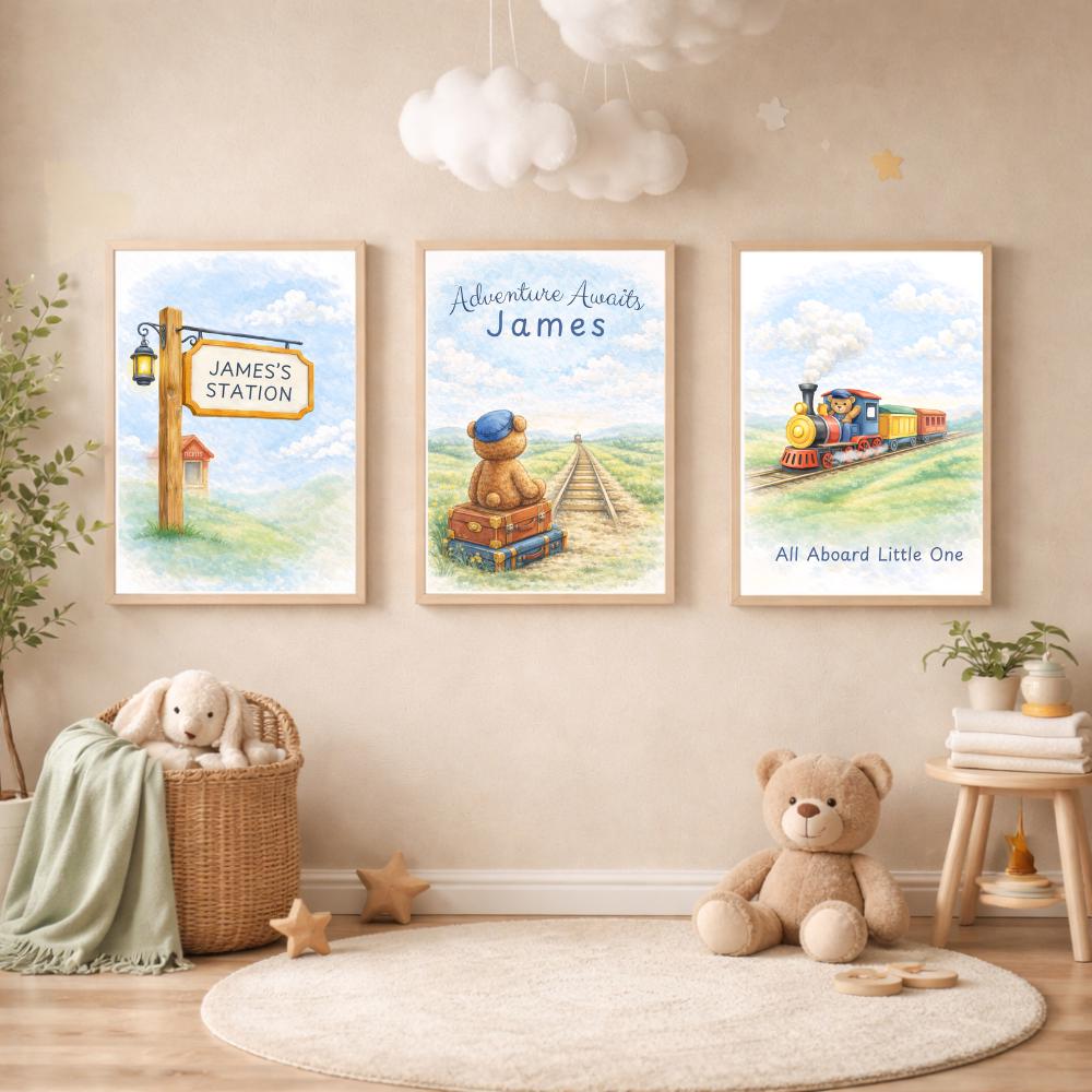 This coordinated set of three watercolor nursery prints features a personalized train station sign, a dreamy teddy bear traveler, and a cheerful vintage train journey scene.