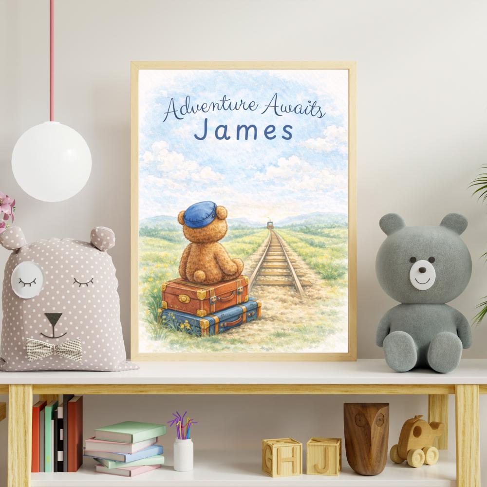 Perfect for parents who love travel themes, teddy bear decor, and nostalgic children’s book illustrations.