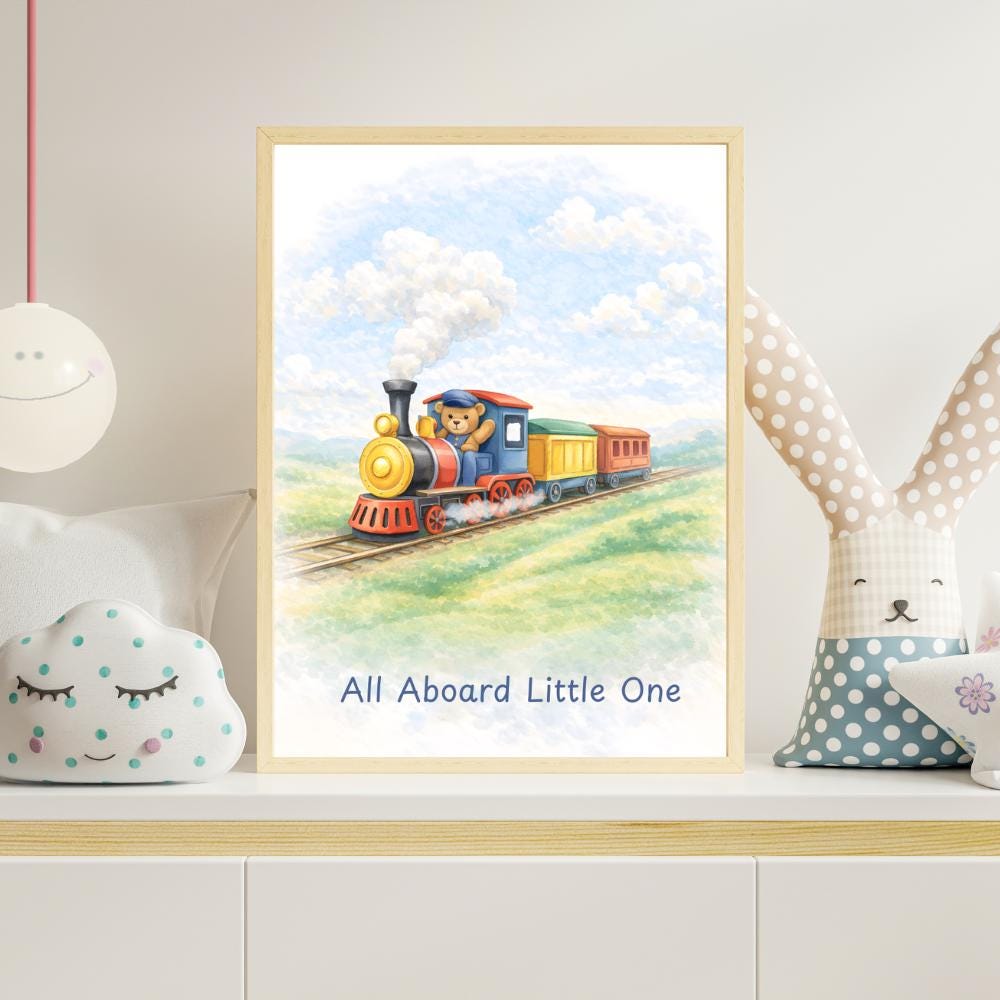 Create a sweet storybook adventure in your little one’s nursery with this charming train wall art set.
