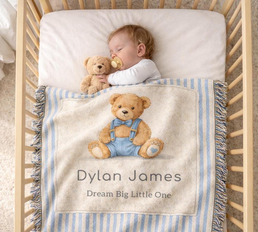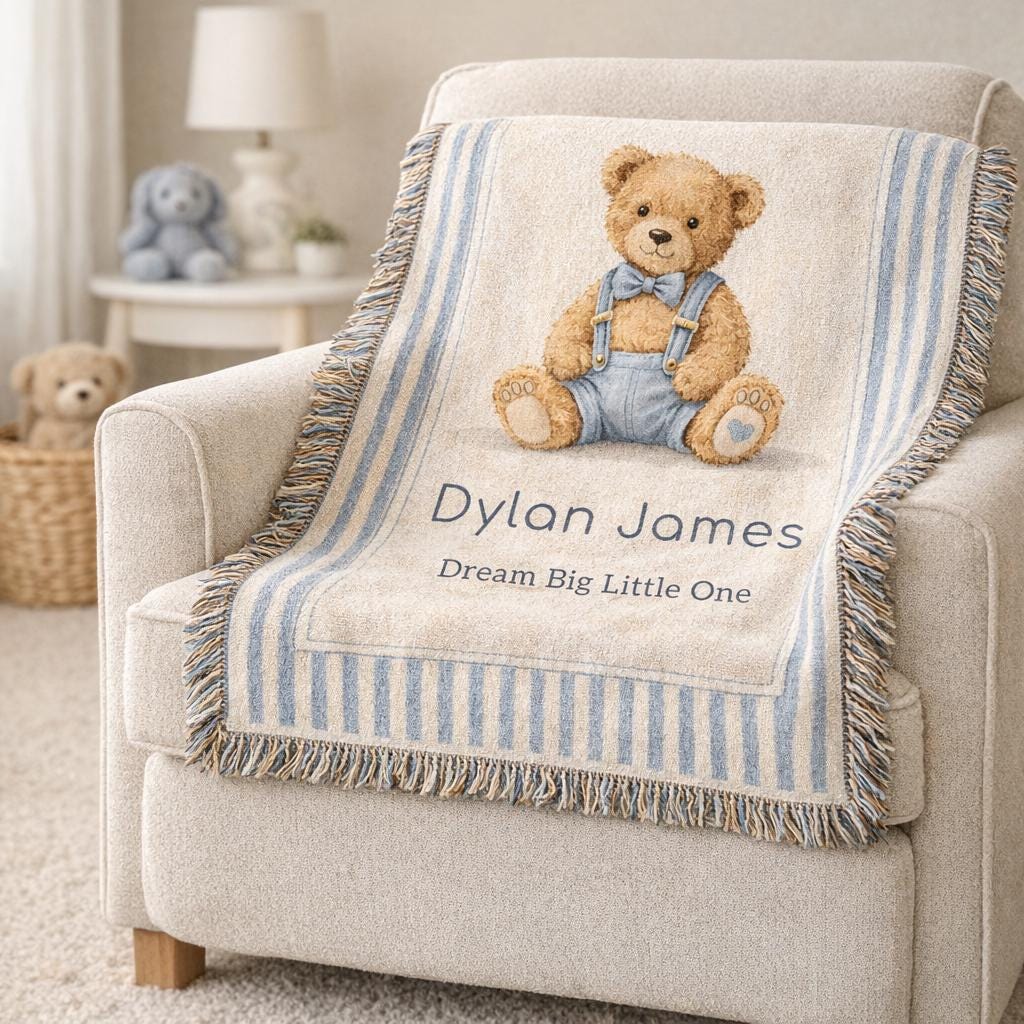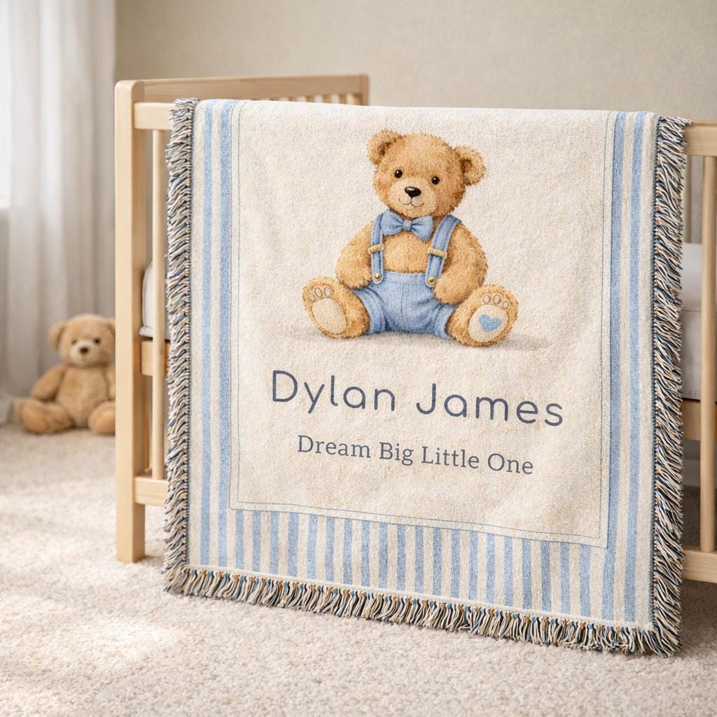 Wrap your little one in timeless charm with this personalized vintage teddy bear baby blanket. Designed with a classic heirloom feel, this woven blanket features a sweet storybook teddy dressed in soft blue suspenders and bow tie, creating a cozy and nostalgic nursery look.