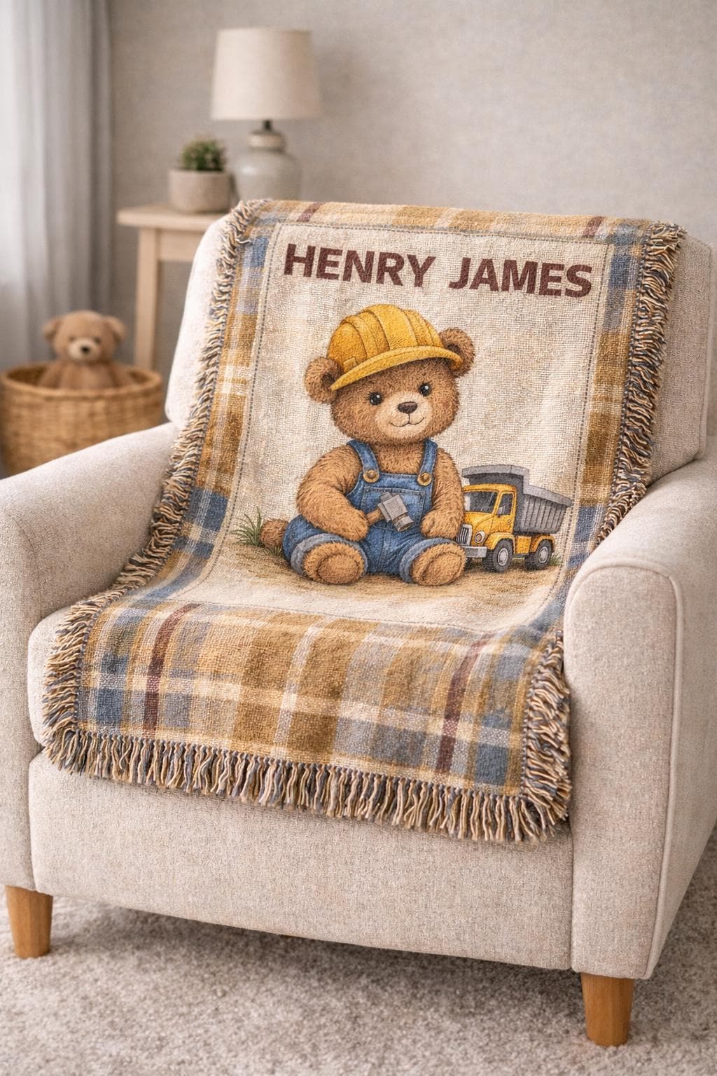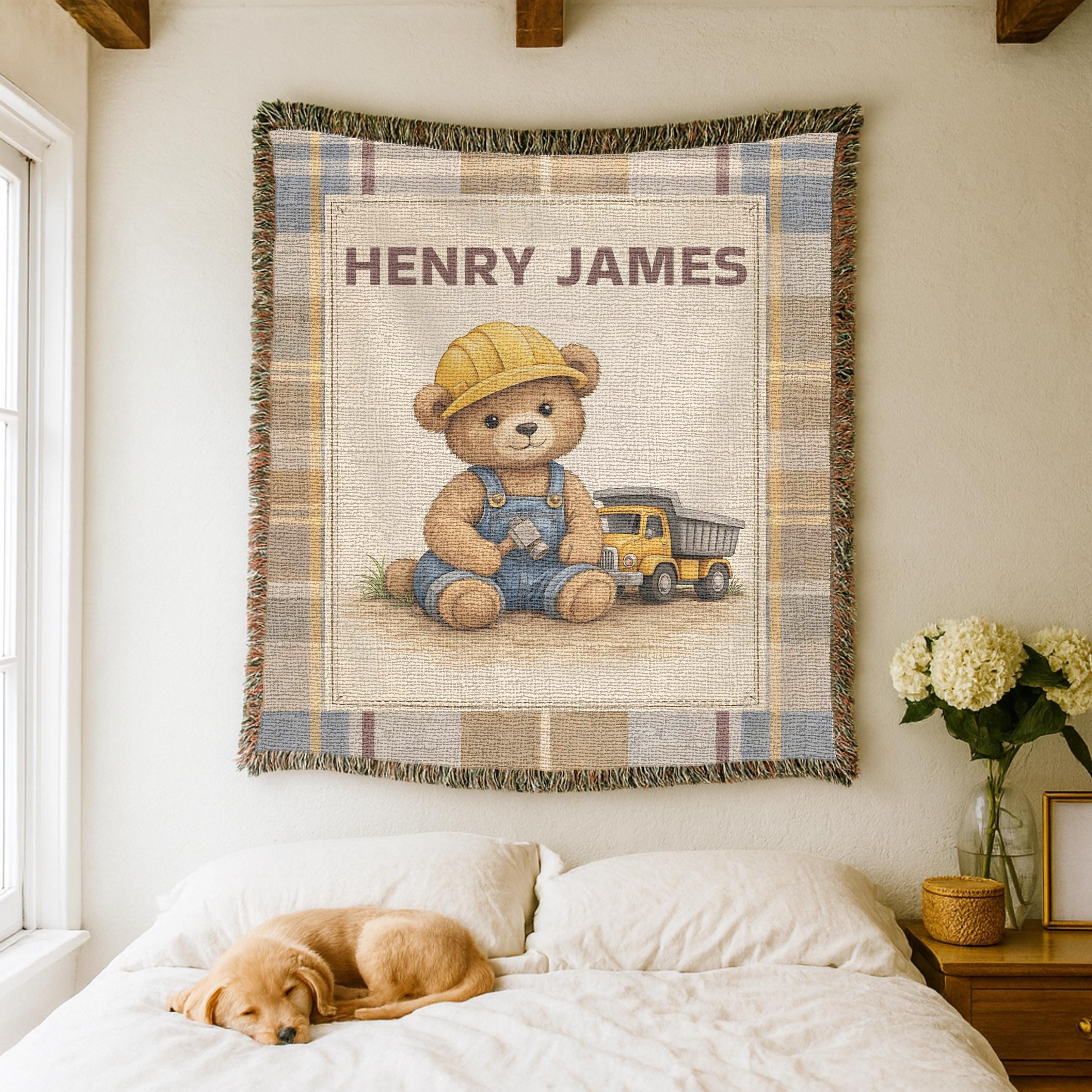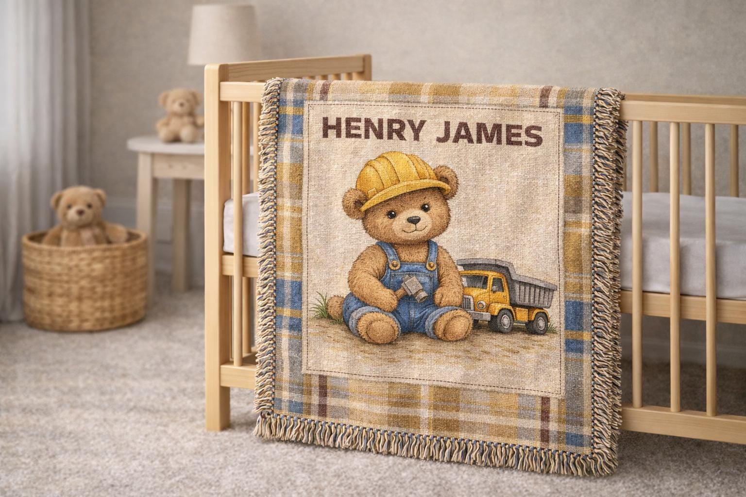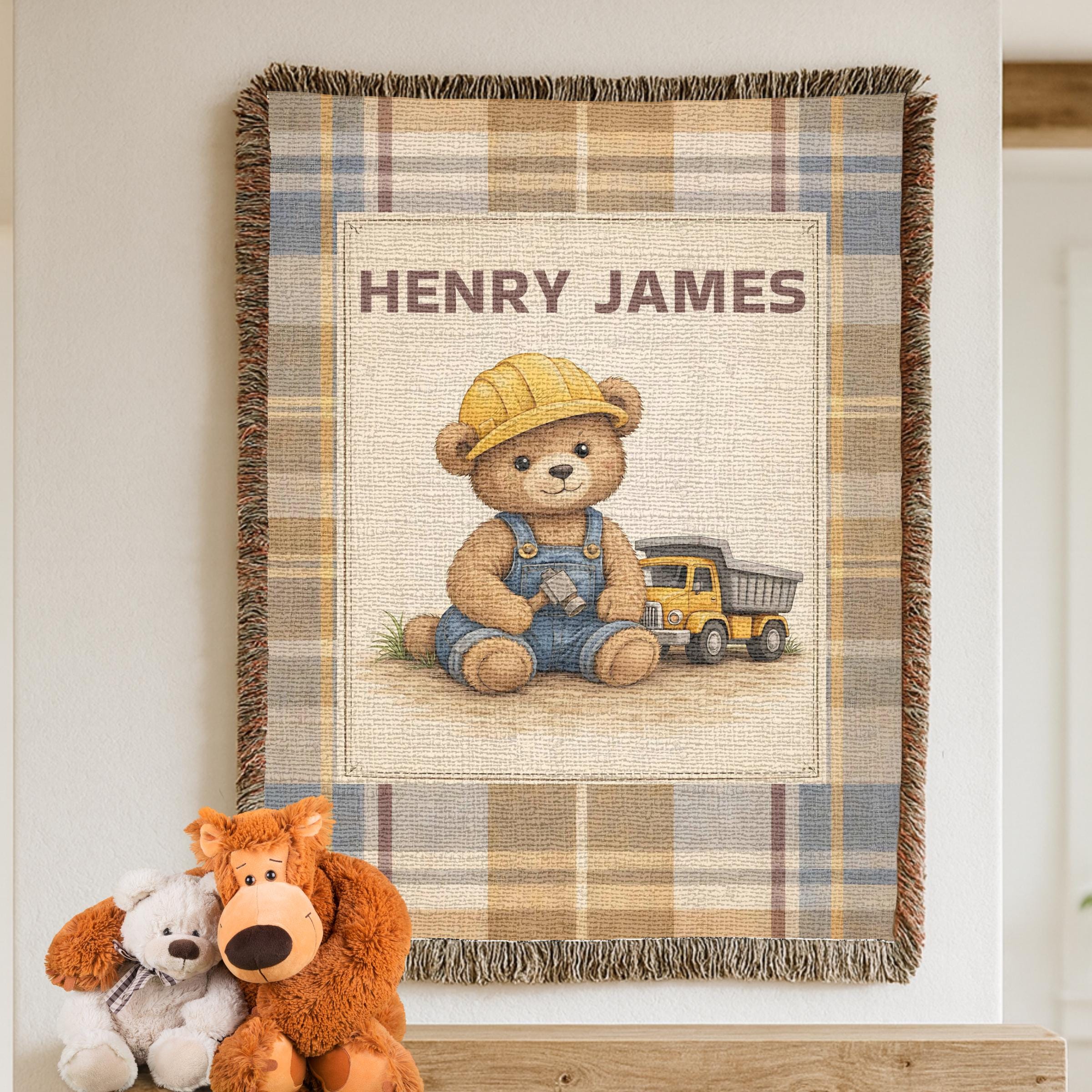 Create a cozy and meaningful nursery keepsake with this personalized vintage construction teddy bear blanket. Featuring a classic plaid background and an adorable little builder bear, this blanket brings warmth, charm, and timeless nursery style to any baby boy’s room.