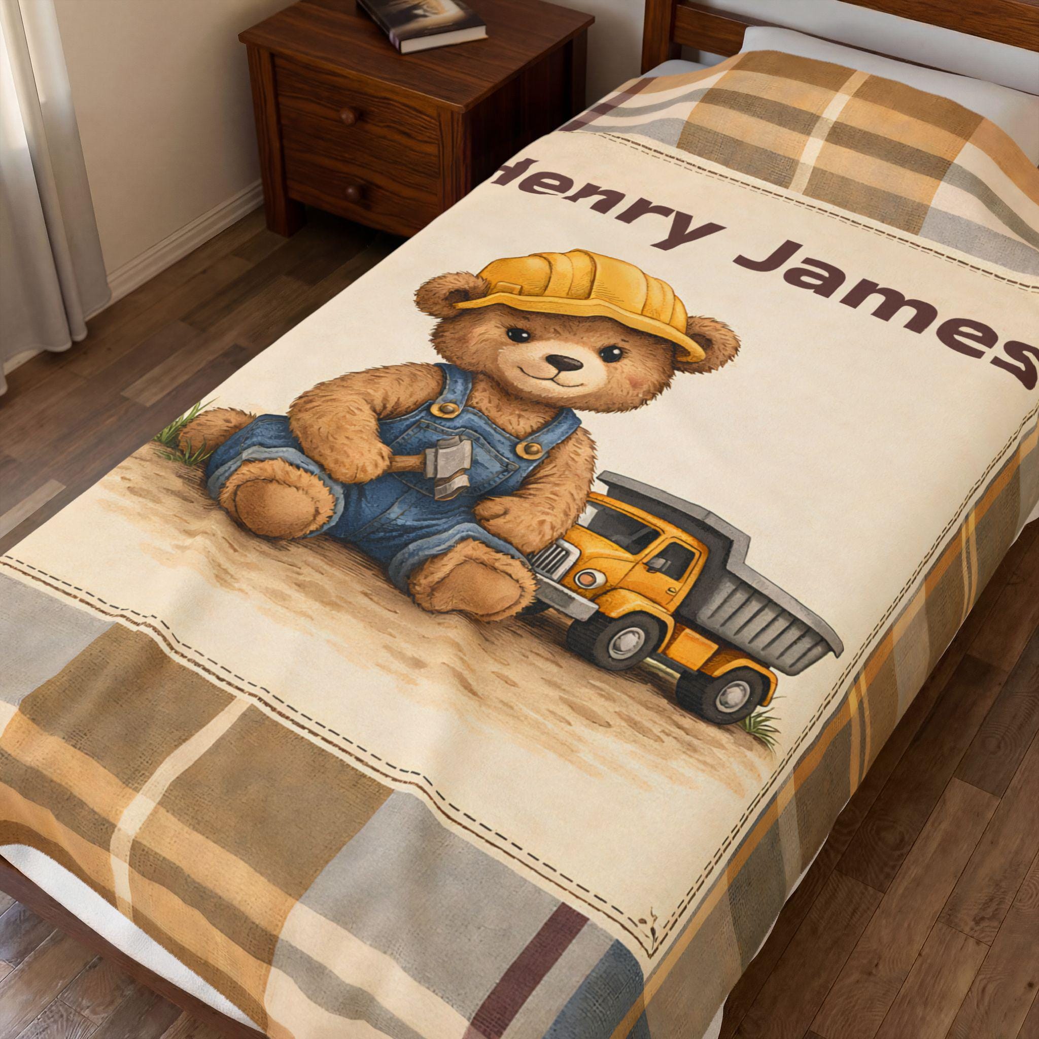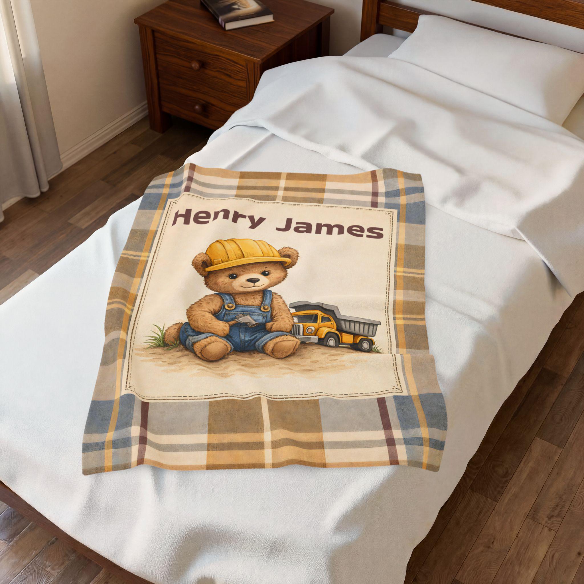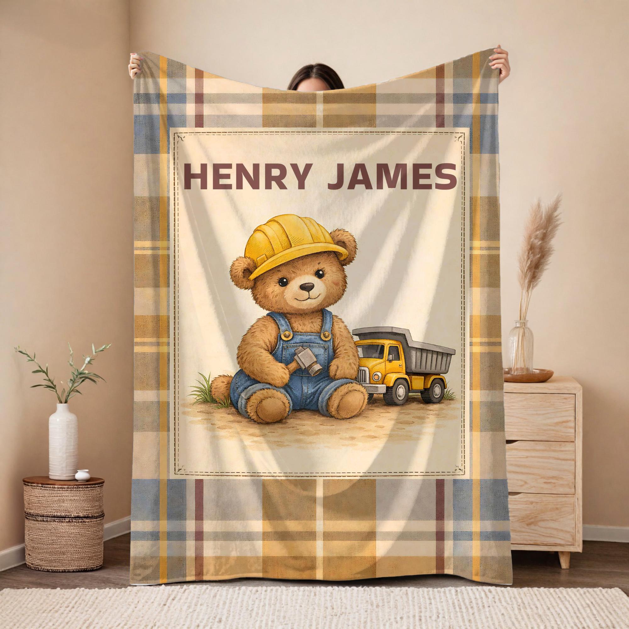 Wrap your little one in comfort and timeless nursery charm with this personalized construction teddy bear velveteen blanket. Designed with a soft vintage plaid background and an adorable little builder bear, this custom name blanket adds warmth, personality, and cozy style to any baby boy’s nursery.