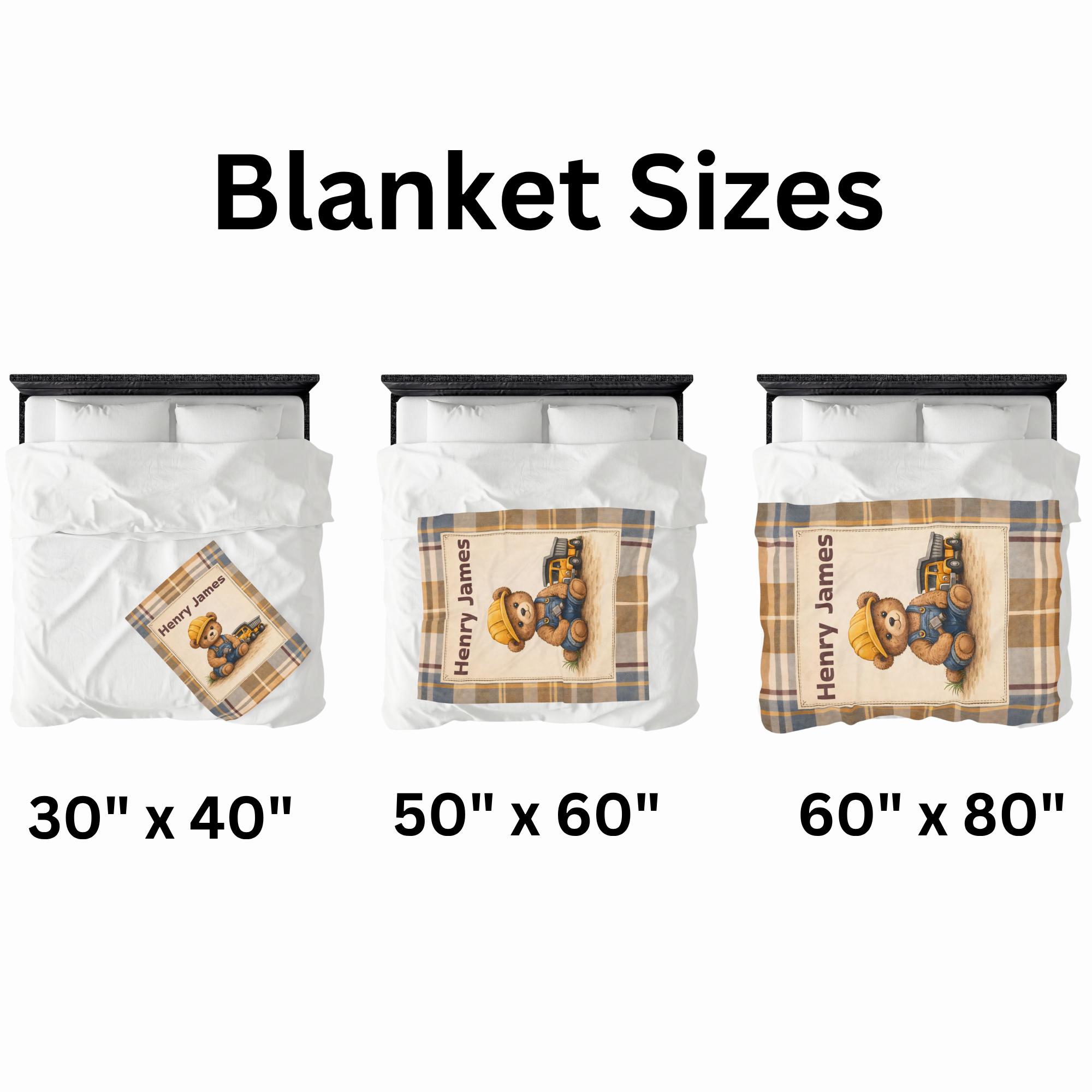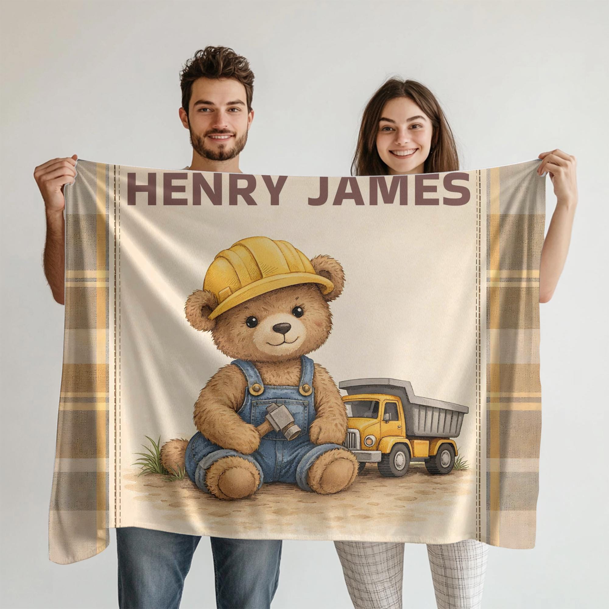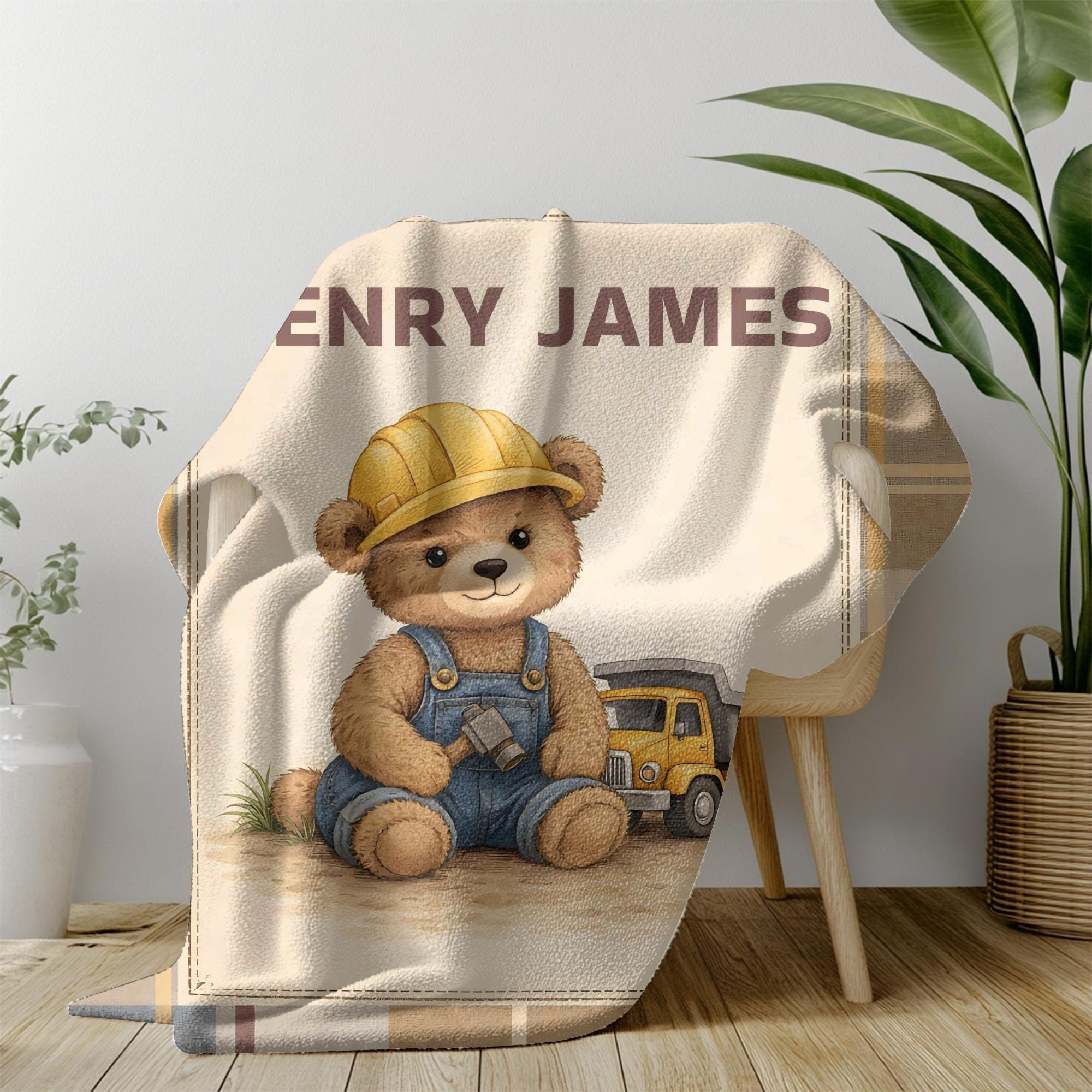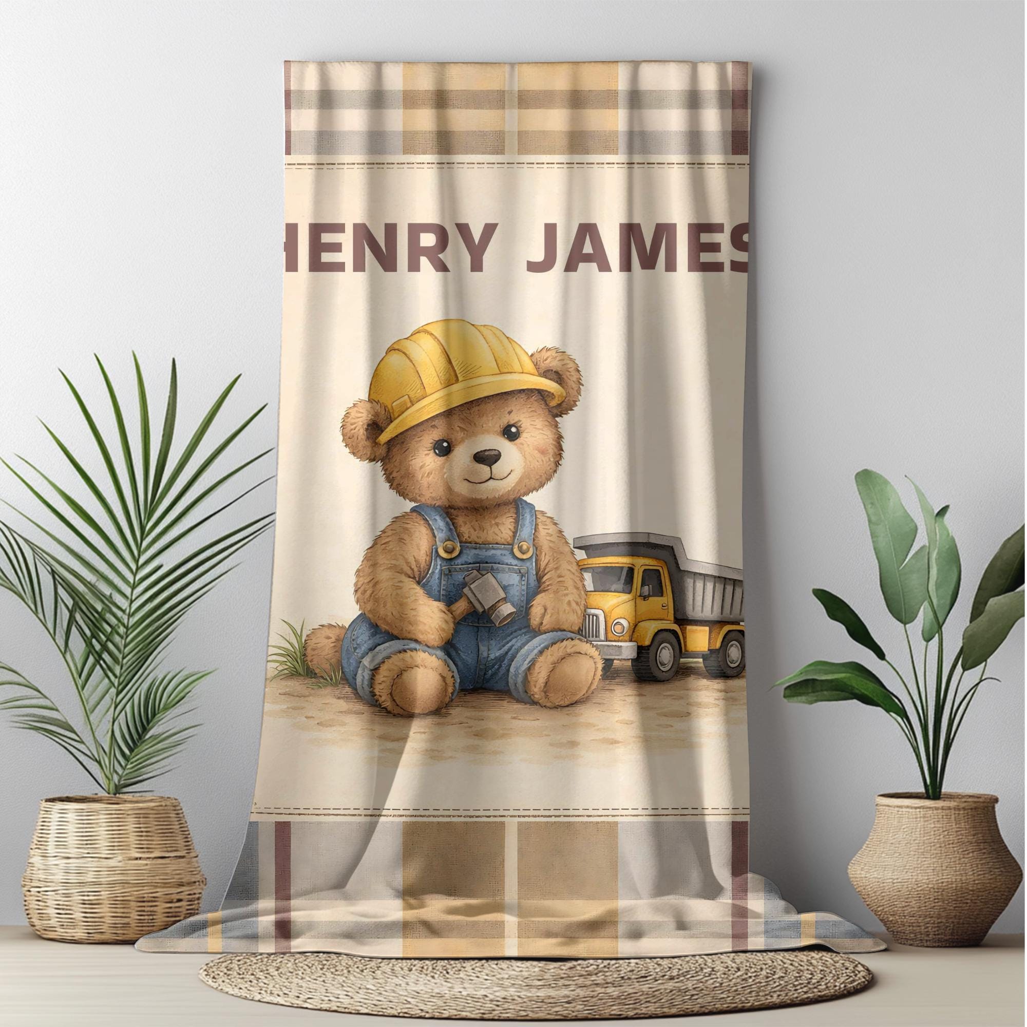 Wrap your little one in comfort and timeless nursery charm with this personalized construction teddy bear velveteen blanket. Designed with a soft vintage plaid background and an adorable little builder bear, this custom name blanket adds warmth, personality, and cozy style to any baby boy’s nursery.