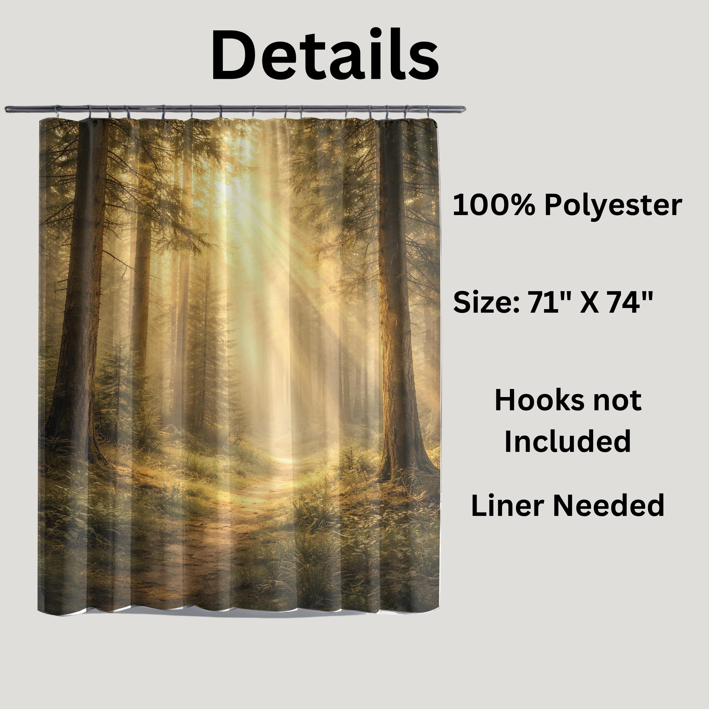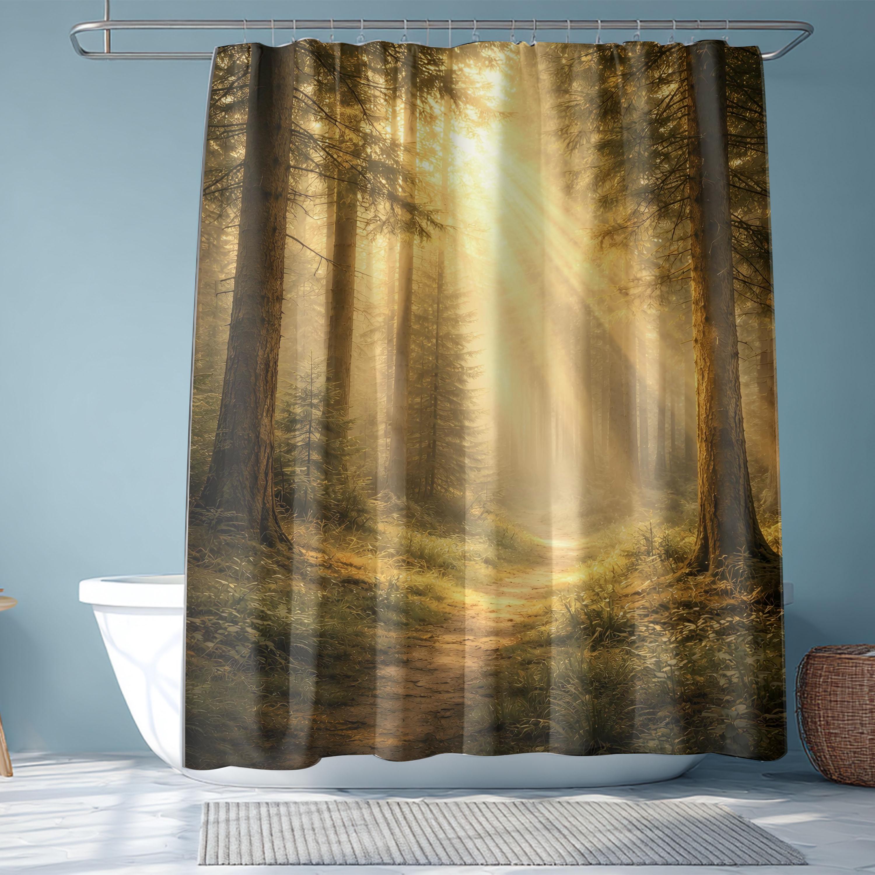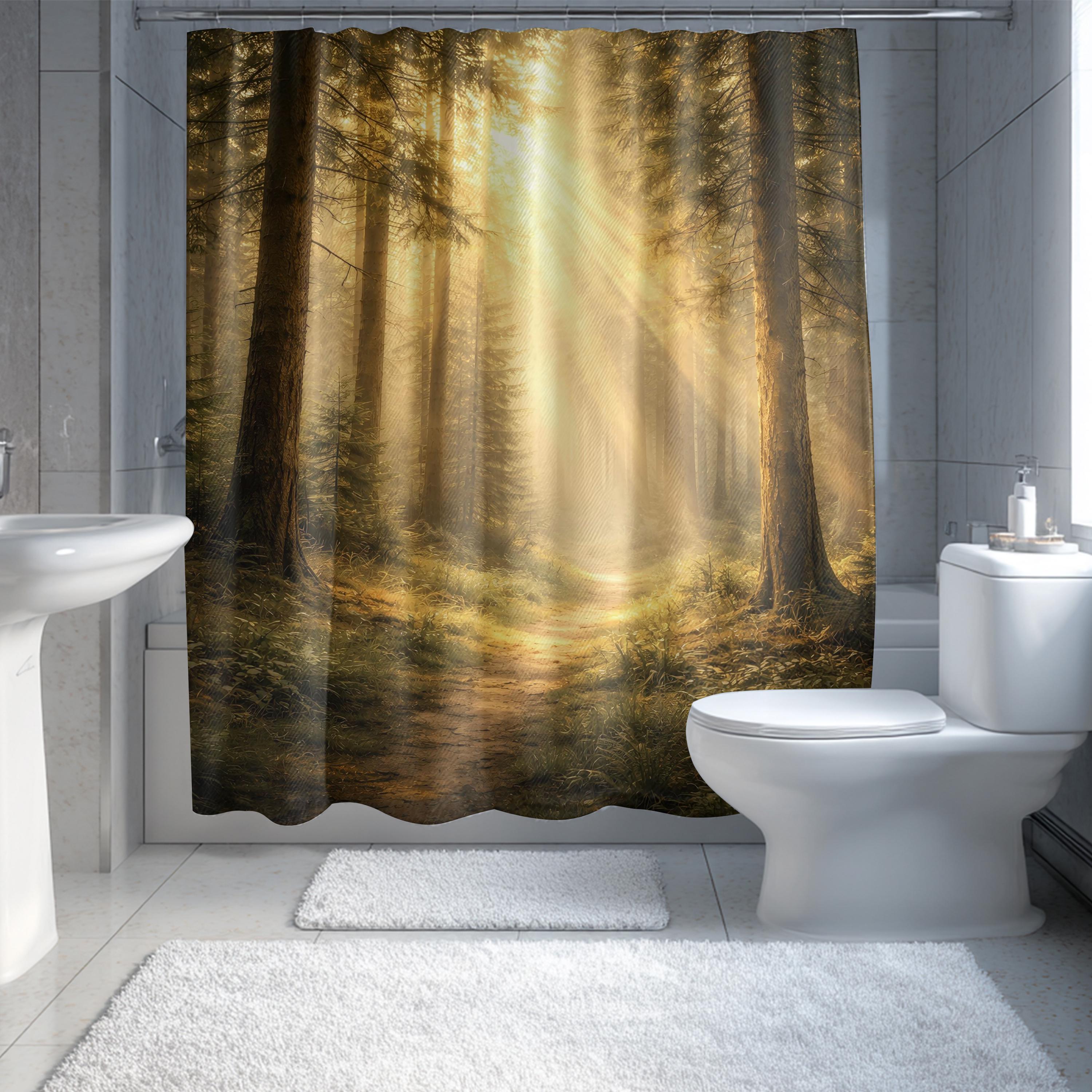 Transform your bathroom into a peaceful woodland retreat with this rustic forest shower curtain. Featuring warm golden sunlight filtering through towering trees and a quiet path leading into the forest, this design creates a calming and immersive atmosphere in your space.