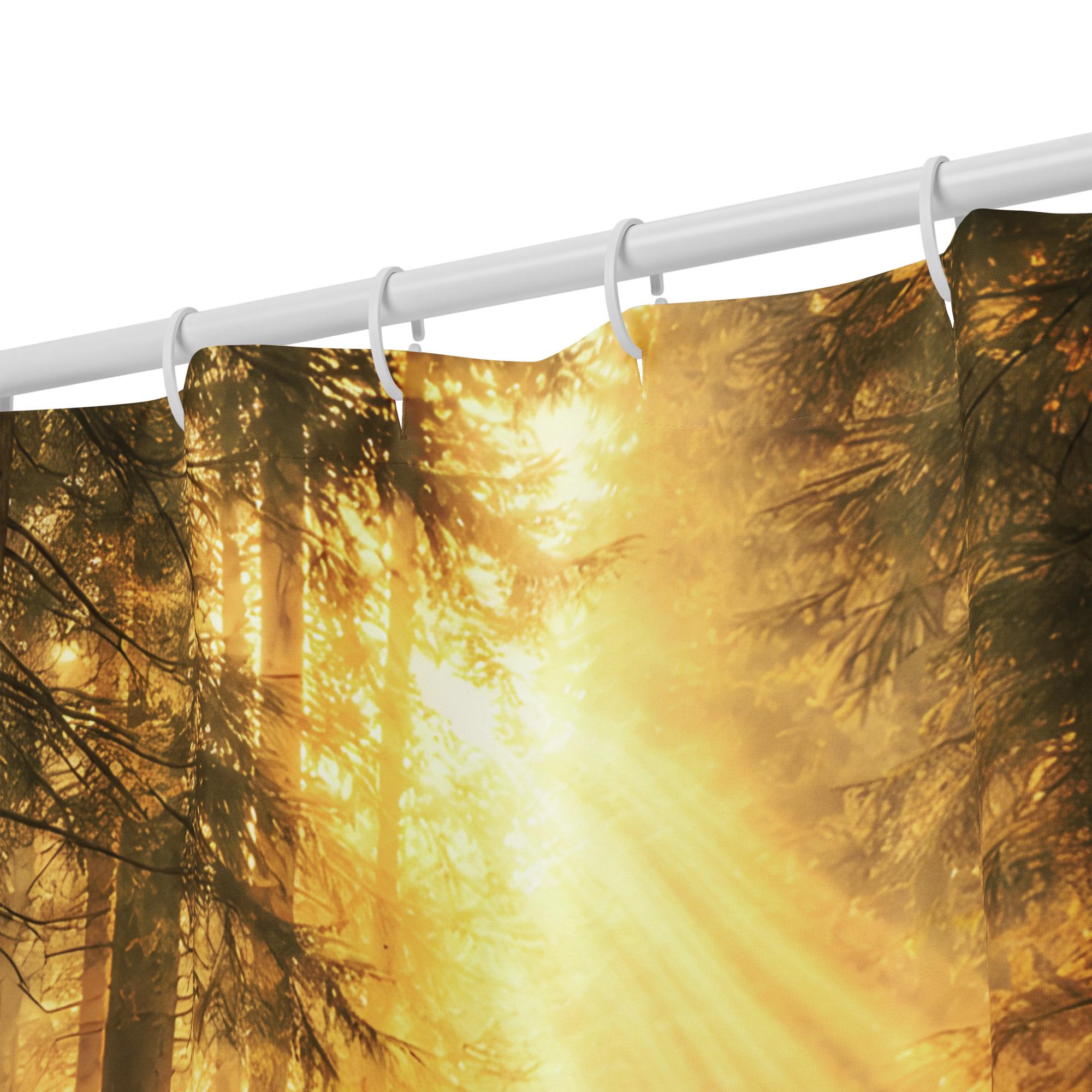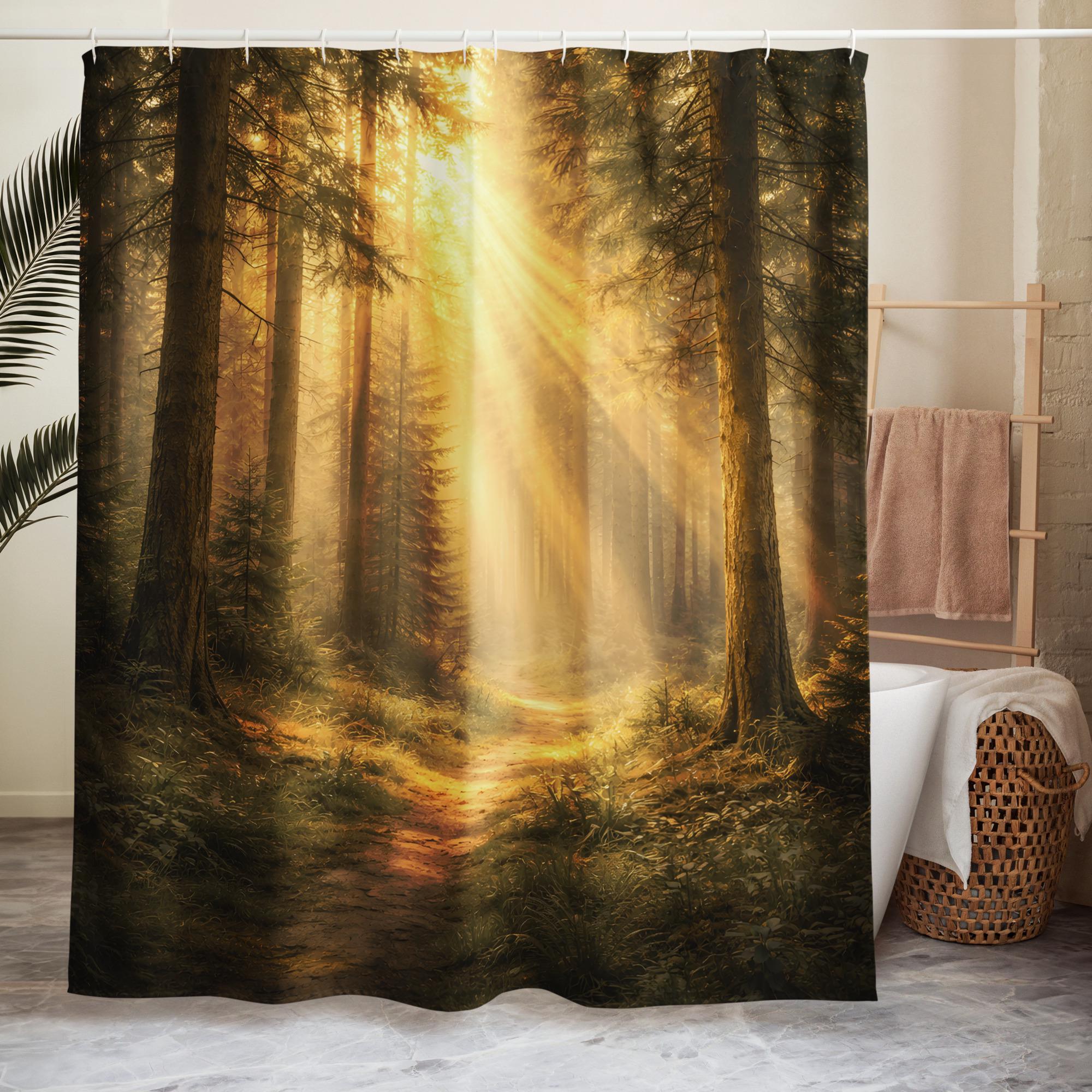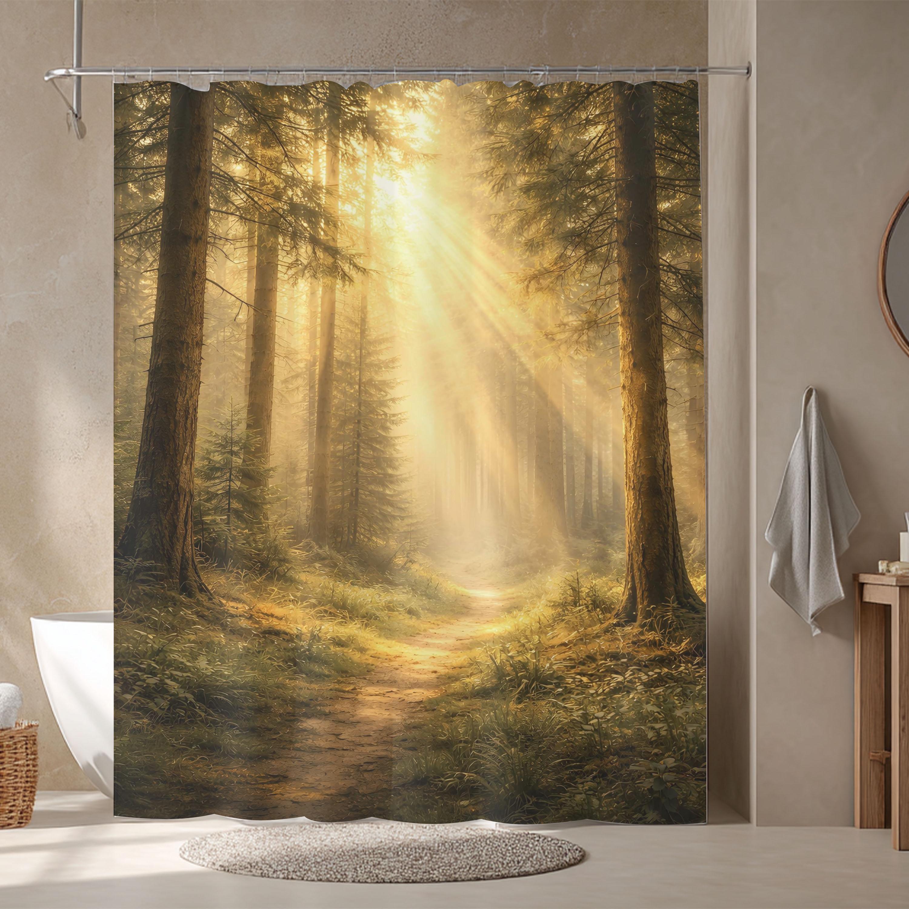 Transform your bathroom into a peaceful woodland retreat with this rustic forest shower curtain. Featuring warm golden sunlight filtering through towering trees and a quiet path leading into the forest, this design creates a calming and immersive atmosphere in your space.