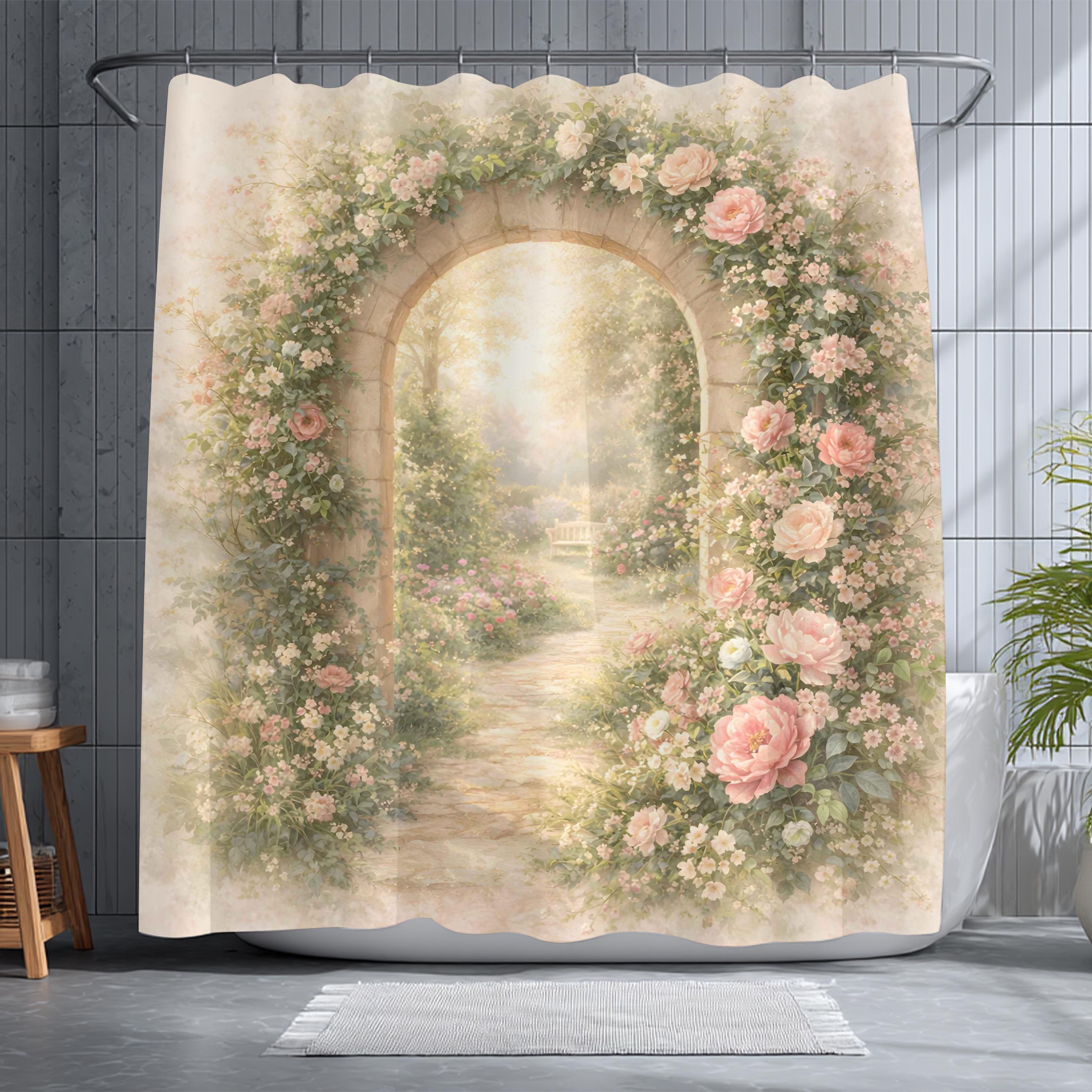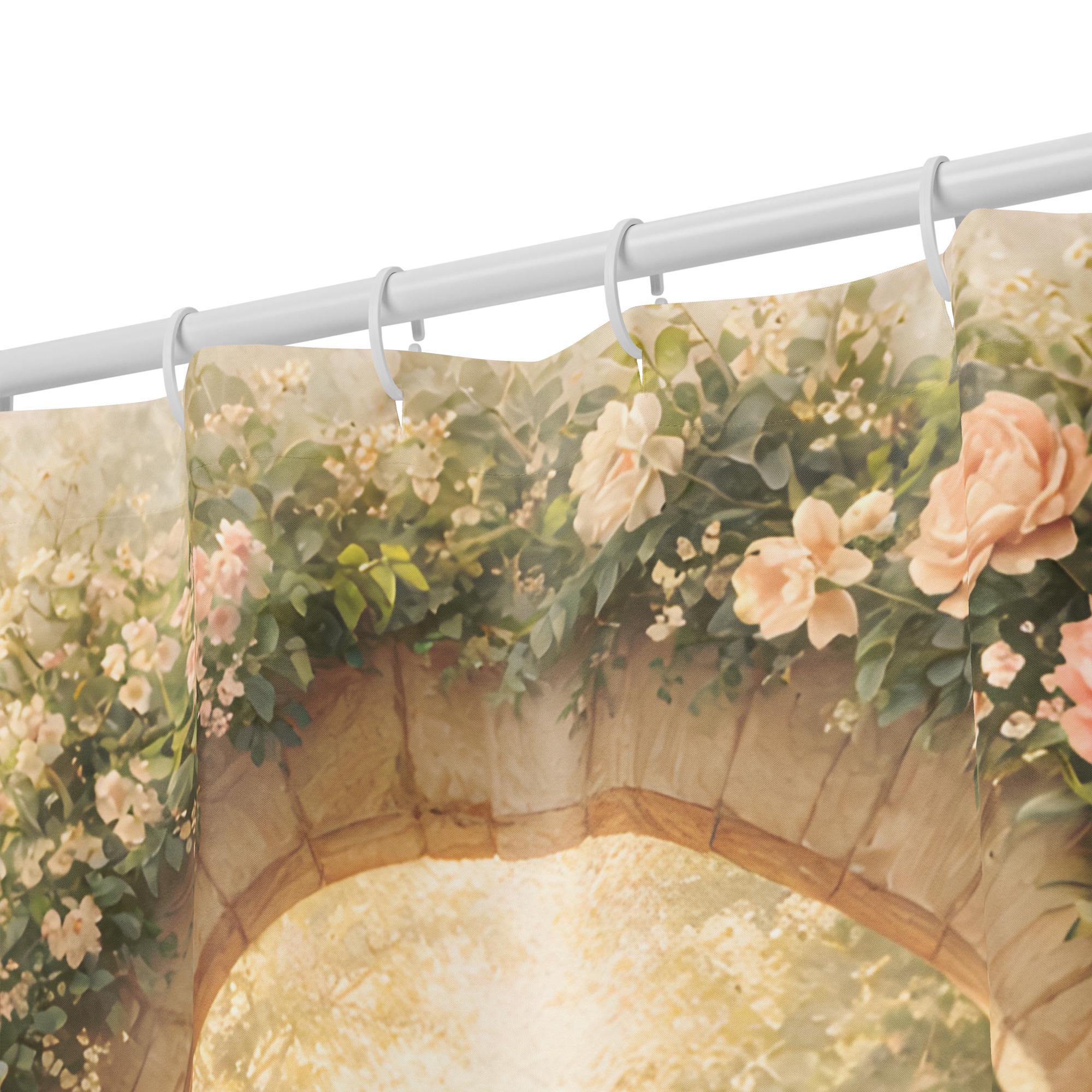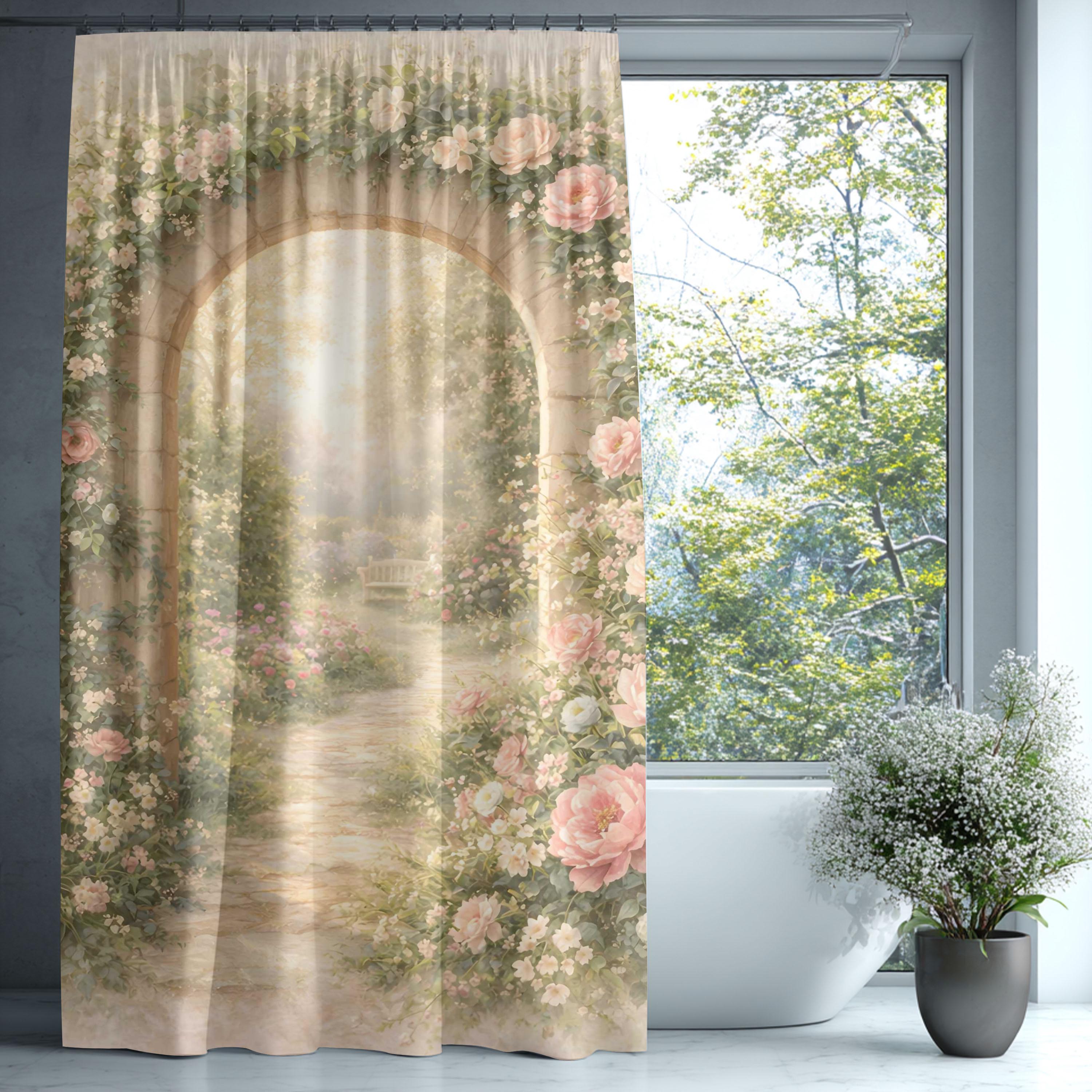 Step into a peaceful escape every time you enter your bathroom with this secret garden shower curtain. Designed with a romantic floral arch and a softly glowing garden path, this piece creates the feeling of walking into a hidden garden filled with light, warmth, and calm.