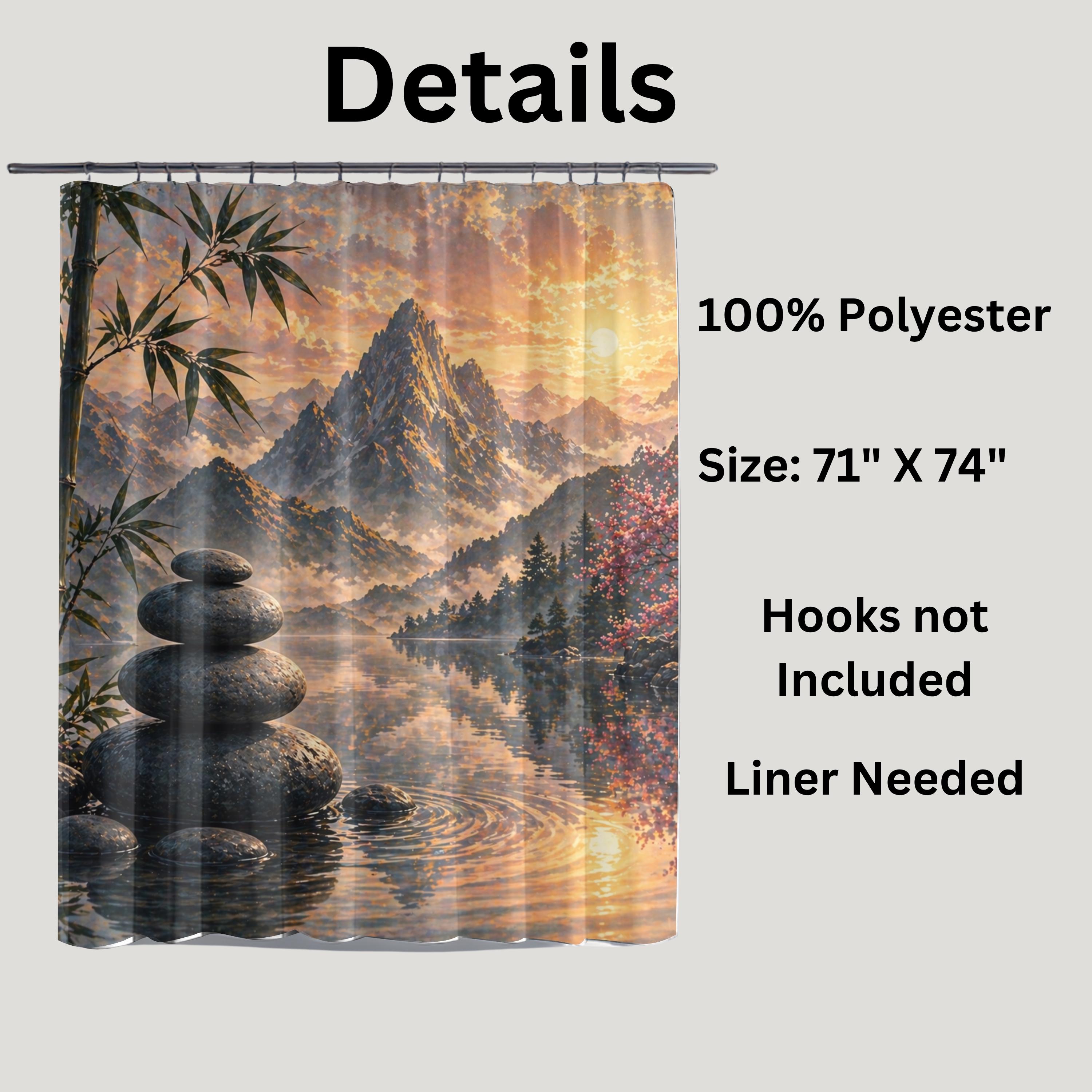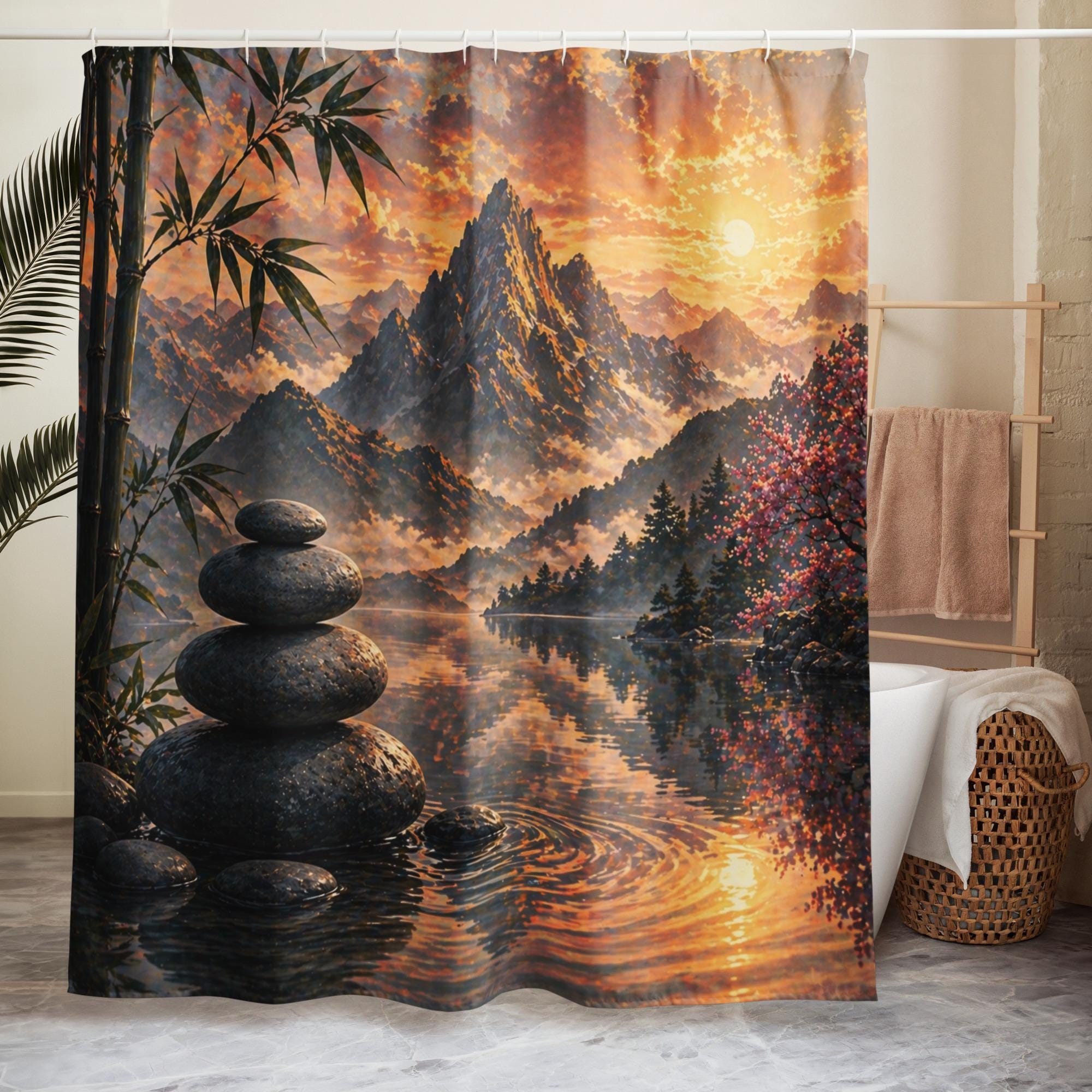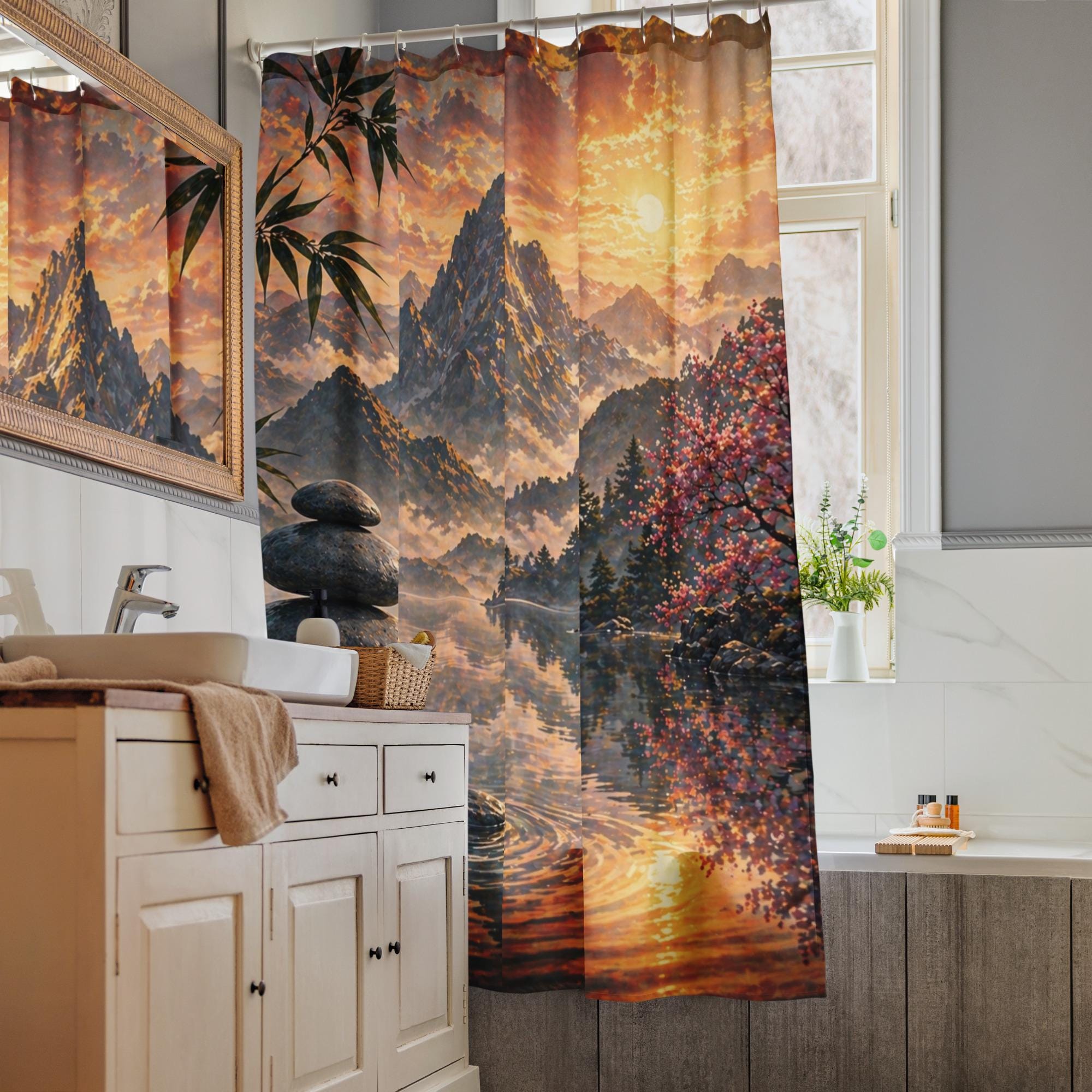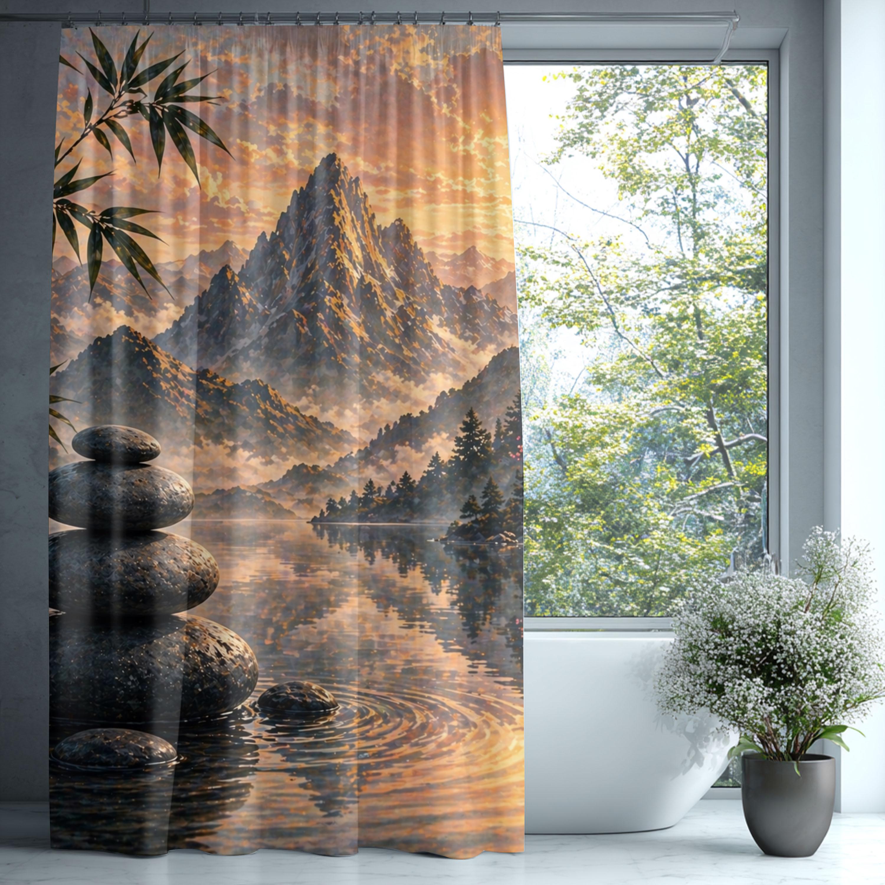 Transform your bathroom into a peaceful retreat with this zen mountain shower curtain, designed to bring calm, depth, and natural beauty into your space.
