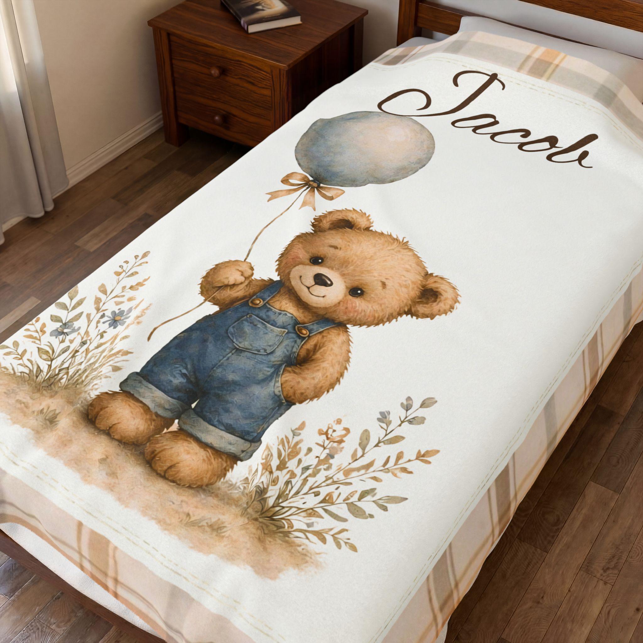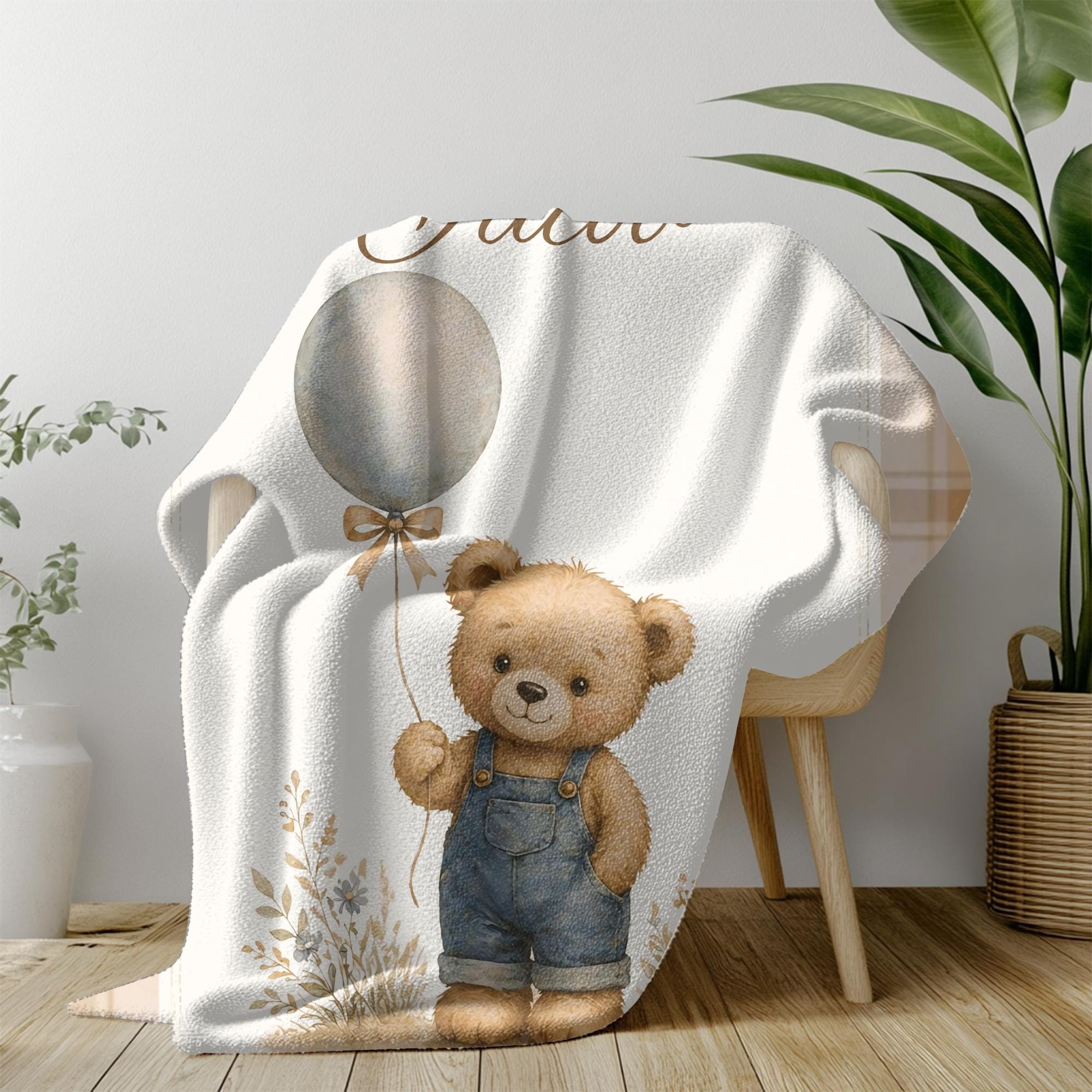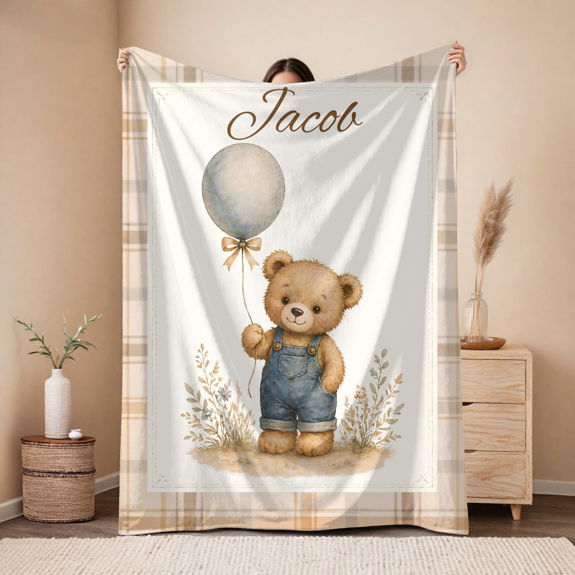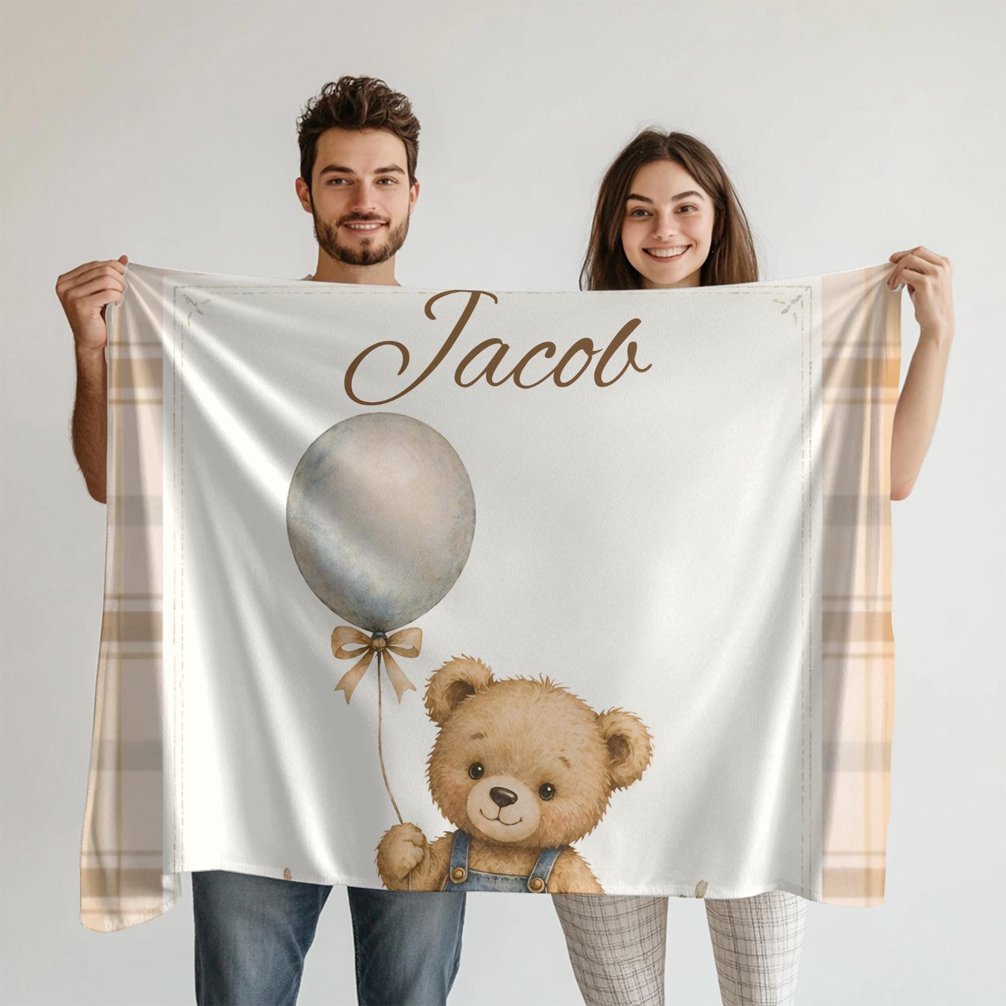 Create a sweet and timeless nursery with this personalized teddy bear balloon blanket. Featuring a soft vintage-inspired teddy holding a balloon, this design captures a gentle, nostalgic feel that parents and gift givers love.
