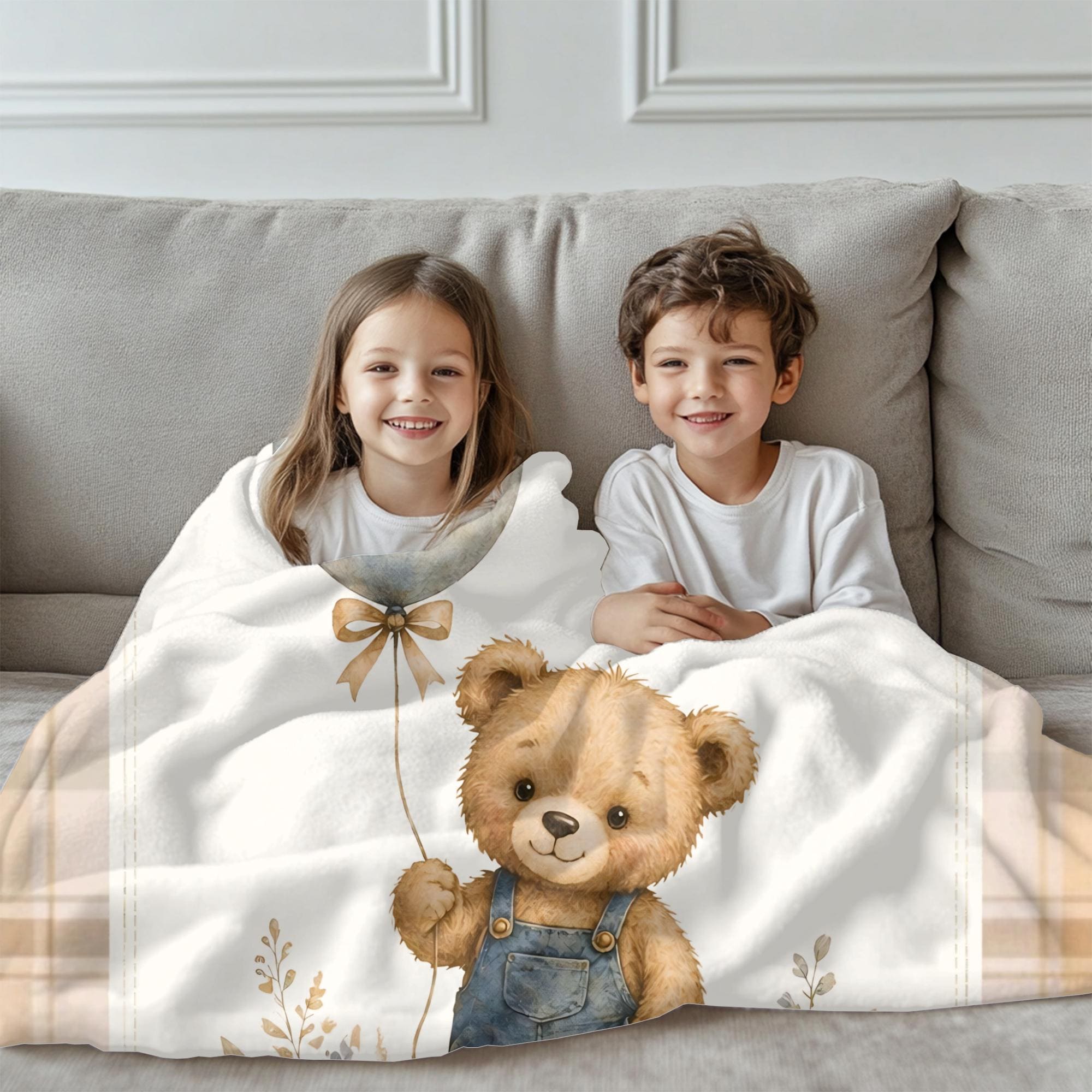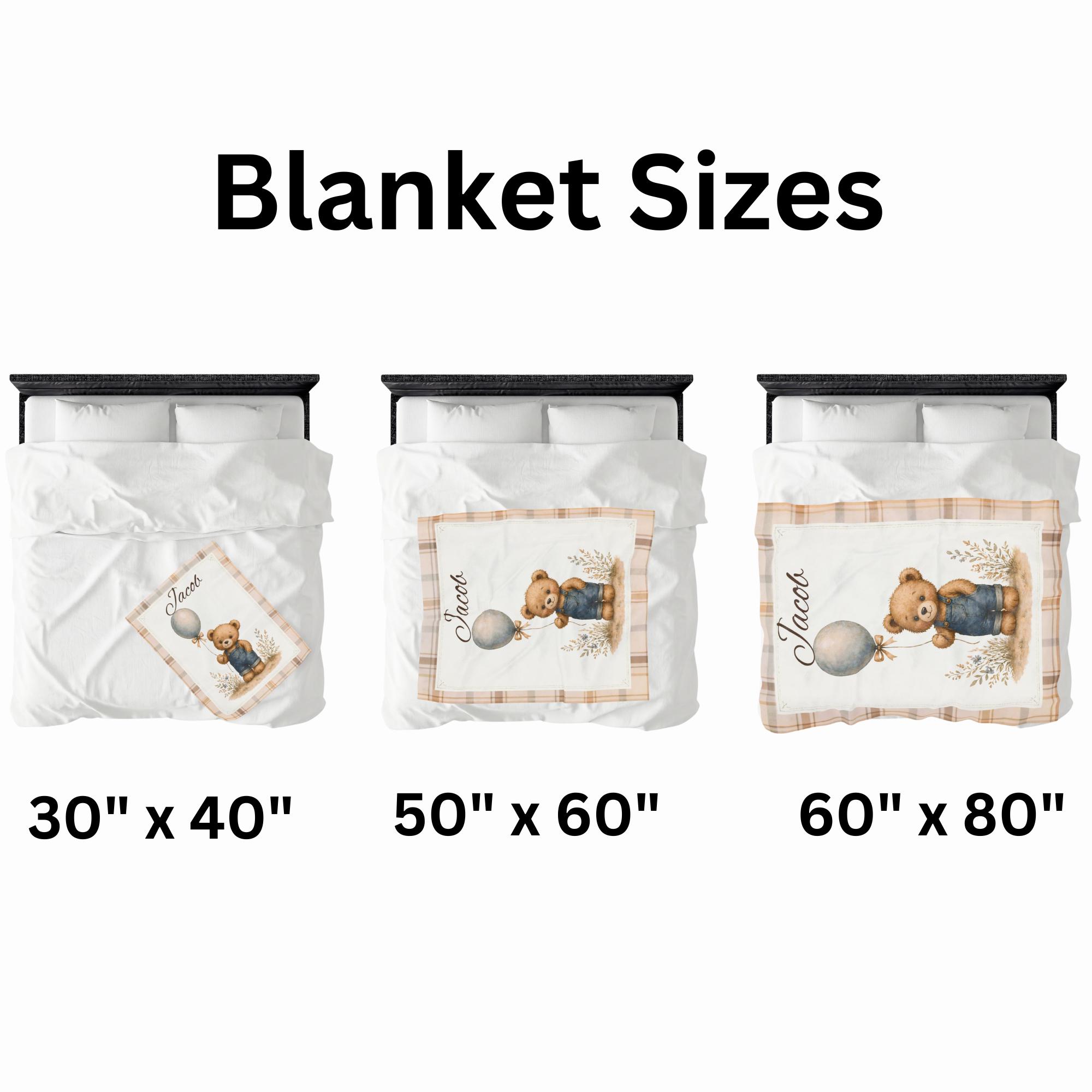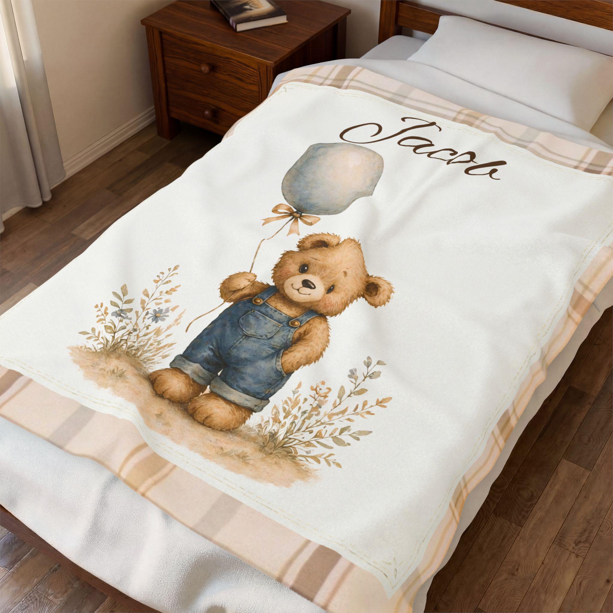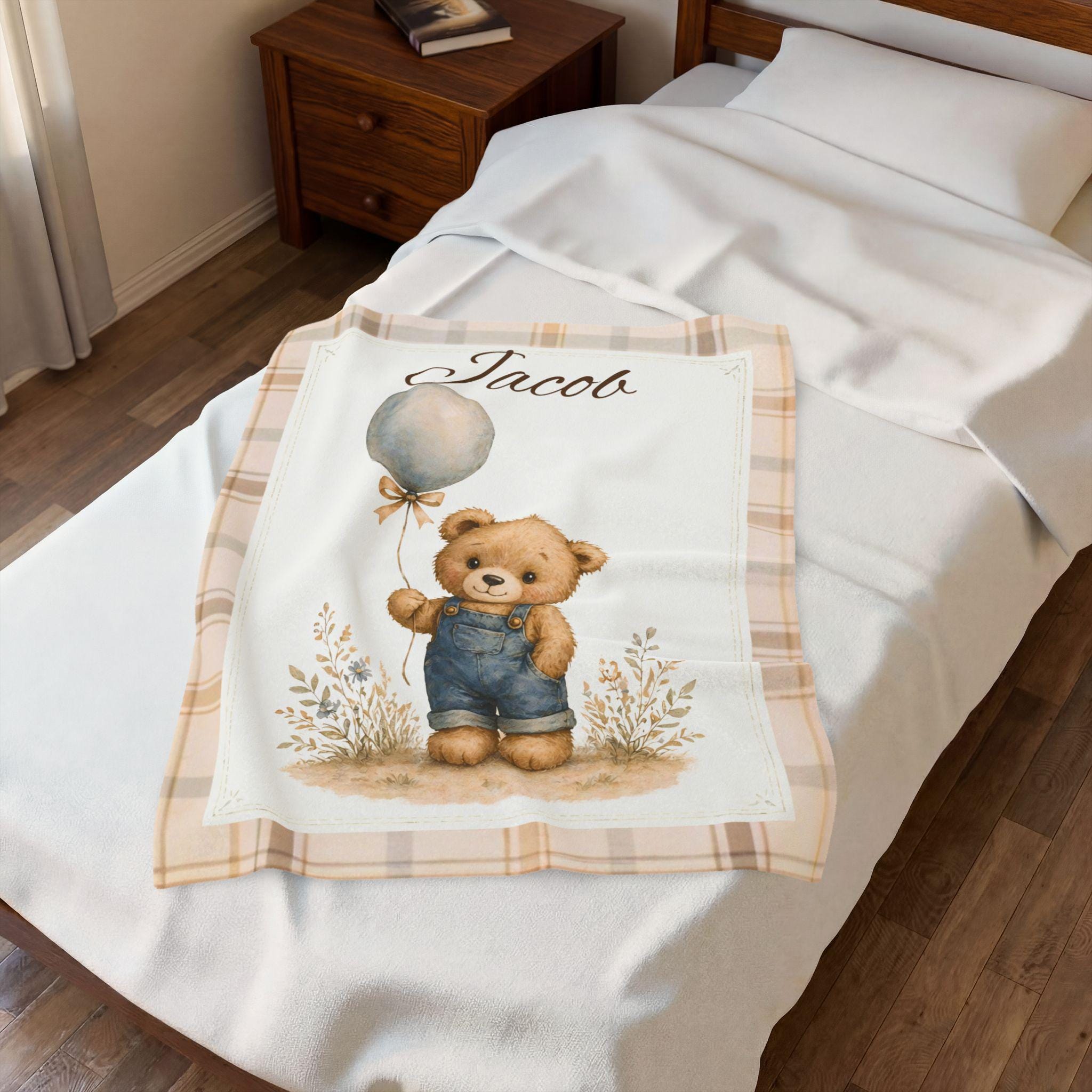 Create a sweet and timeless nursery with this personalized teddy bear balloon blanket. Featuring a soft vintage-inspired teddy holding a balloon, this design captures a gentle, nostalgic feel that parents and gift givers love.
