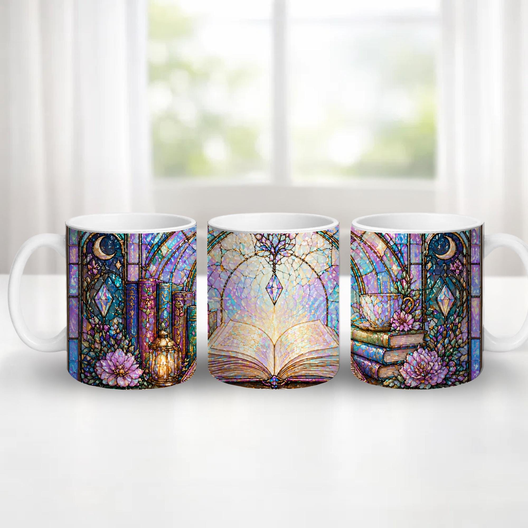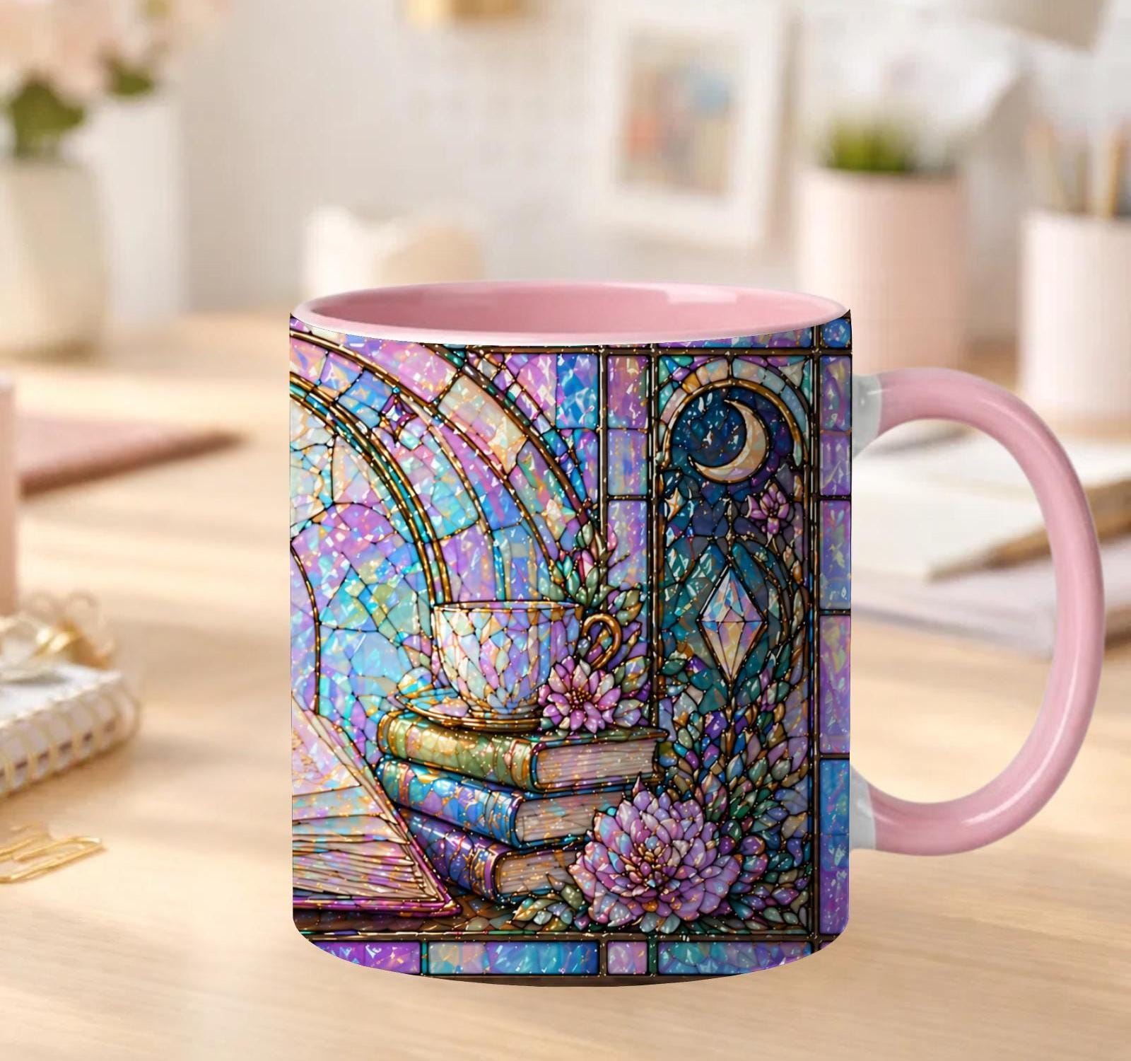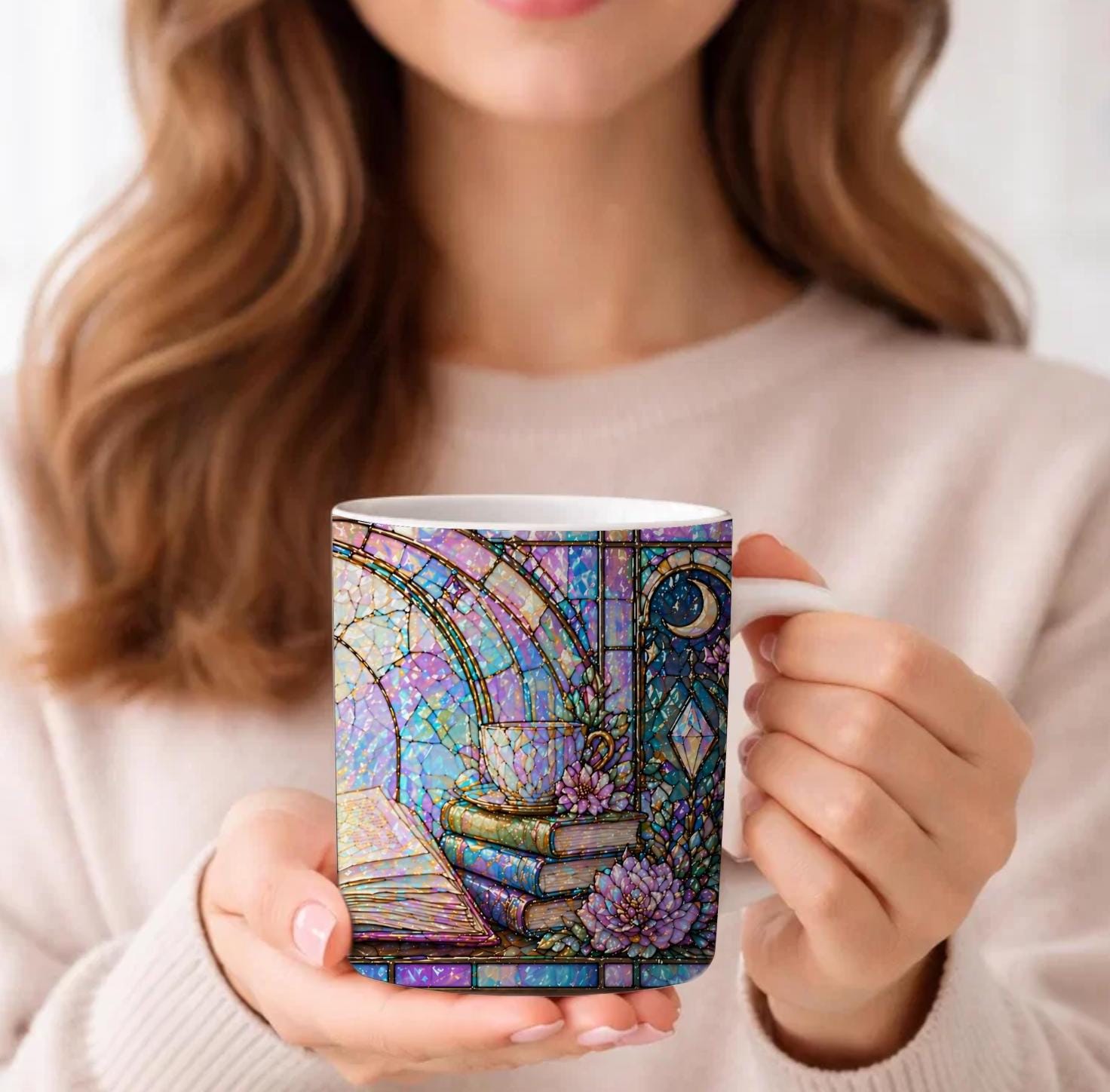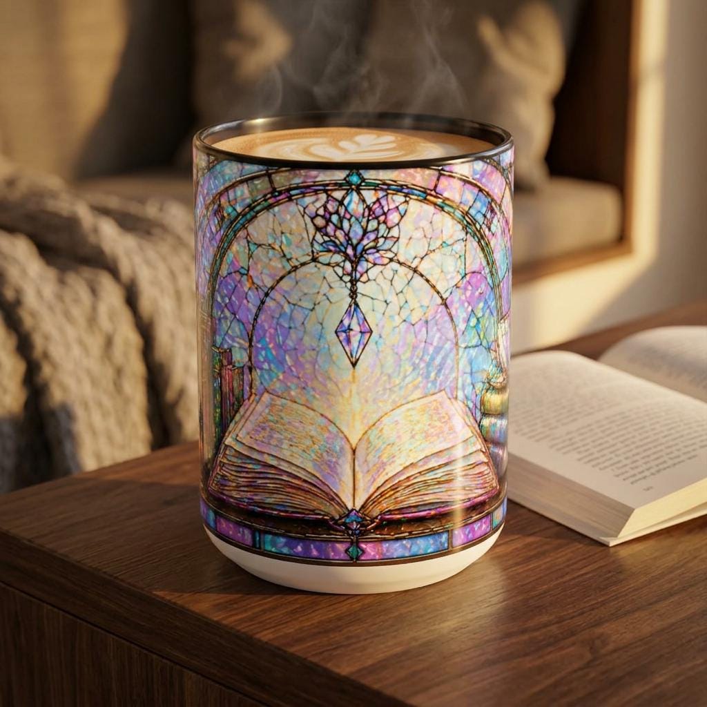 This mug was designed to bring that feeling into your everyday routine. The glowing open book and soft stained glass details create a gentle, almost magical light—like the moment a story comes to life.