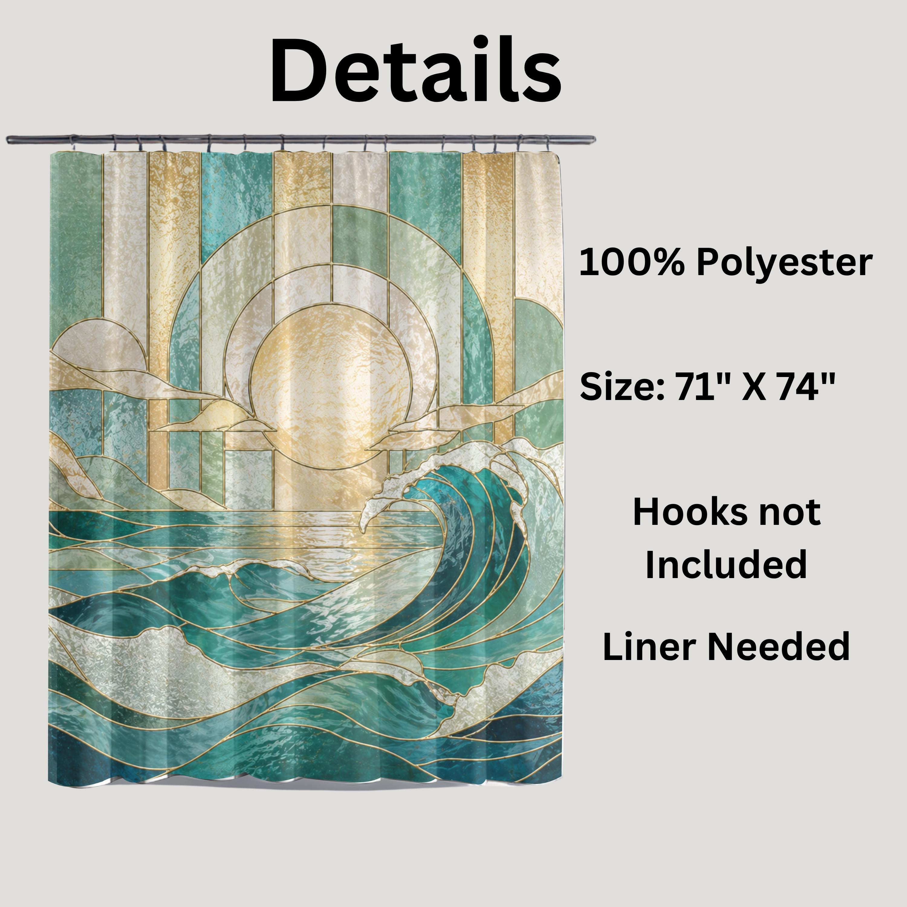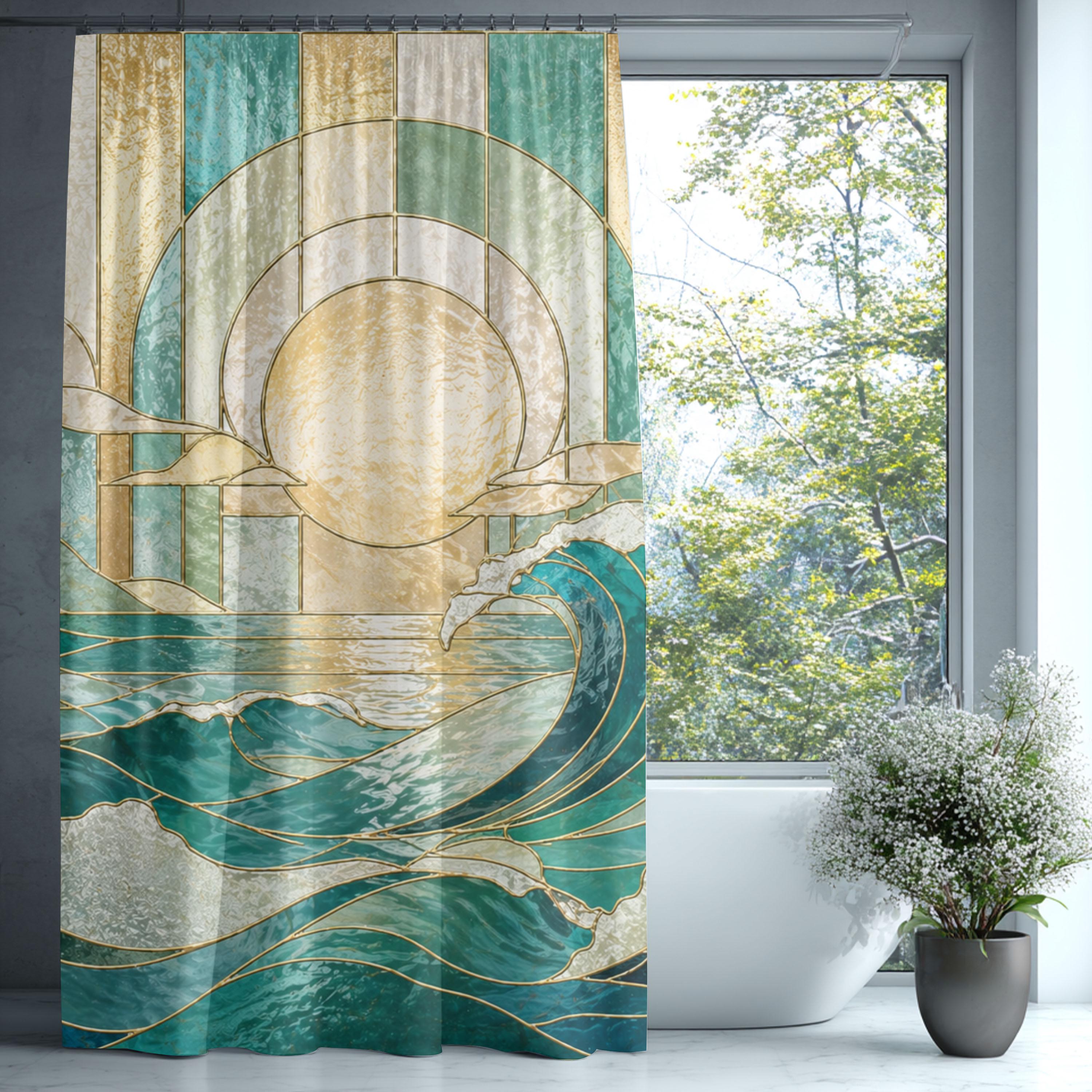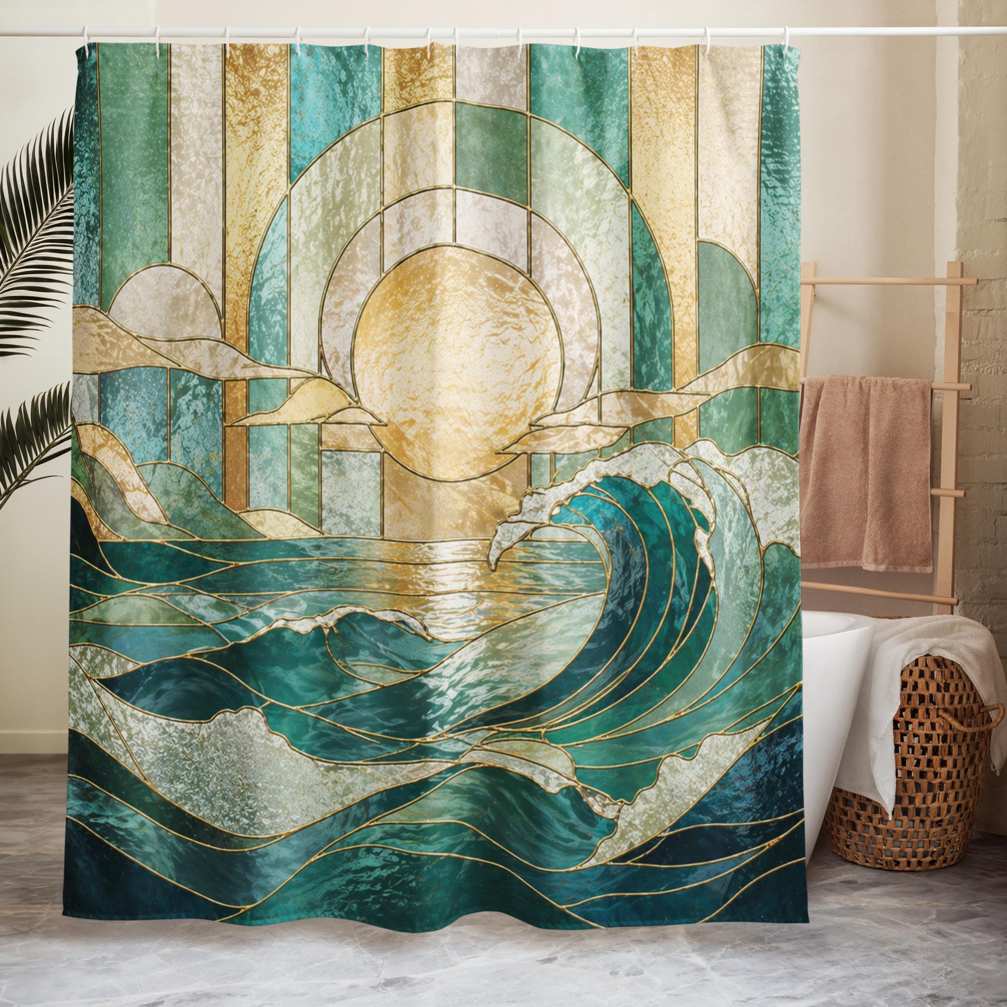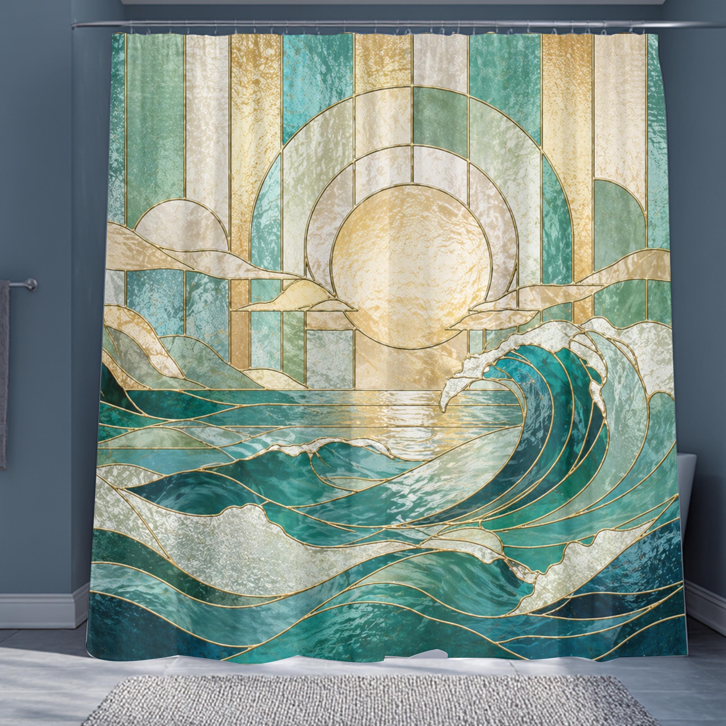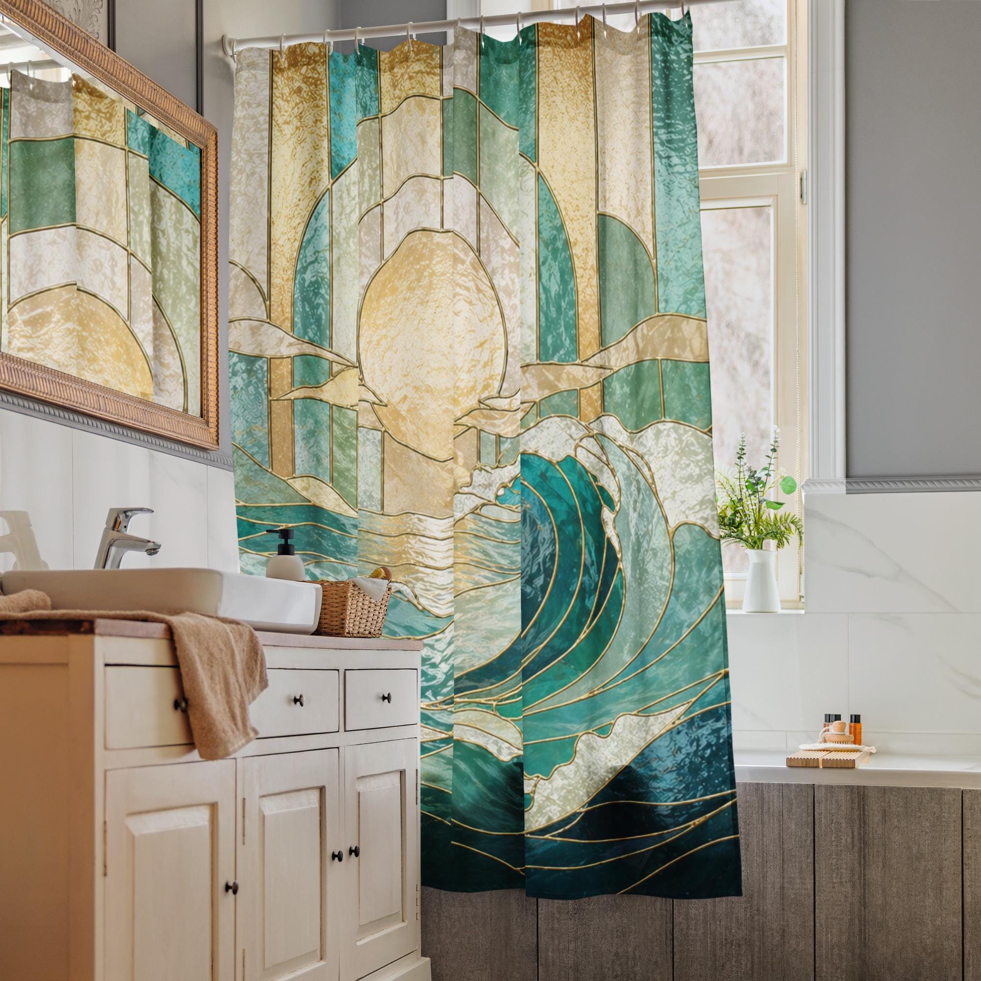 Featuring a dramatic ocean wave set against a glowing sun, this design blends rich teal tones with warm neutrals and gold accents to create a piece that feels both powerful and calming. The stained glass style adds structure and depth, while the flowing water draws the eye, making this more than just a shower curtain—it’s a statement piece for your bathroom.