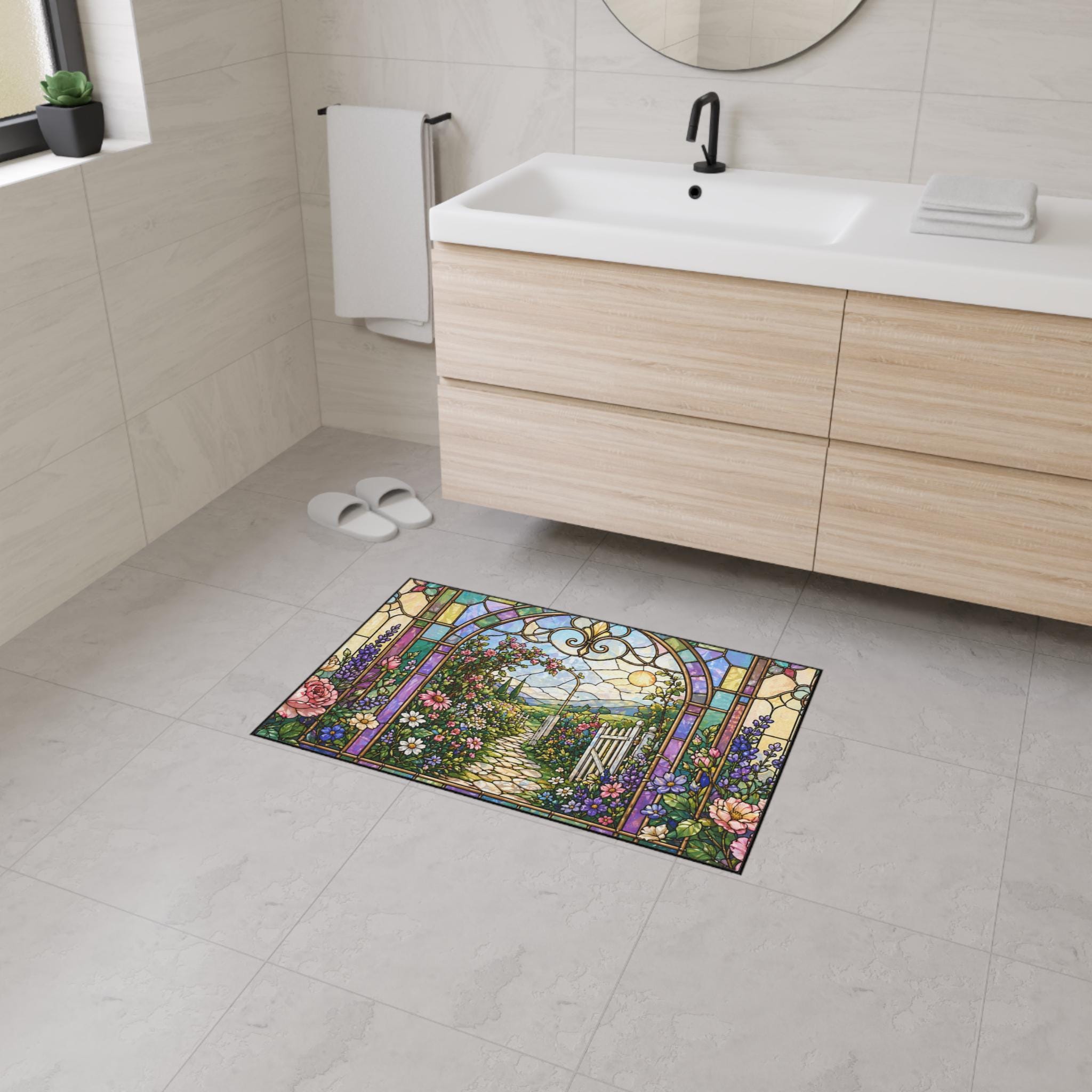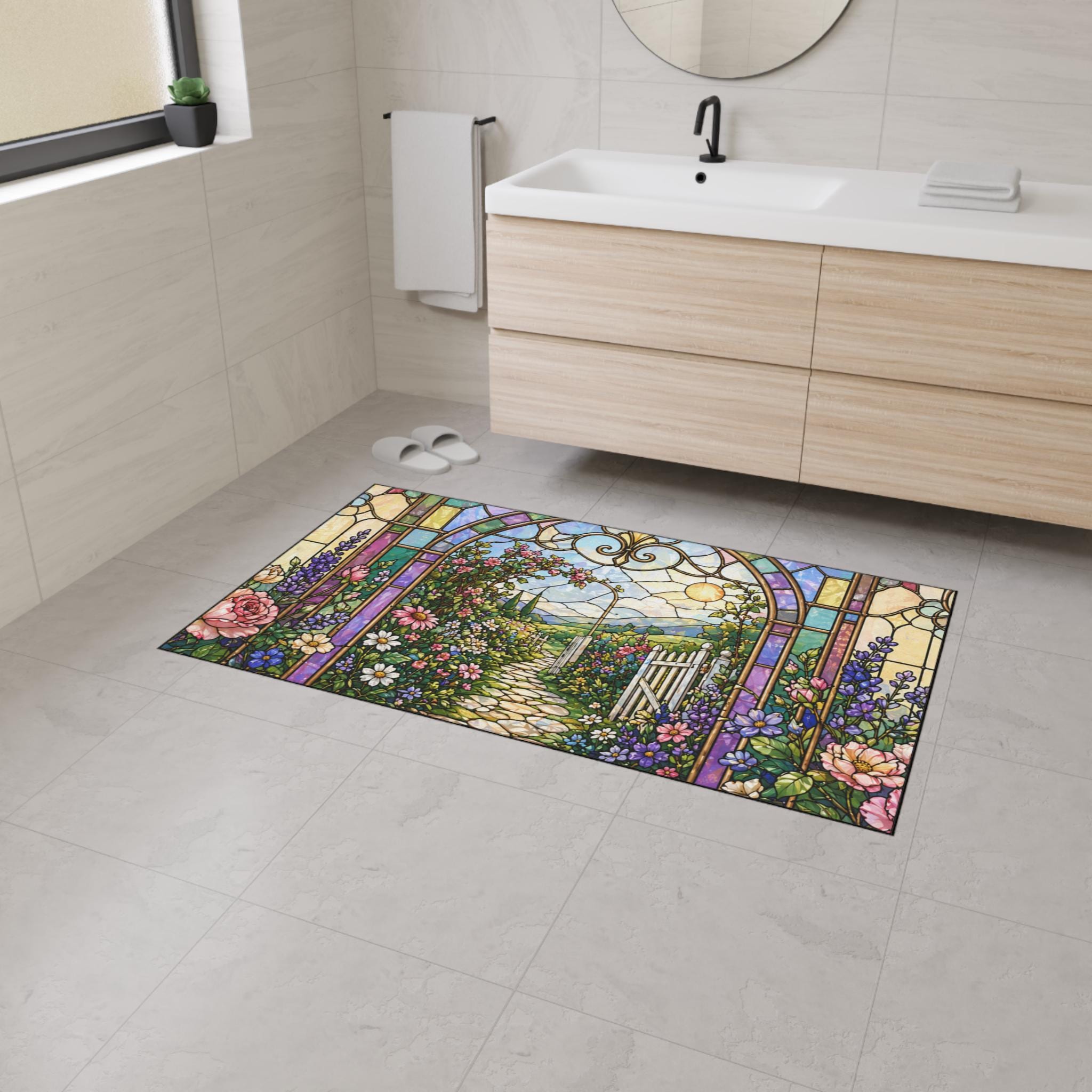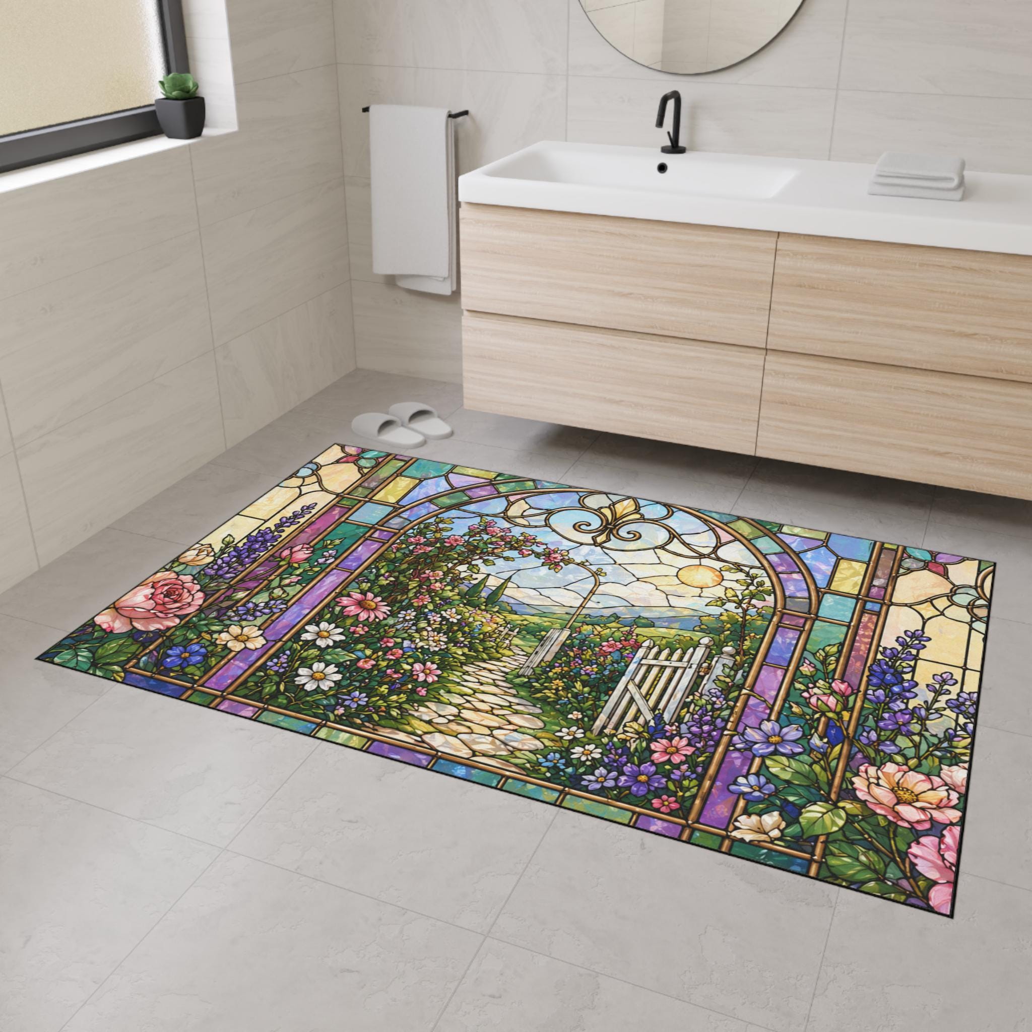 Bring the charm of a blooming garden into your space with this stained glass inspired bath mat.