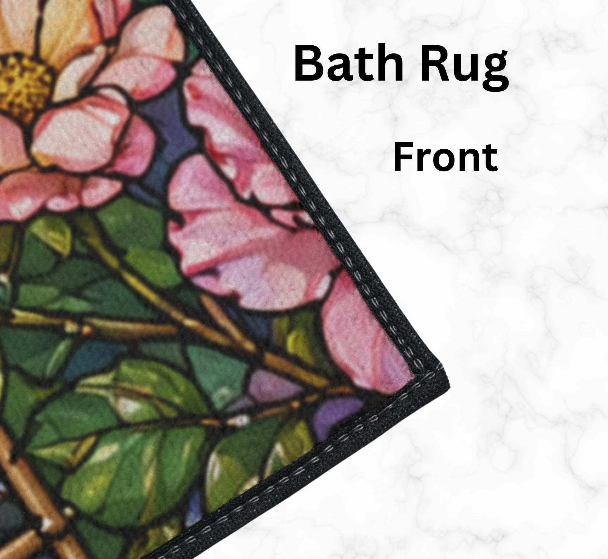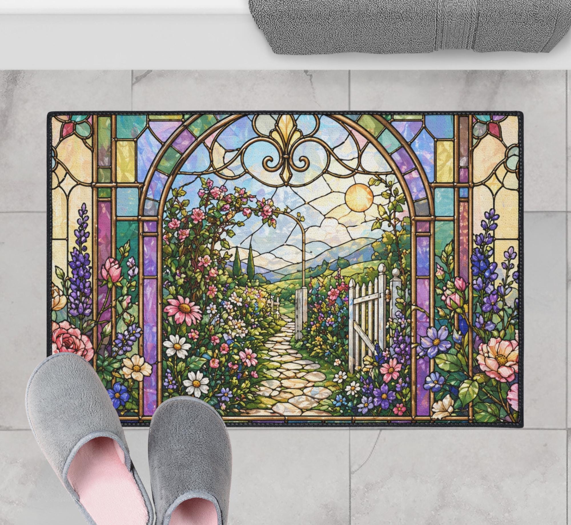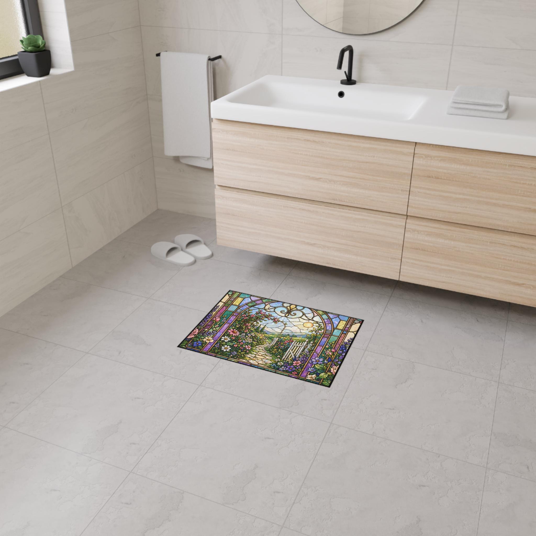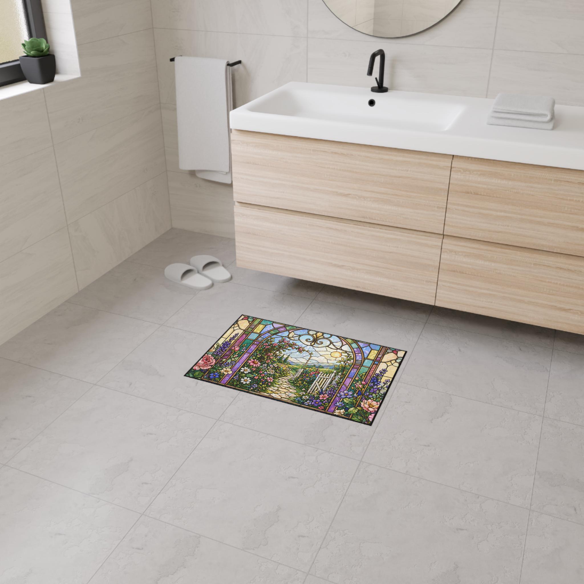 Bring the charm of a blooming garden into your space with this stained glass inspired bath mat.