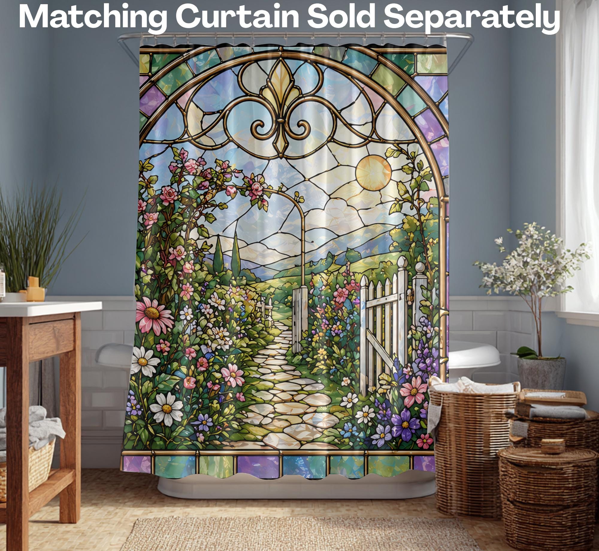 Featuring a peaceful garden path framed by vibrant flowers, a white gate, and soft rolling hills beyond, this design captures the warmth and beauty of a hidden garden retreat. The stained glass style adds depth and color, while the floral details create a cozy, inviting feel that instantly transforms your bathroom.