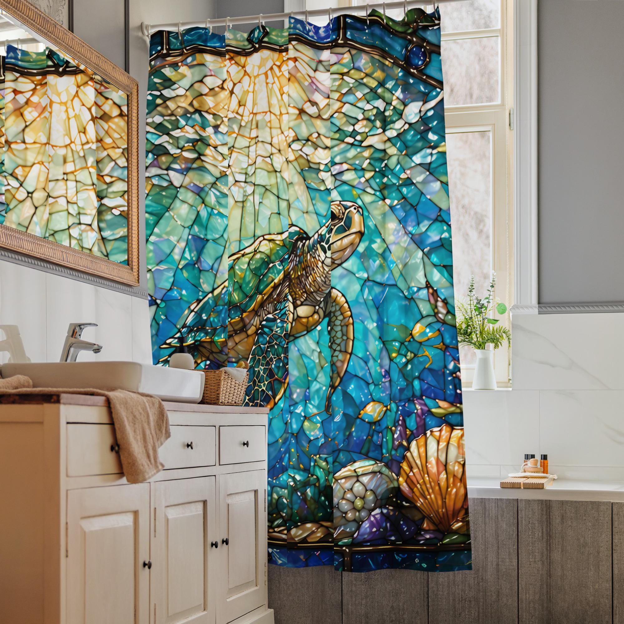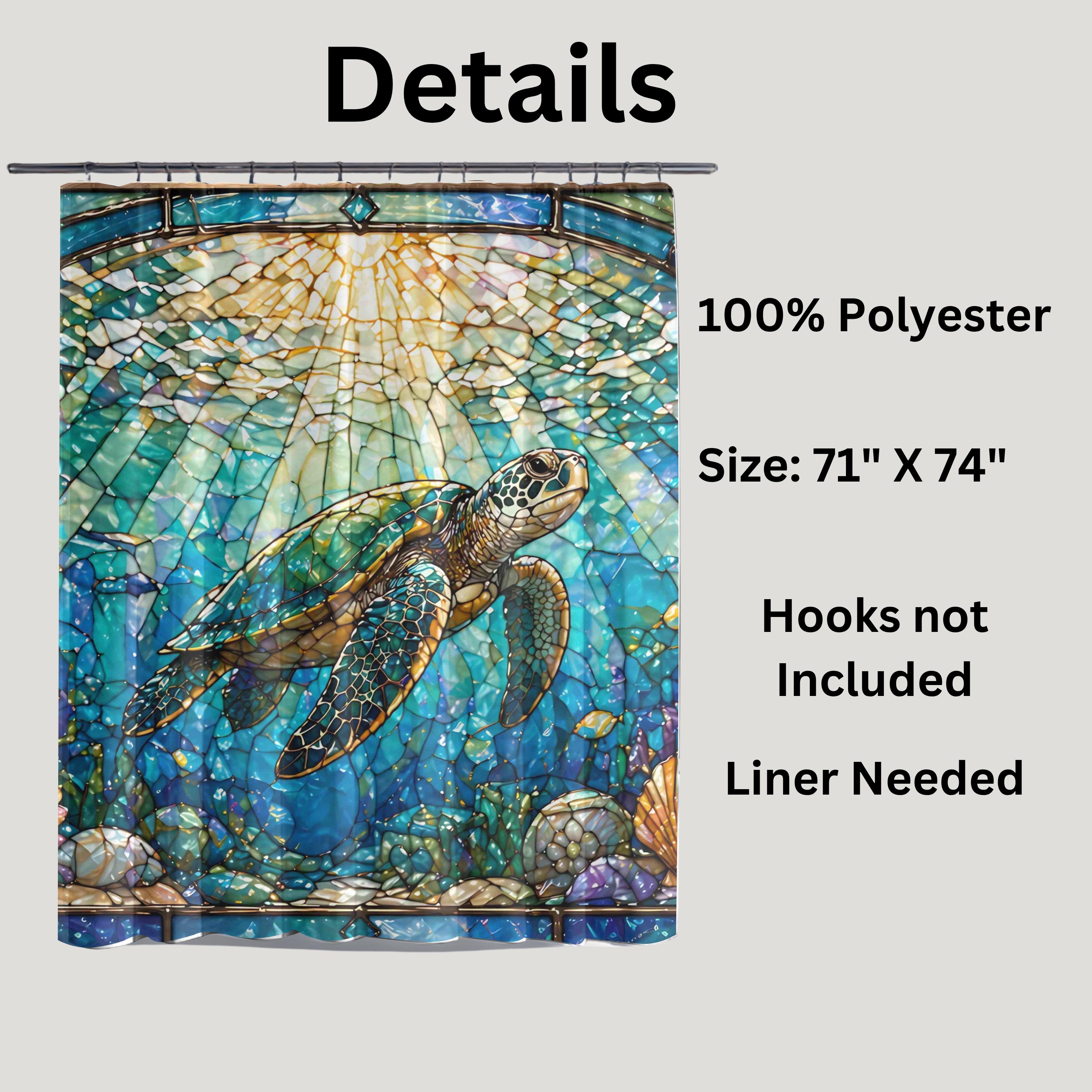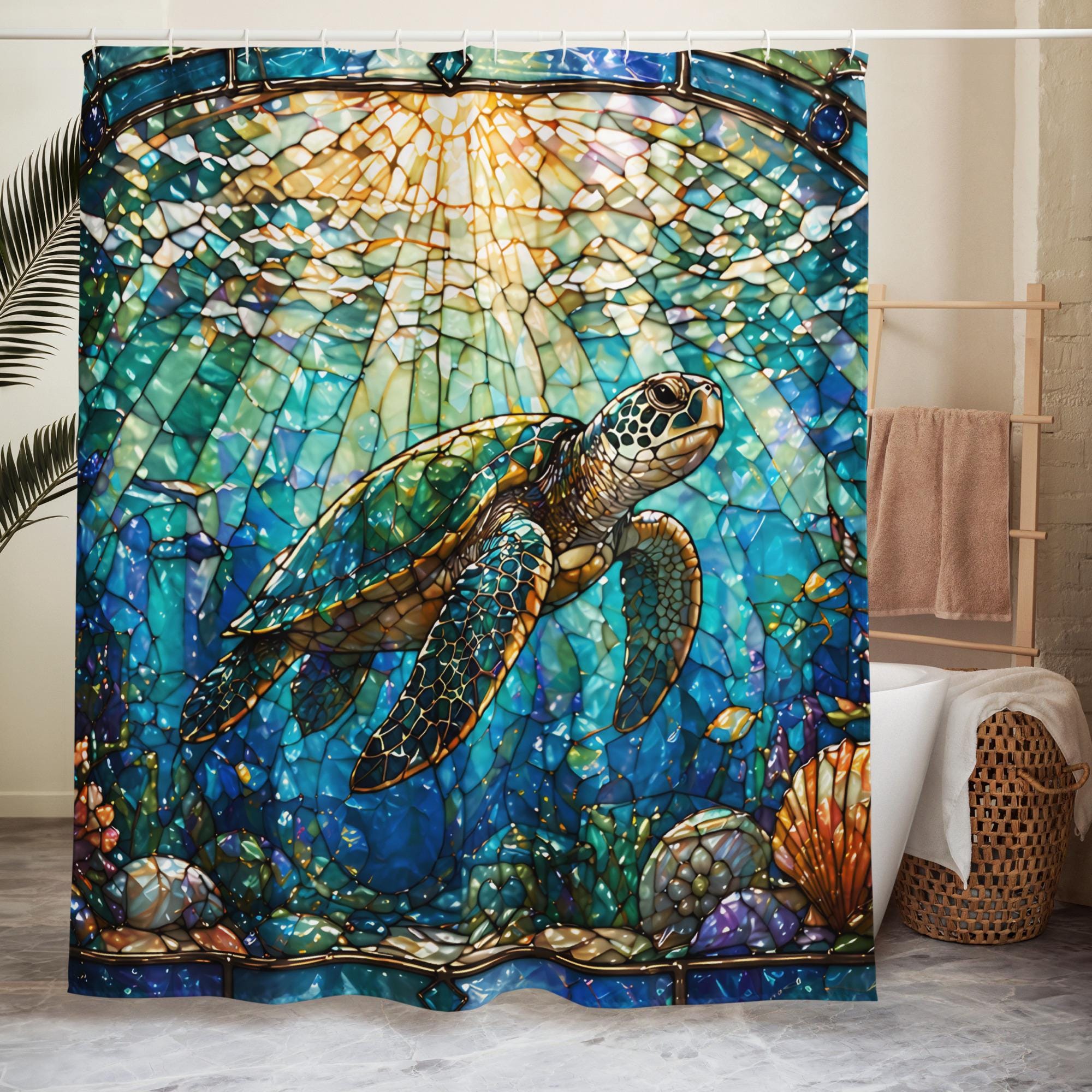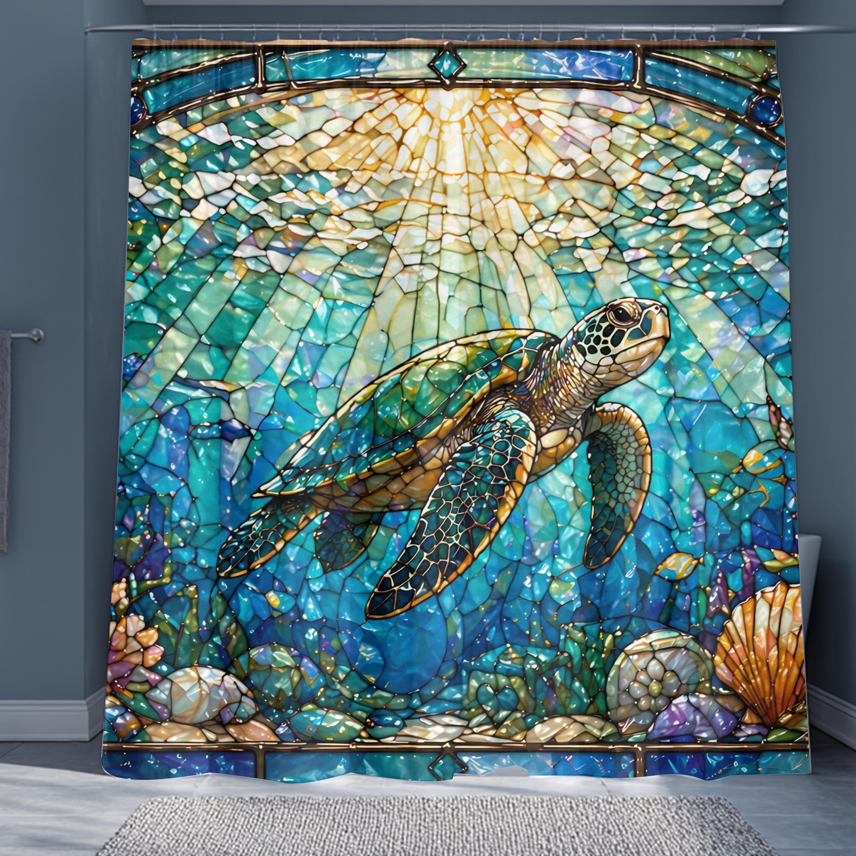 Bring the beauty of the ocean into your home with this stunning stained glass sea turtle shower curtain.