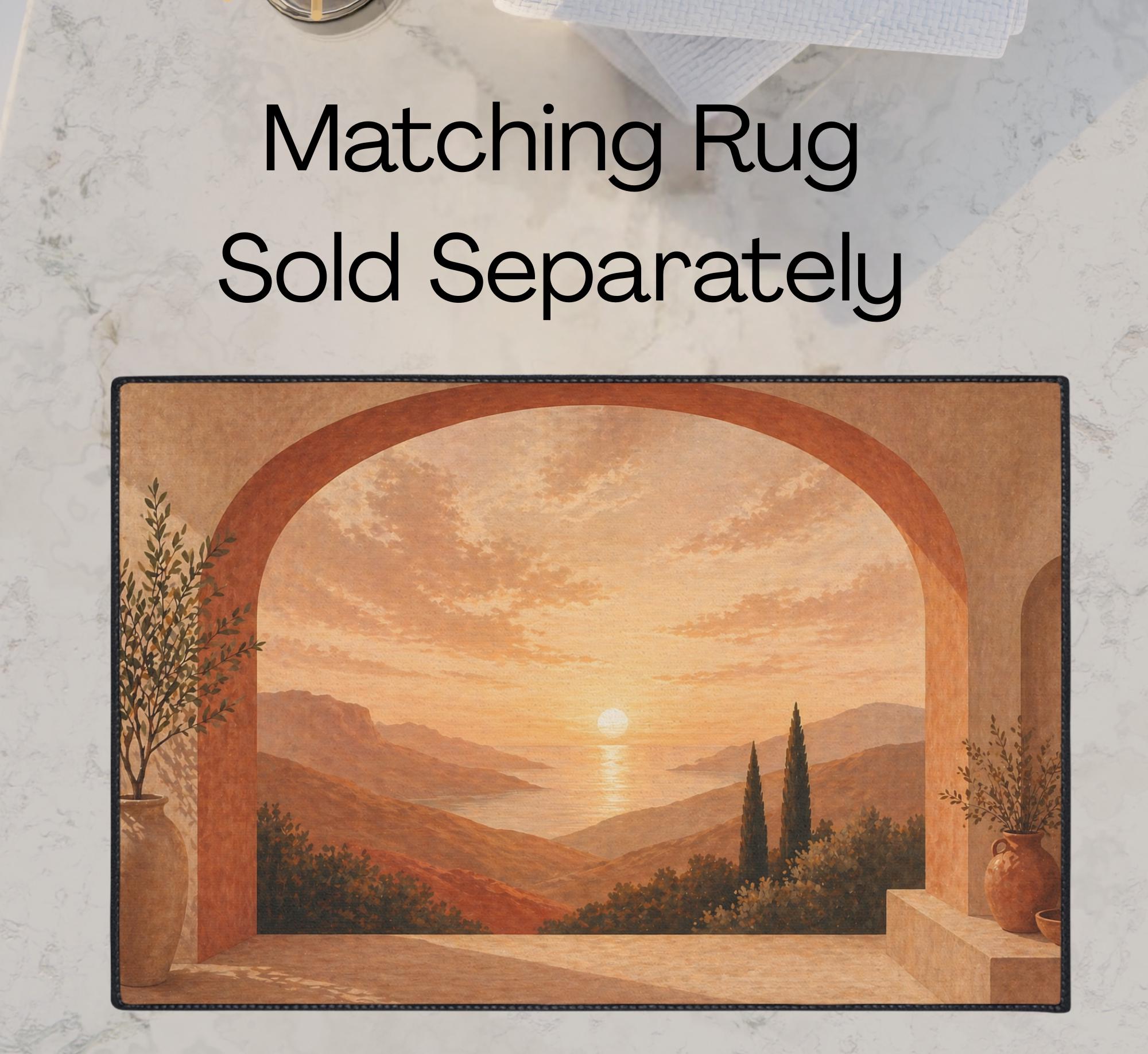 Framed by a rich clay-toned arch, this design draws you into a peaceful sunset scene overlooking soft rolling hills and glowing water. The warm earth tones and painterly texture create a sense of stillness and comfort, transforming your bathroom into a space that feels grounded, inviting, and intentionally styled.